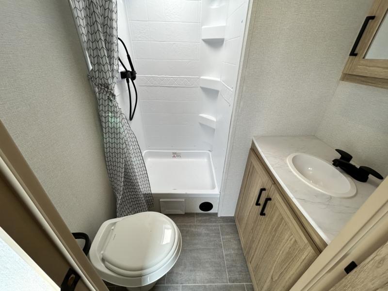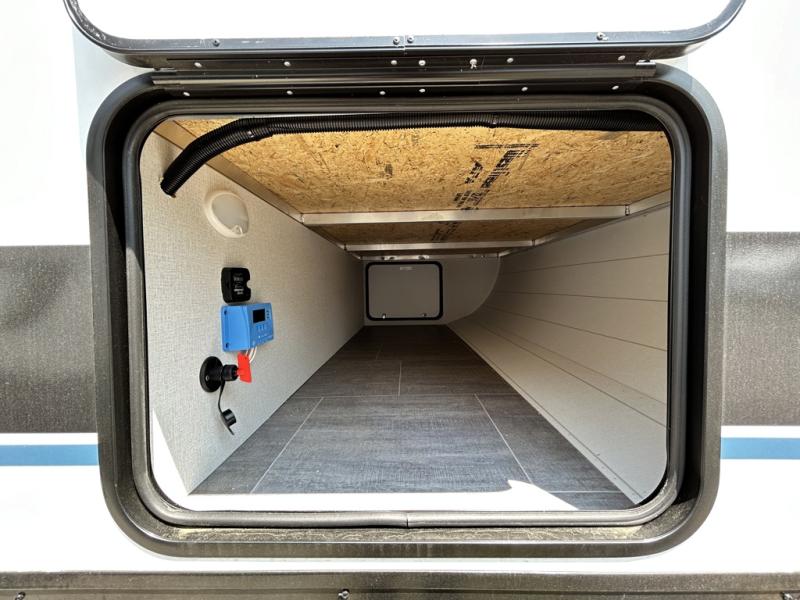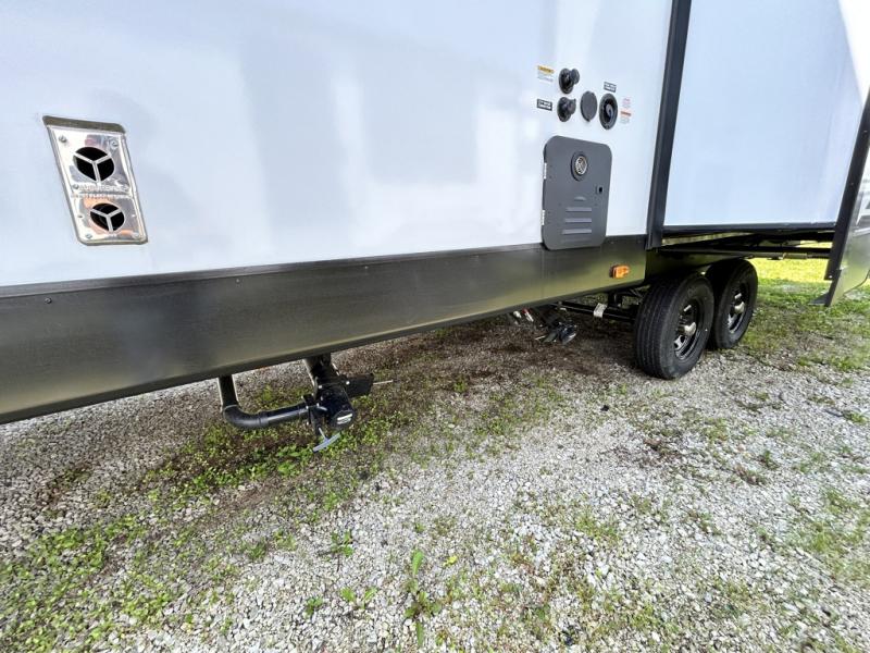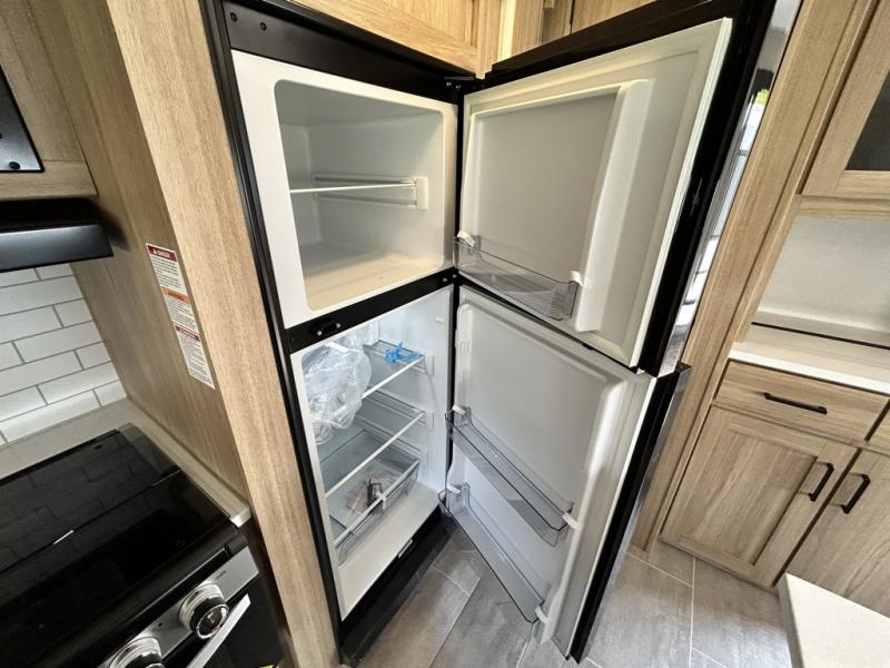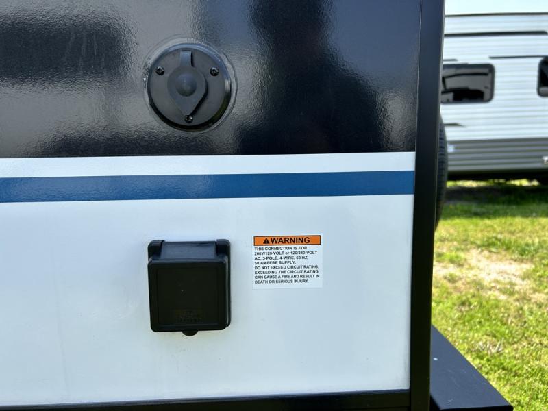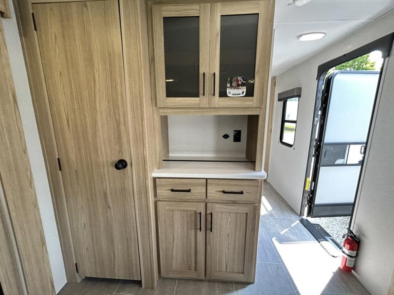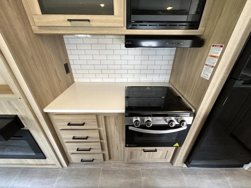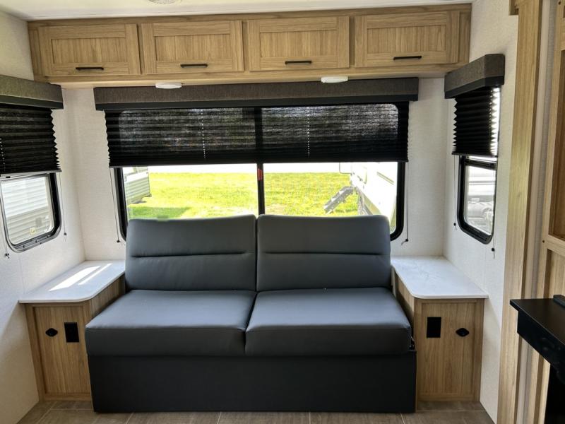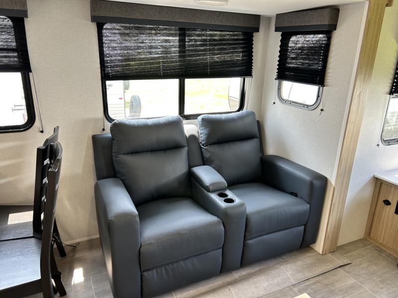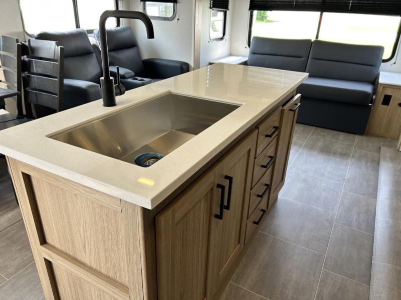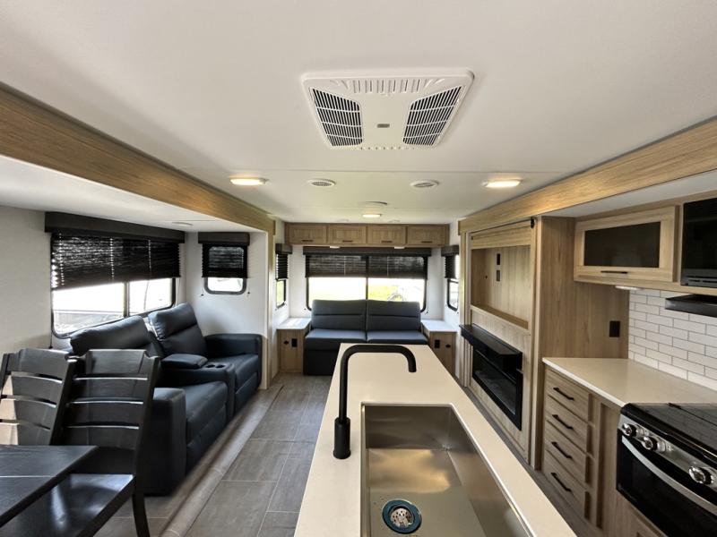 This spacious and inviting travel trailer is perfect for four campers. There is a front private bedroom with a queen bed, dual wardrobes, plus a third wardrobe with washer and dryer prep if you choose to add those appliances. The chef of your group can make breakfast on the three burner cooktop, and there is additional counter space thanks to the kitchen island. You'll also find a pantry and overhead cabinets for storage plus TV prep and a fireplace with hidden storage for movies, games and more. Your crew can get comfy on the theater seating or rear sofa, and there is a free-standing table with chairs where you can dine at and play games!