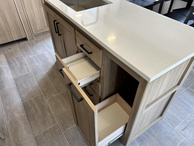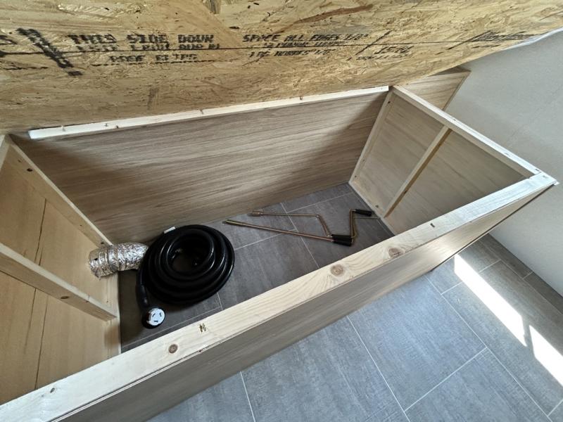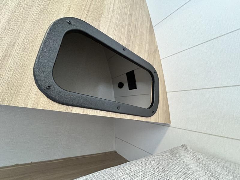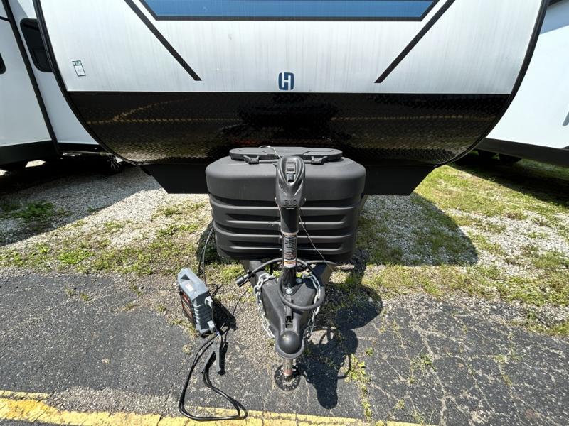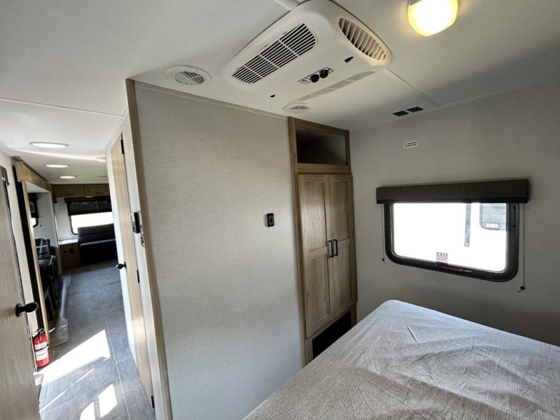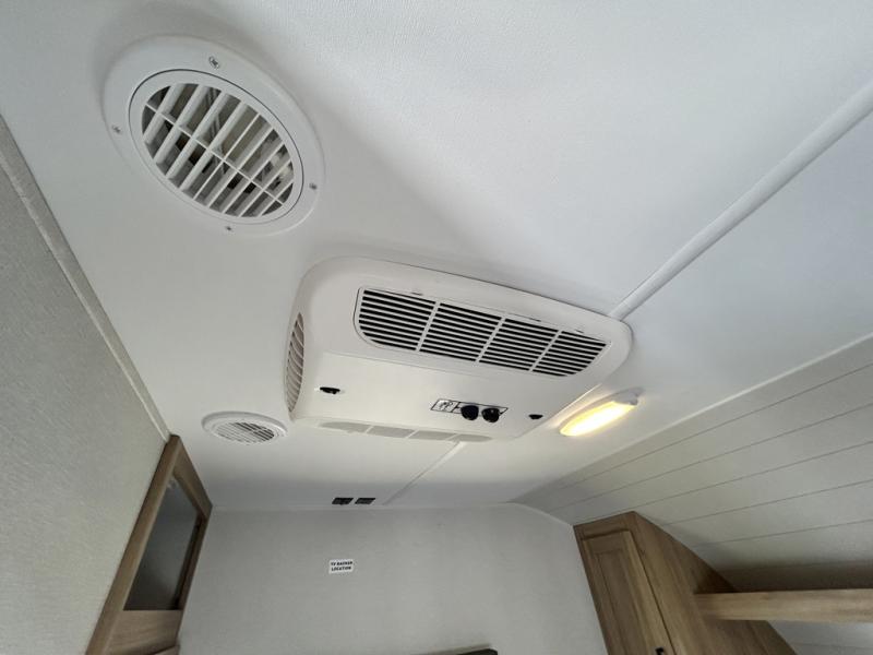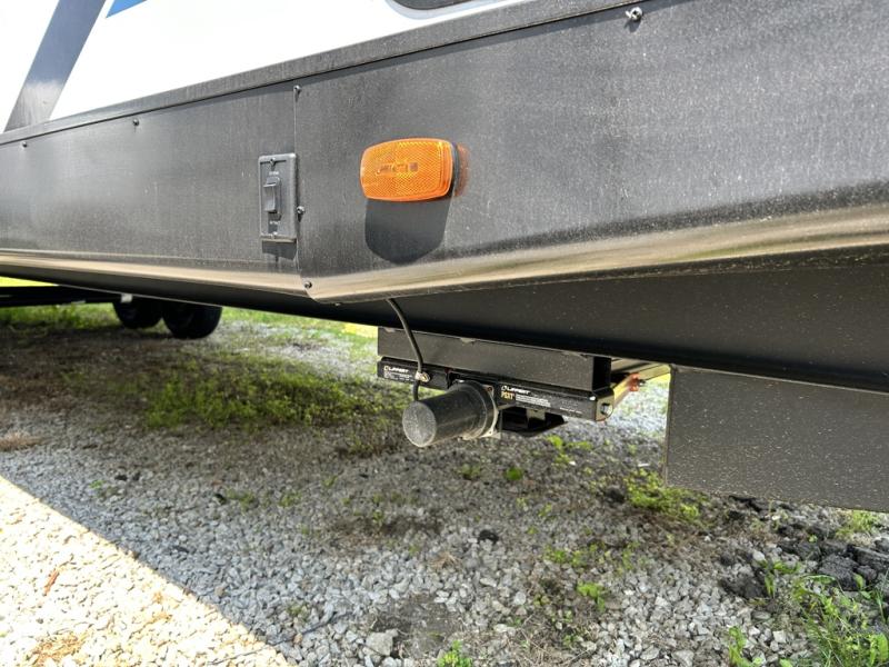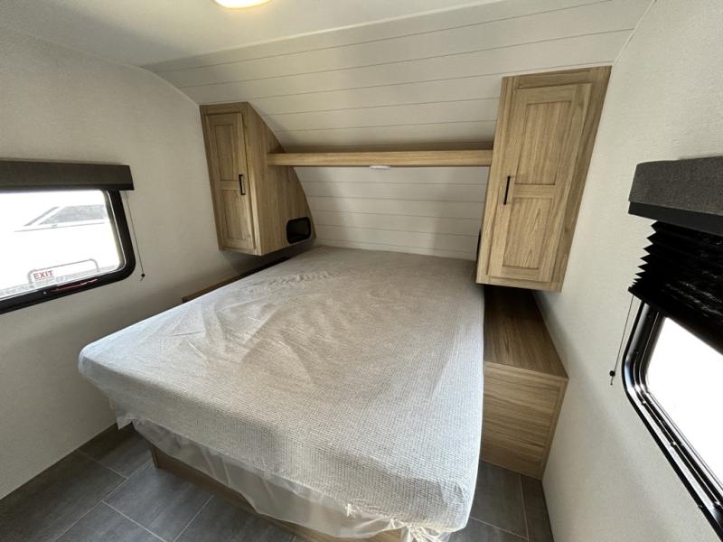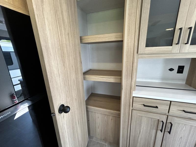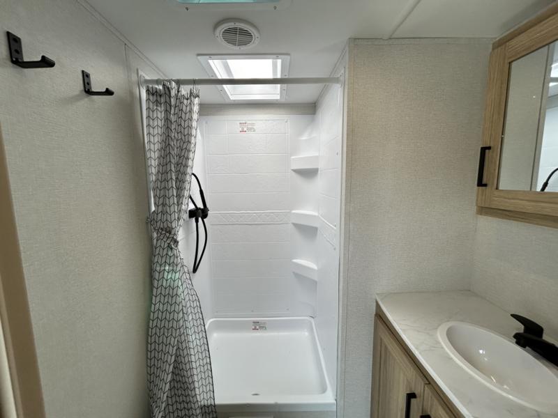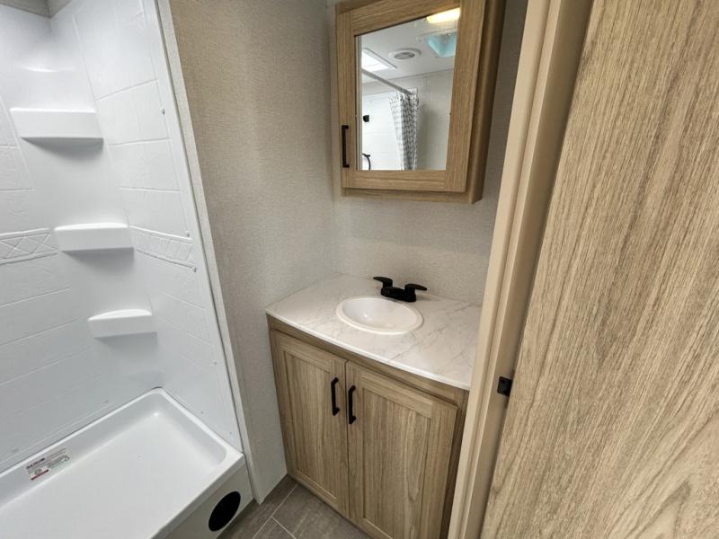 This spacious and inviting travel trailer is perfect for four campers. There is a front private bedroom with a queen bed, dual wardrobes, plus a third wardrobe with washer and dryer prep if you choose to add those appliances. The chef of your group can make breakfast on the three burner cooktop, and there is additional counter space thanks to the kitchen island. You'll also find a pantry and overhead cabinets for storage plus TV prep and a fireplace with hidden storage for movies, games and more. Your crew can get comfy on the theater seating or rear sofa, and there is a free-standing table with chairs where you can dine at and play games!