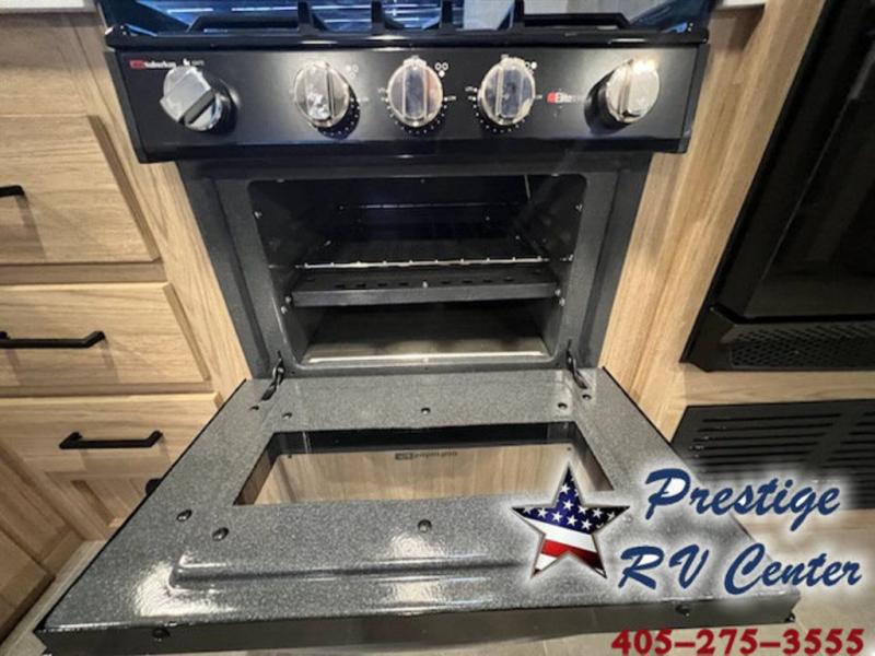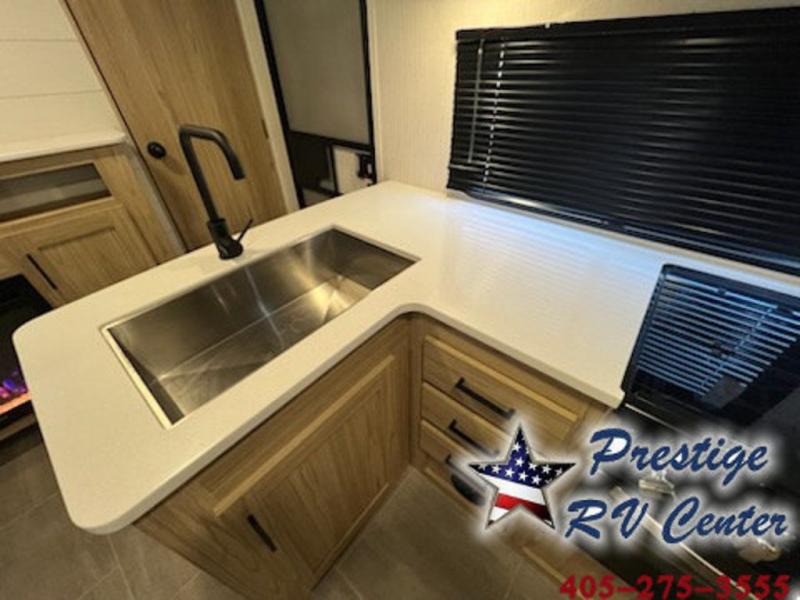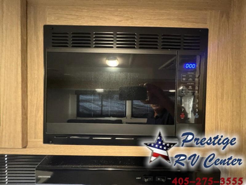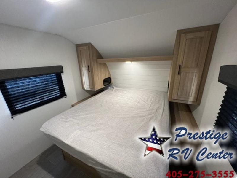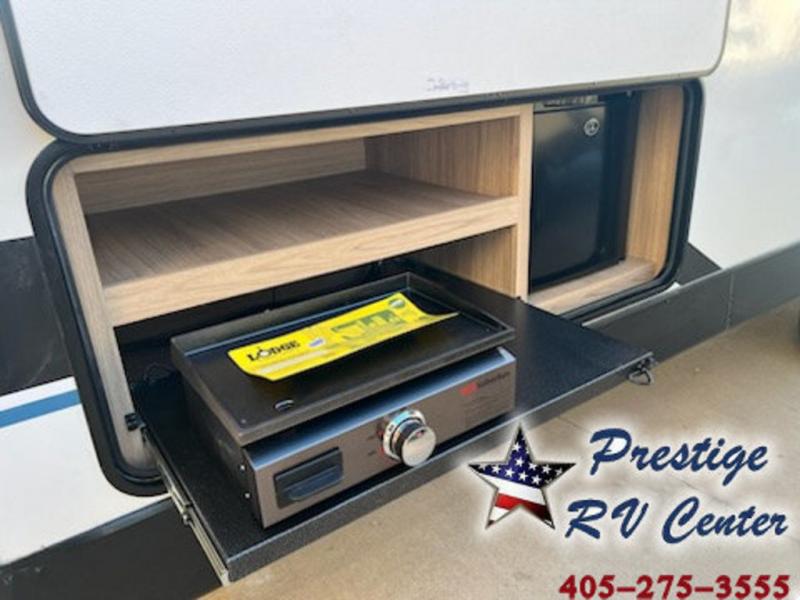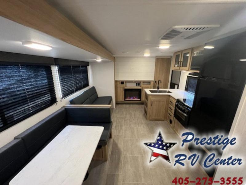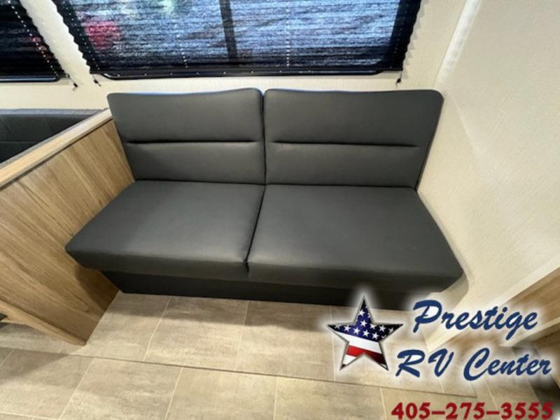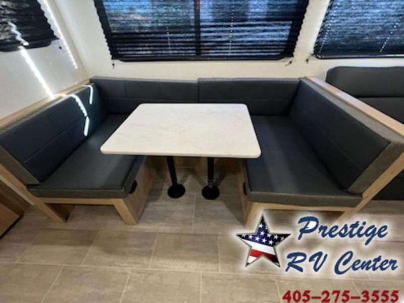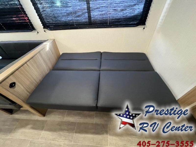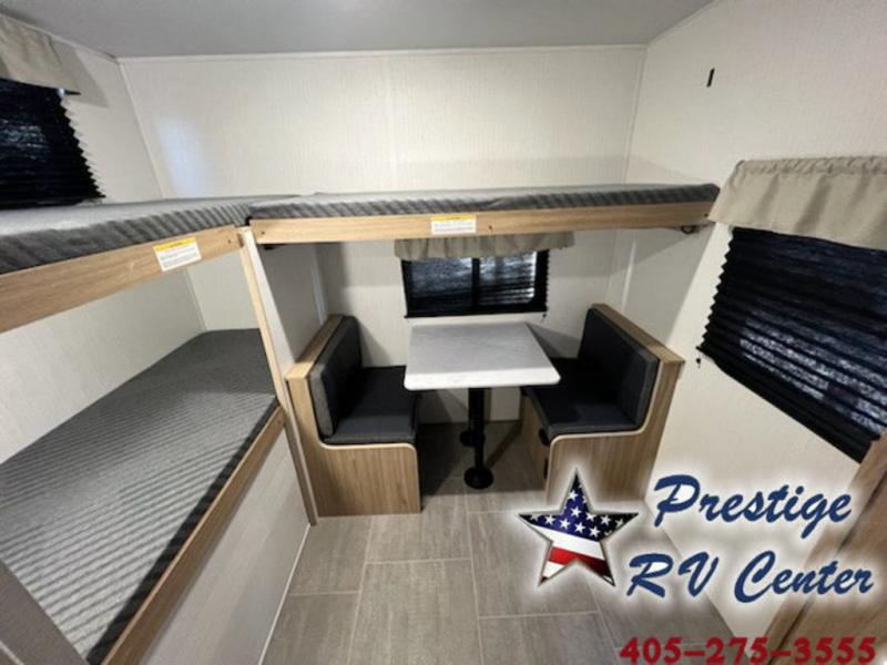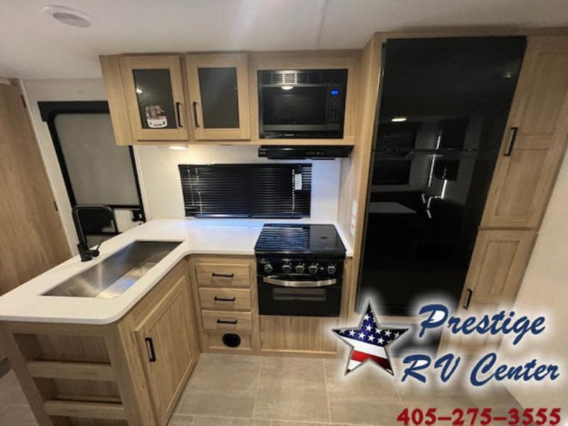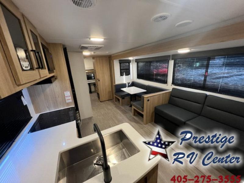 One look at this travel trailer and you'll be hooked! The front private bedroom with a queen bed provides a place for you to retreat to each night, and the full bath will let you freshen up in the morning. The little ones or your guests will have the bunkhouse to themselves with bunk beds, a dinette with a flip-up bunk above, plus a wardrobe to keep this space tidy. A full kitchen, complete with a three burner cooktop, microwave oven, and farmhouse sink will be perfect for meal times, or you can head outdoors to cook on the exterior griddle. In the evening, you can relax on the sofa or play a game around the U-shaped dinette!