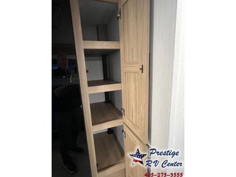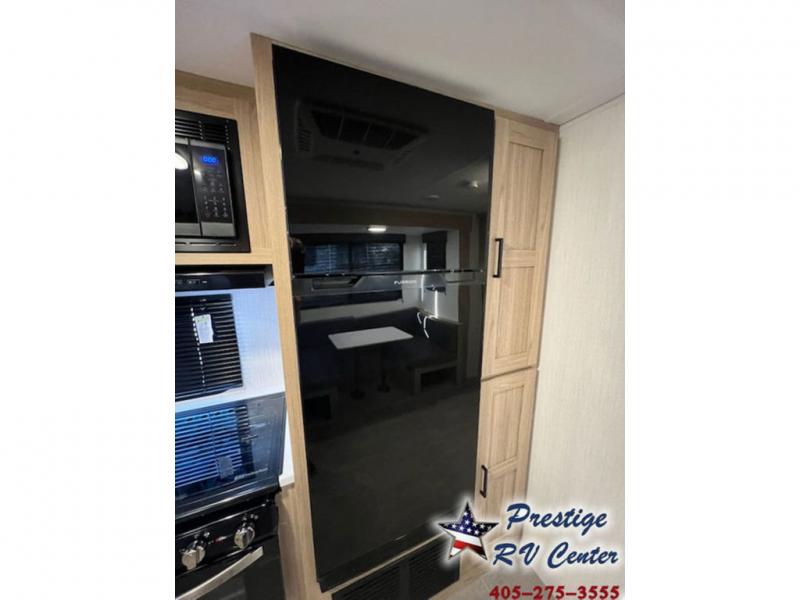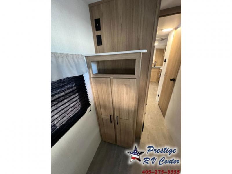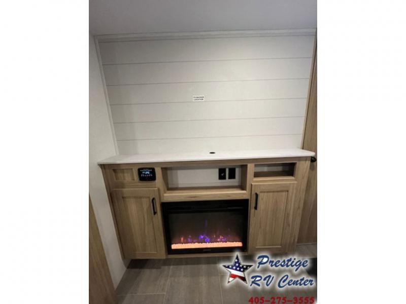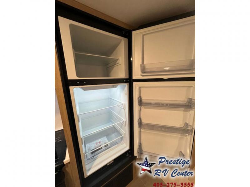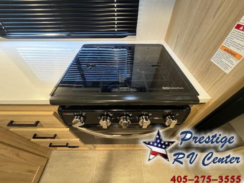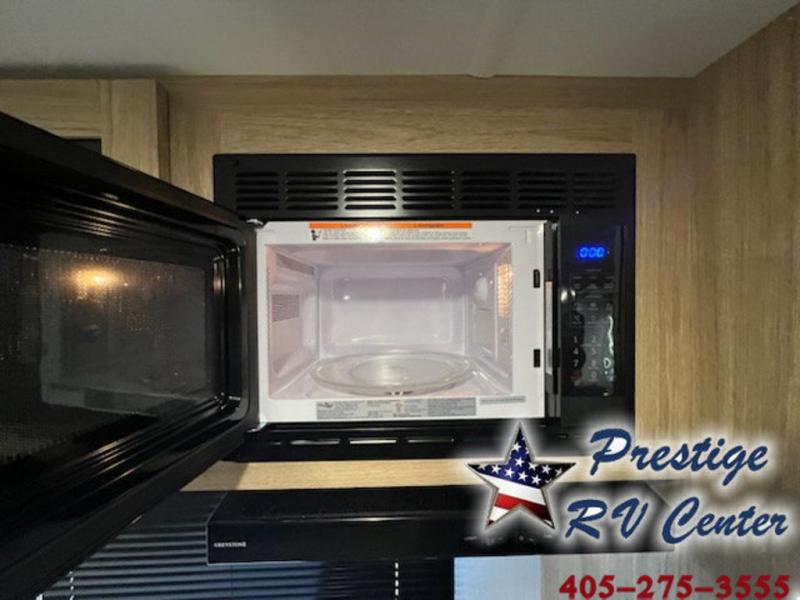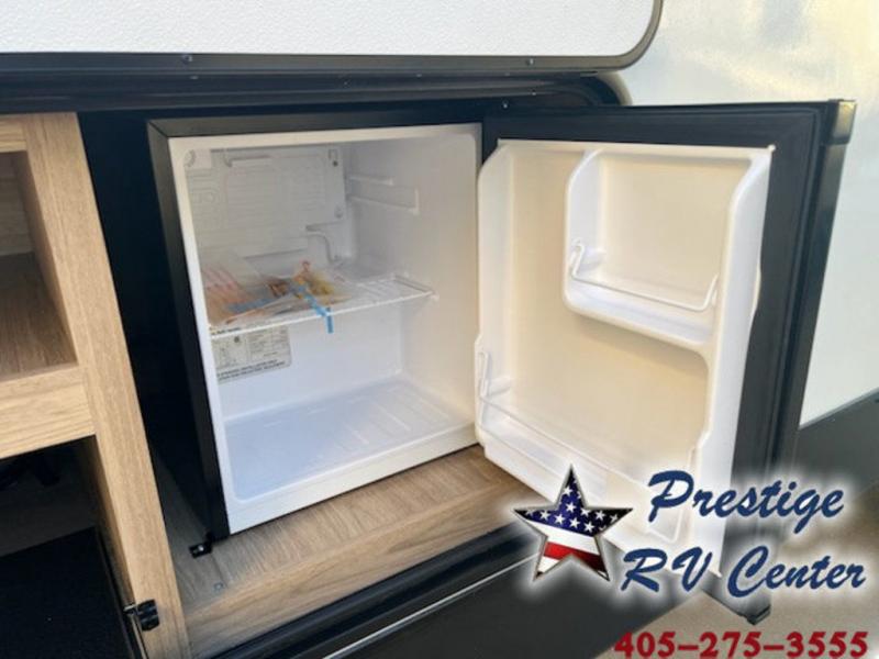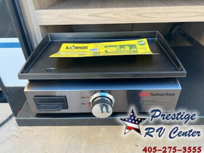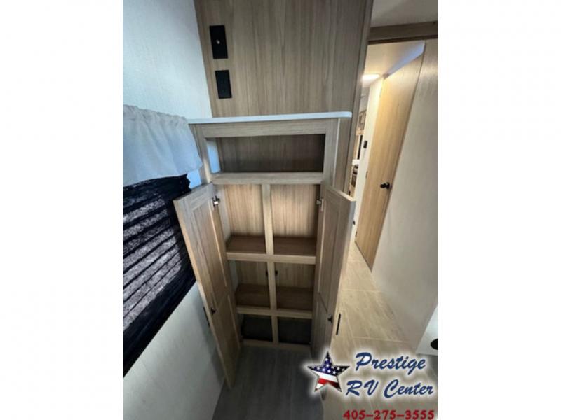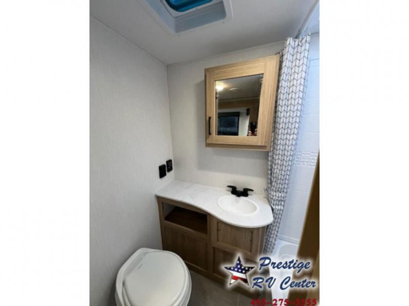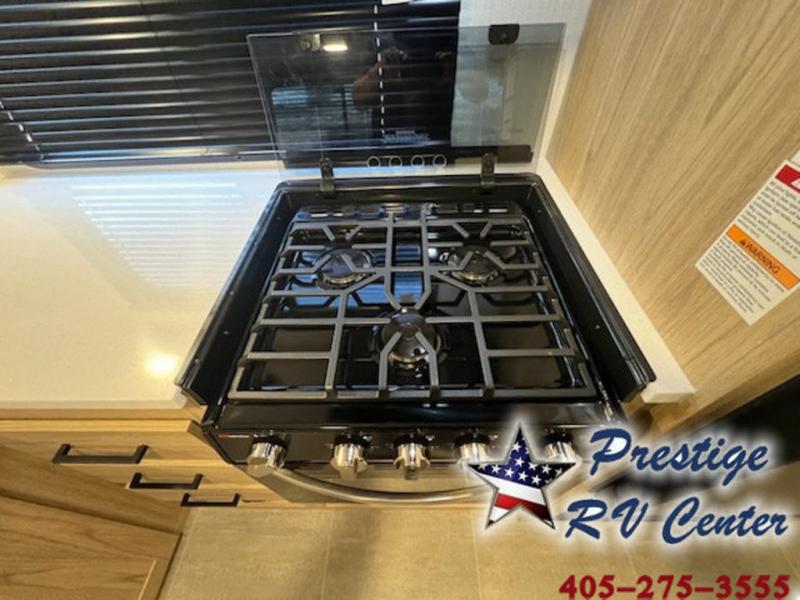 One look at this travel trailer and you'll be hooked! The front private bedroom with a queen bed provides a place for you to retreat to each night, and the full bath will let you freshen up in the morning. The little ones or your guests will have the bunkhouse to themselves with bunk beds, a dinette with a flip-up bunk above, plus a wardrobe to keep this space tidy. A full kitchen, complete with a three burner cooktop, microwave oven, and farmhouse sink will be perfect for meal times, or you can head outdoors to cook on the exterior griddle. In the evening, you can relax on the sofa or play a game around the U-shaped dinette!