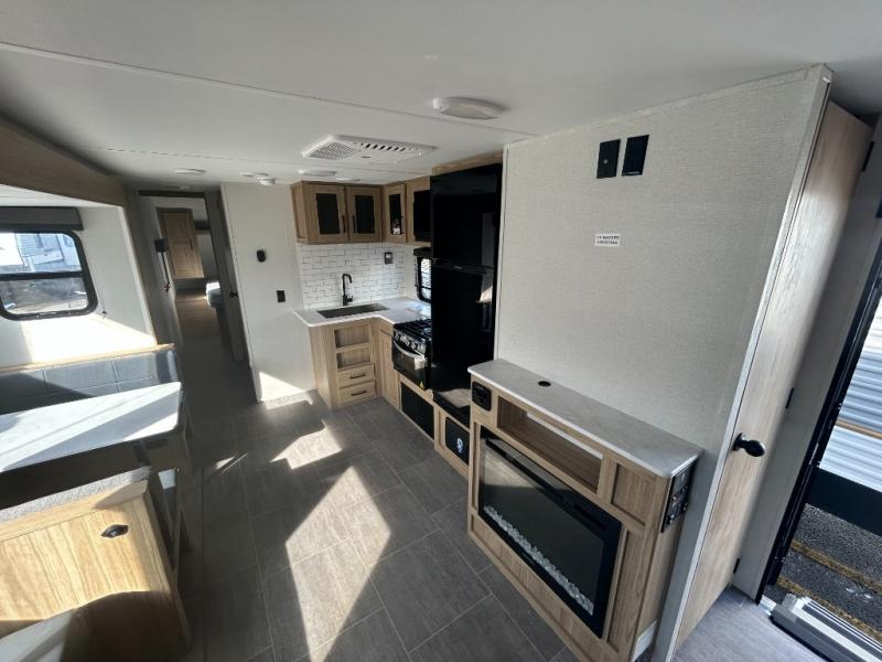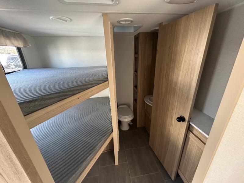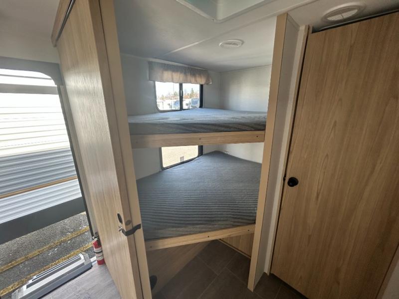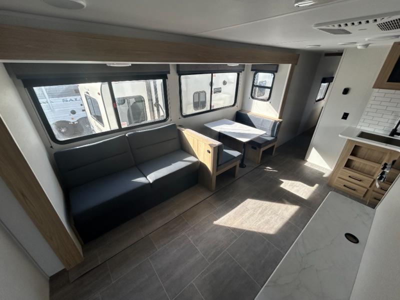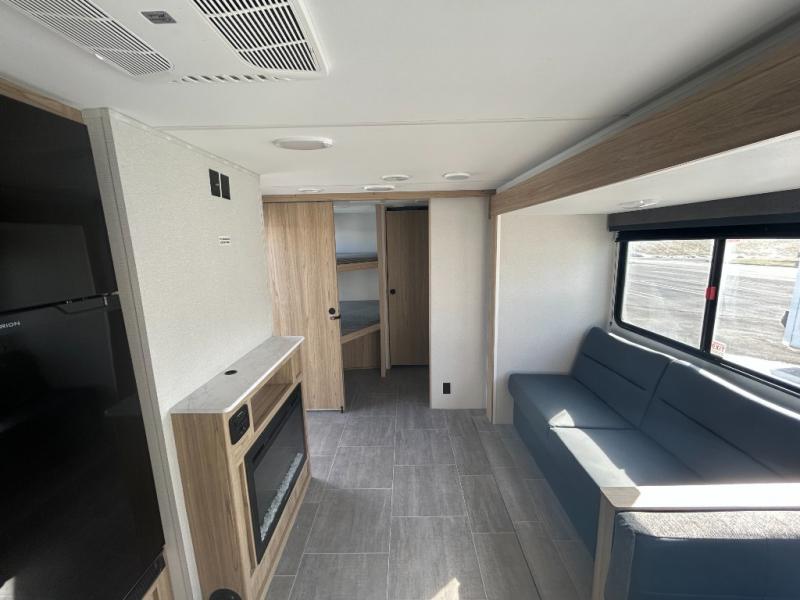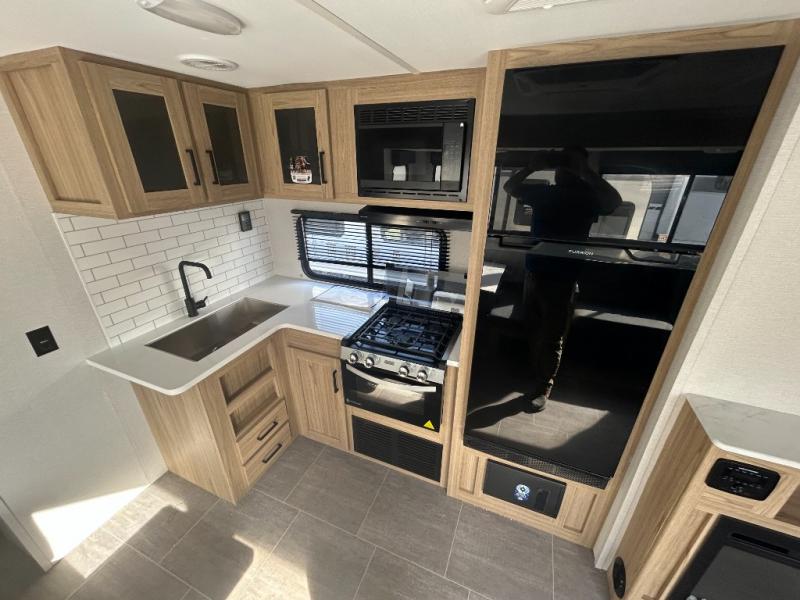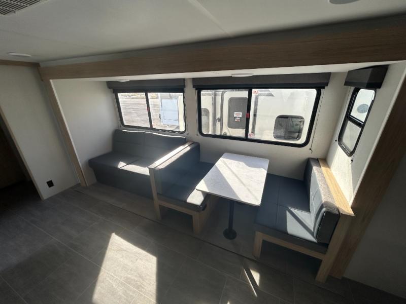 One look at this travel trailer and you'll be hooked! The front private bedroom with a queen bed provides a place for you to retreat to each night, and the full bath will let you freshen up in the morning. The little ones or your guests will have the bunkhouse suite to themselves with double-size bunks, a dresser, and a half bath; how convenient! A full kitchen, complete with a three burner cooktop, microwave oven, and farmhouse sink will be perfect for meal times, or you can head outdoors to cook at the outdoor kitchen. In the evening, you can relax on the sofa or play a game at the booth dinette!