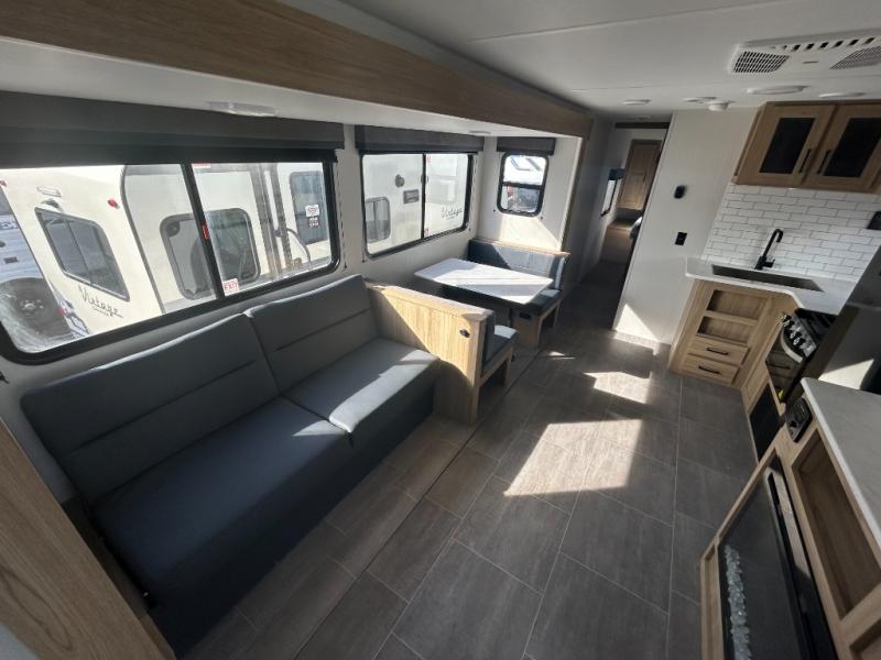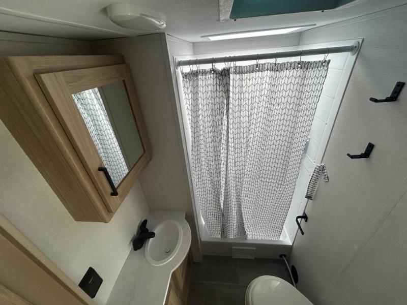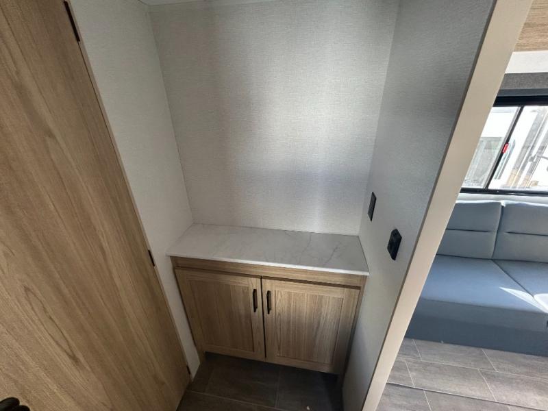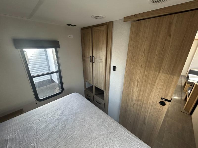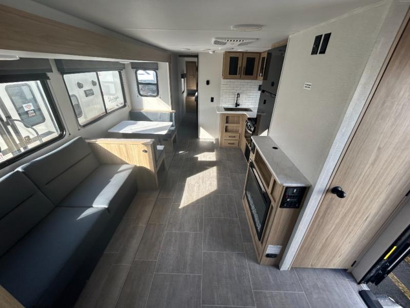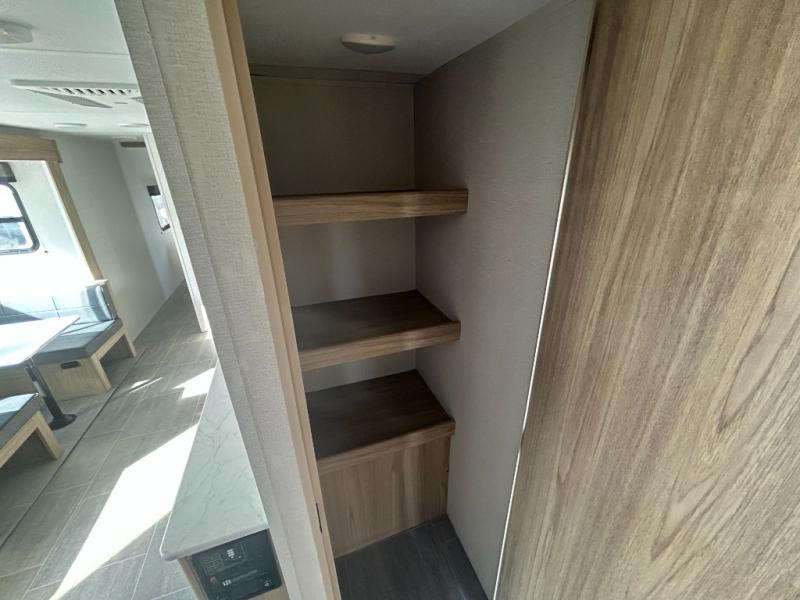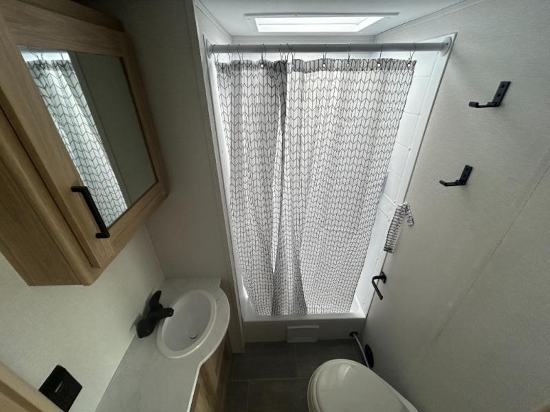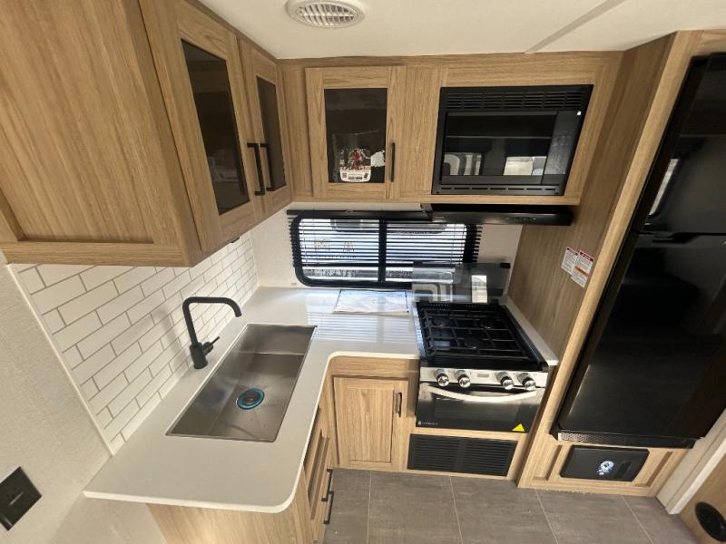 One look at this travel trailer and you'll be hooked! The front private bedroom with a queen bed provides a place for you to retreat to each night, and the full bath will let you freshen up in the morning. The little ones or your guests will have the bunkhouse suite to themselves with double-size bunks, a dresser, and a half bath; how convenient! A full kitchen, complete with a three burner cooktop, microwave oven, and farmhouse sink will be perfect for meal times, or you can head outdoors to cook at the outdoor kitchen. In the evening, you can relax on the sofa or play a game at the booth dinette!