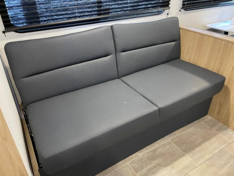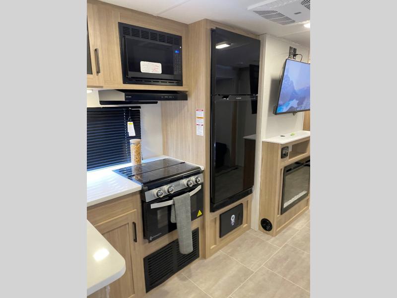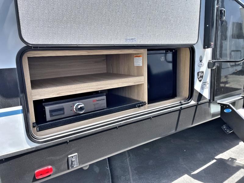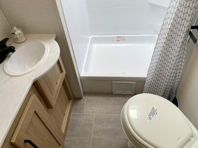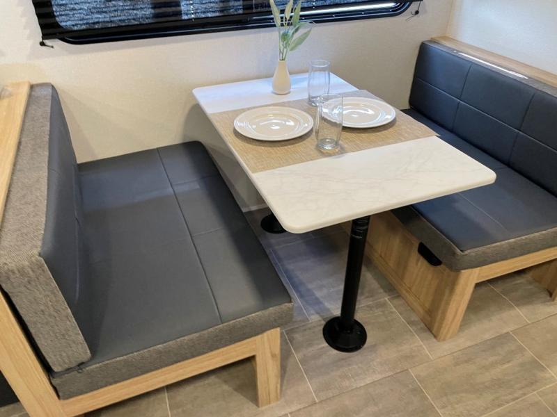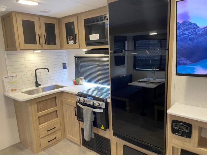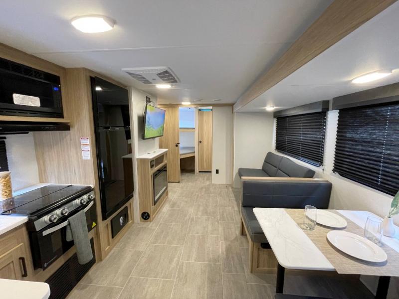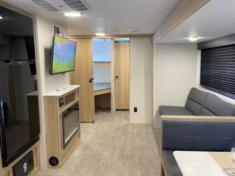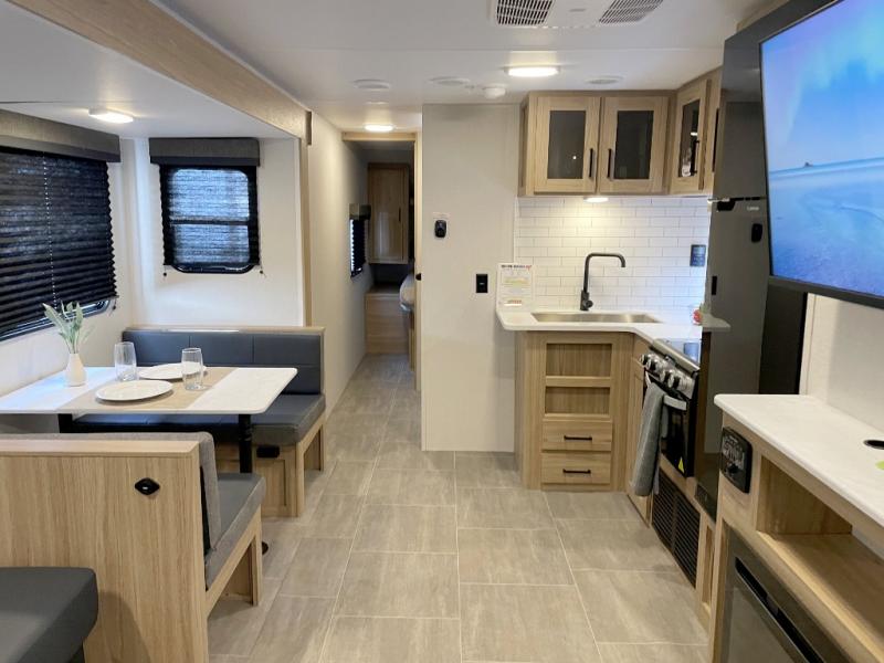 One look at this travel trailer and you'll be hooked! The front private bedroom with a queen bed provides a place for you to retreat to each night, and the full bath will let you freshen up in the morning. The little ones or your guests will have the bunkhouse suite to themselves with double-size bunks, a dresser, and a half bath; how convenient! A full kitchen, complete with a three burner cooktop, microwave oven, and farmhouse sink will be perfect for meal times, or you can head outdoors to cook at the outdoor kitchen. In the evening, you can relax on the sofa or play a game at the booth dinette!