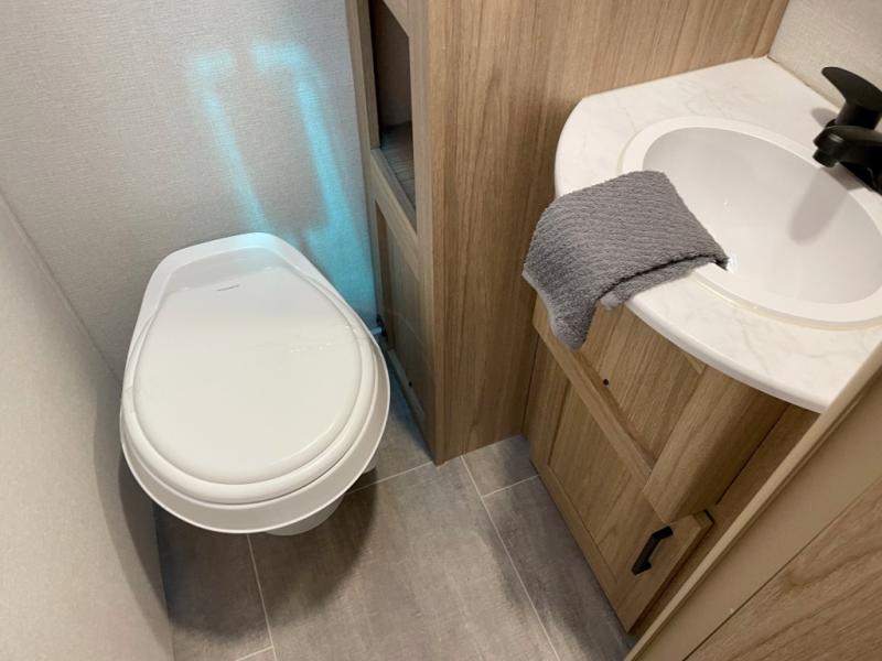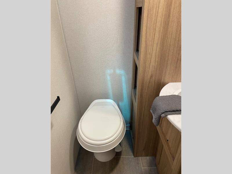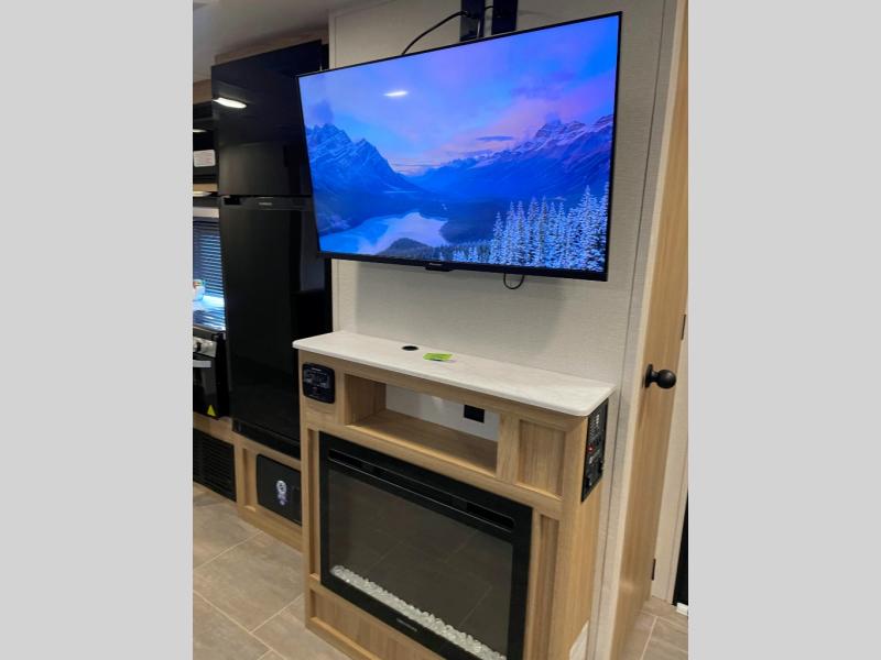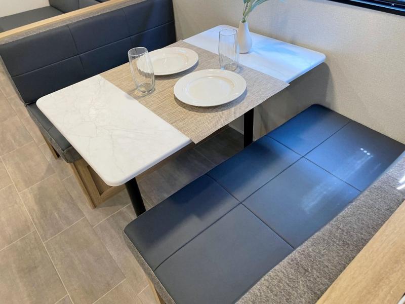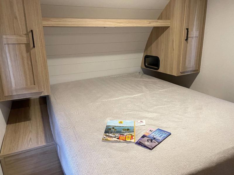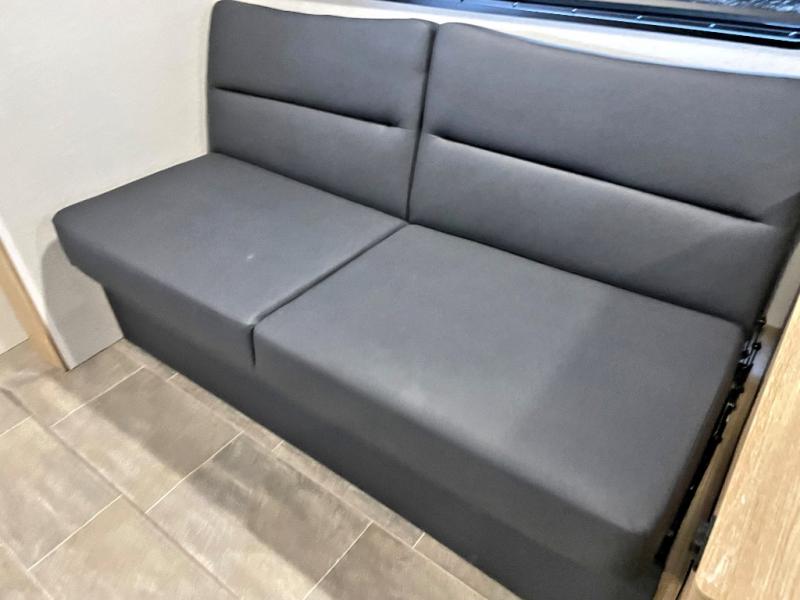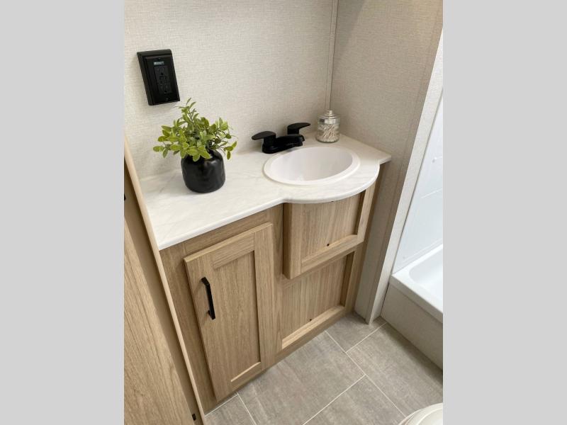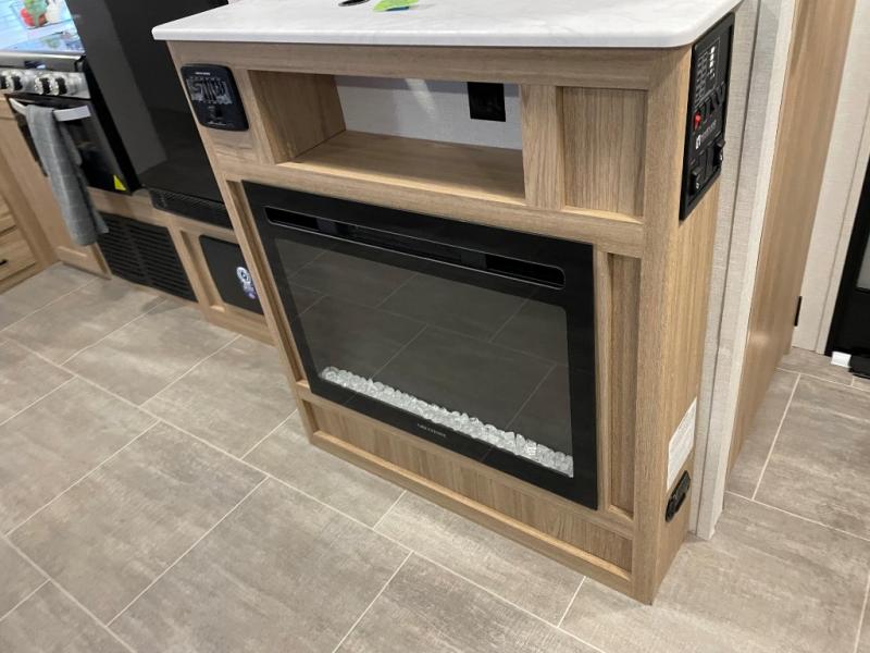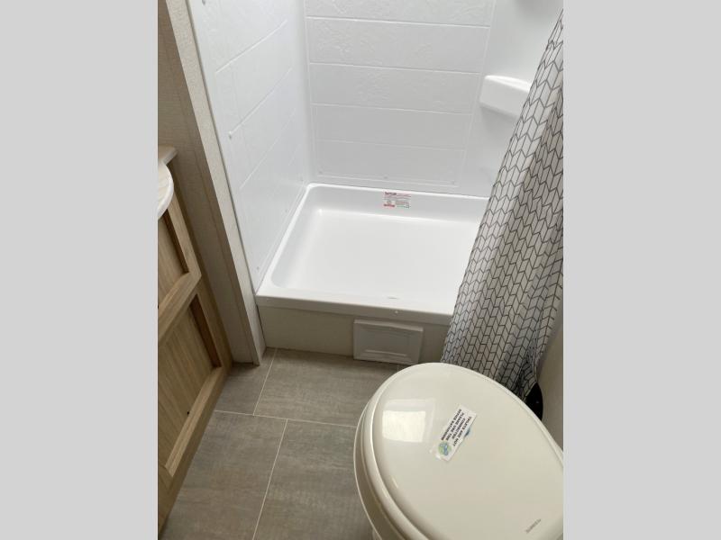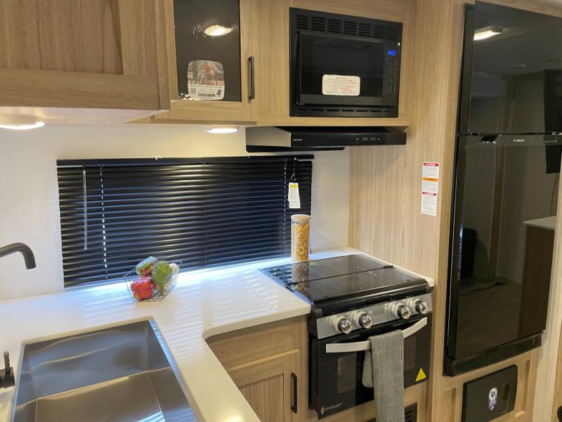 One look at this travel trailer and you'll be hooked! The front private bedroom with a queen bed provides a place for you to retreat to each night, and the full bath will let you freshen up in the morning. The little ones or your guests will have the bunkhouse suite to themselves with double-size bunks, a dresser, and a half bath; how convenient! A full kitchen, complete with a three burner cooktop, microwave oven, and farmhouse sink will be perfect for meal times, or you can head outdoors to cook at the outdoor kitchen. In the evening, you can relax on the sofa or play a game at the booth dinette!