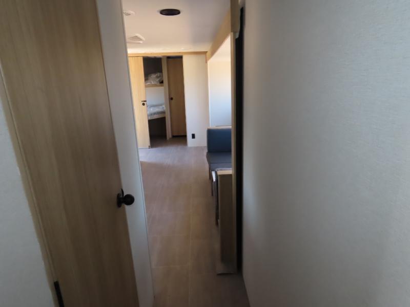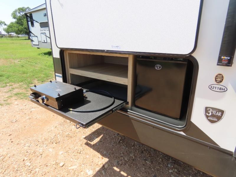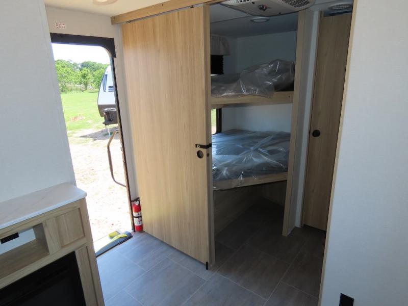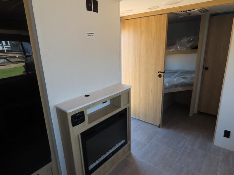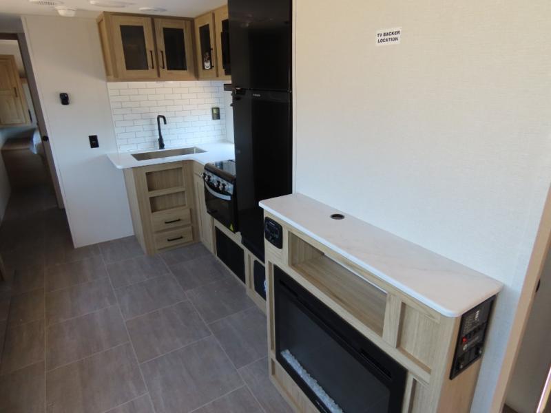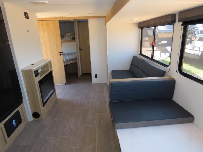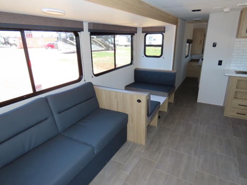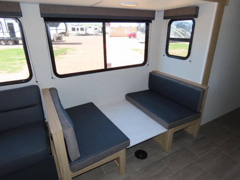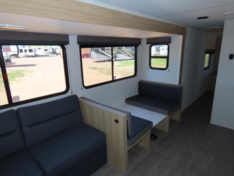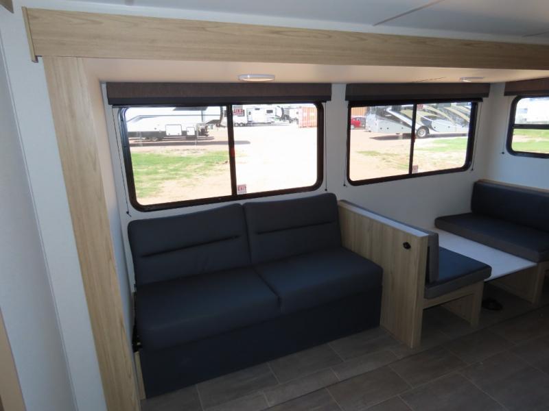 The little ones or your guests will have the bunkhouse suite to themselves with double-size bunks, a dresser, and a half bath; how convenient! A full kitchen, complete with a three burner cooktop, microwave oven, and farmhouse sink will be perfect for meal times, or you can head outdoors to cook at the outdoor kitchen. In the evening, you can relax on the sofa or play a game at the booth dinette!