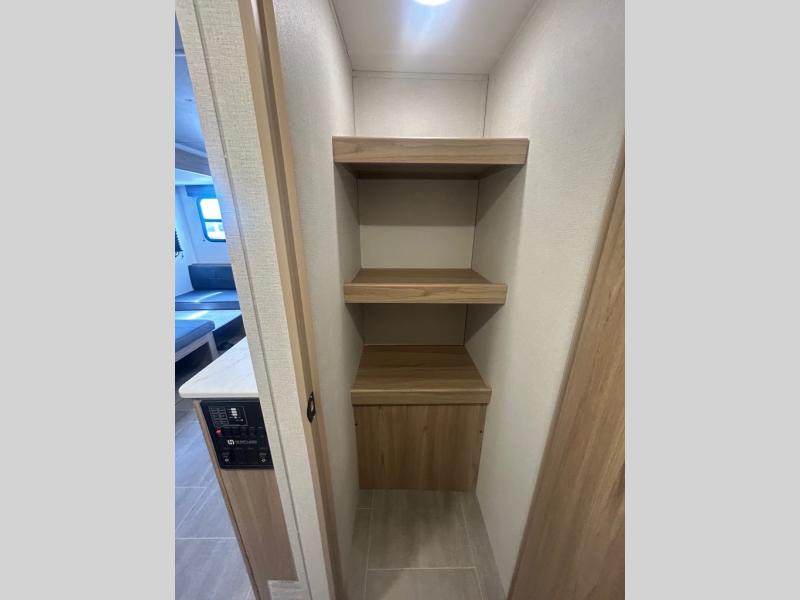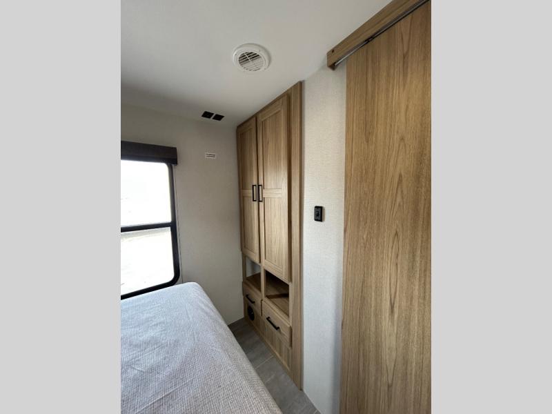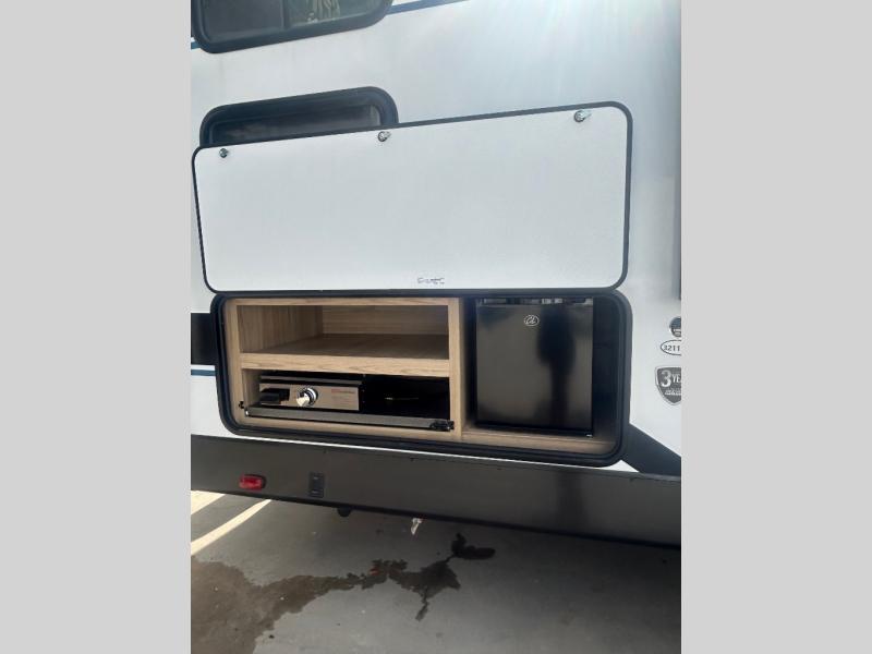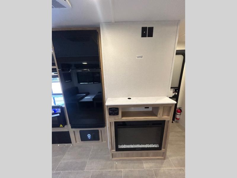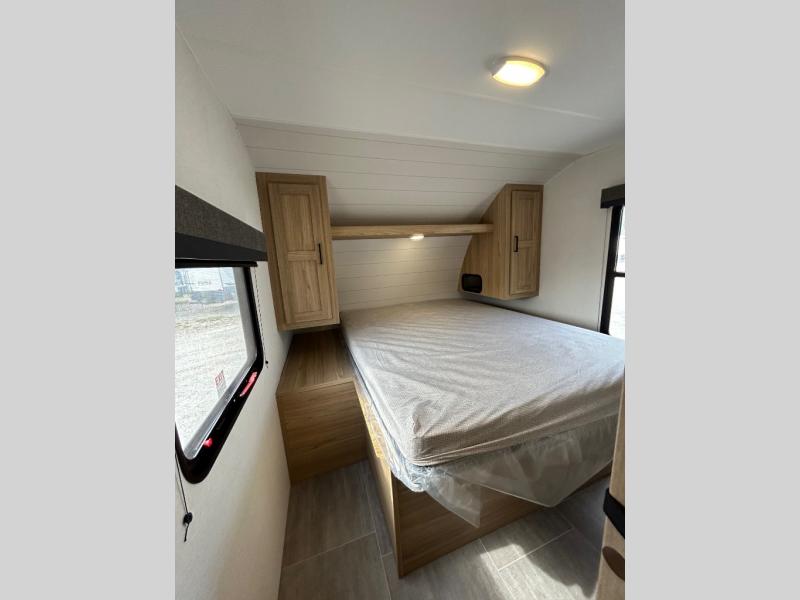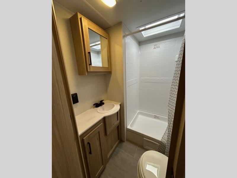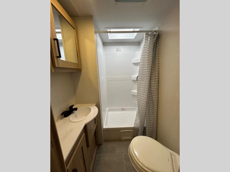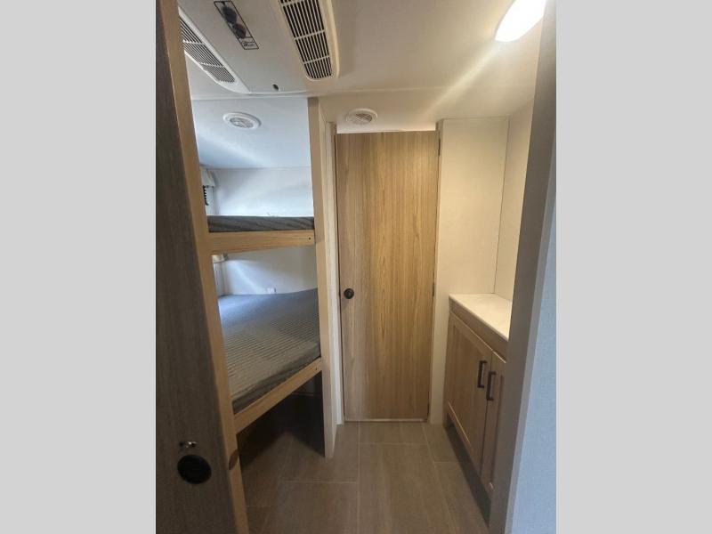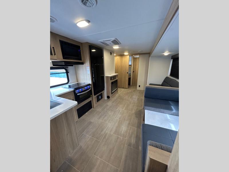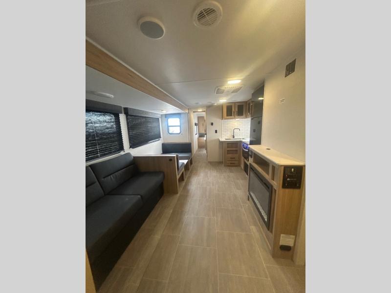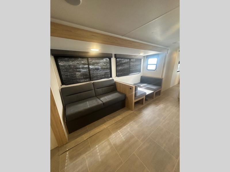 One look at this travel trailer and you'll be hooked! The front private bedroom with a queen bed provides a place for you to retreat to each night, and the full bath will let you freshen up in the morning. The little ones or your guests will have the bunkhouse suite to themselves with double-size bunks, a dresser, and a half bath; how convenient! A full kitchen, complete with a three burner cooktop, microwave oven, and farmhouse sink will be perfect for meal times, or you can head outdoors to cook at the outdoor kitchen. In the evening, you can relax on the sofa or play a game at the booth dinette!