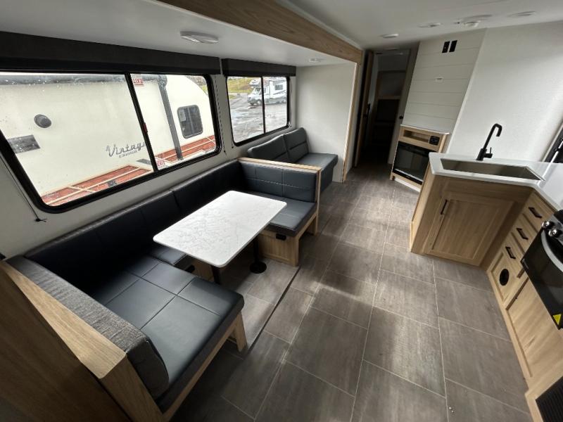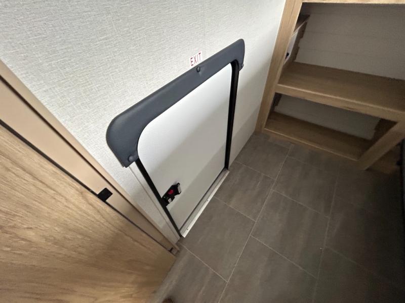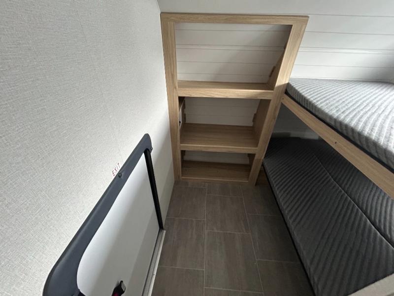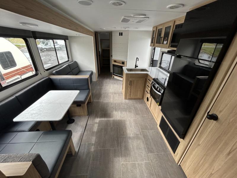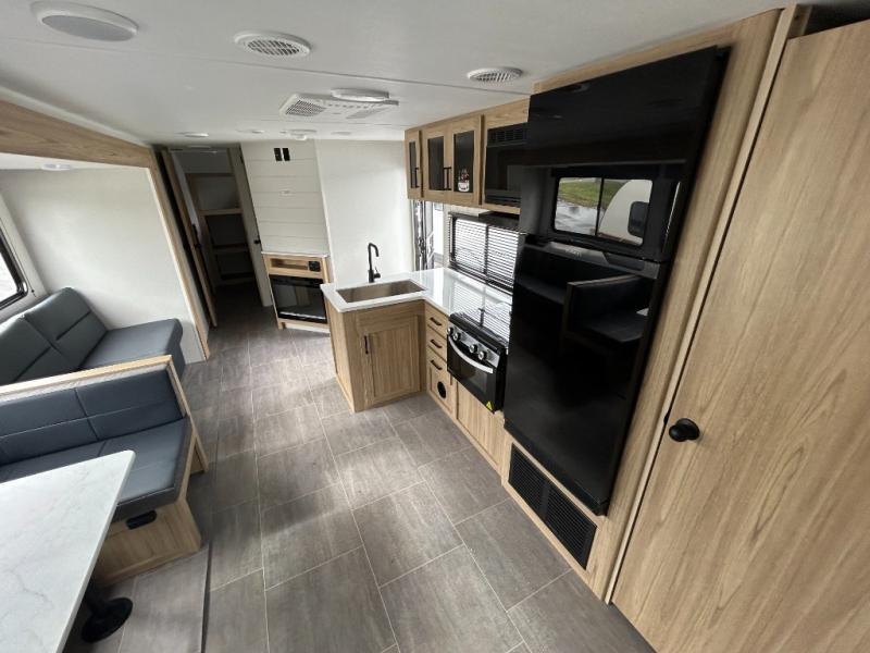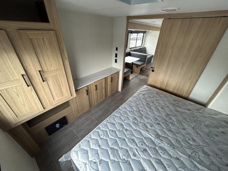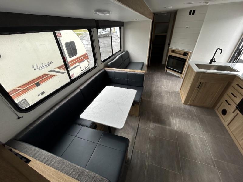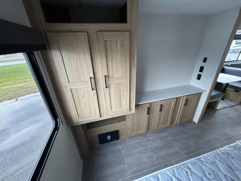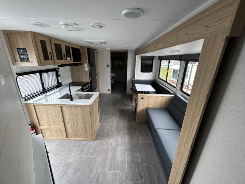 Camping just got a whole lot sweeter in this double slide out travel trailer for nine people. Your guests can stay in the front private bunkhouse that includes double-size bunks with removable lower bunks so you can easily pack in gear! You will enjoy the rear private bedroom with a queen bed slide out, a wardrobe, plus a dresser with TV prep. The main living area is spacious with its large slide out, and everyone can dine around the U-shaped dinette. There is also a sofa here and an entertainment center with a fireplace. Bring your own TV and you're ready for movie night! And check out the outdoor kitchen with a griddle for a pancake breakfast!