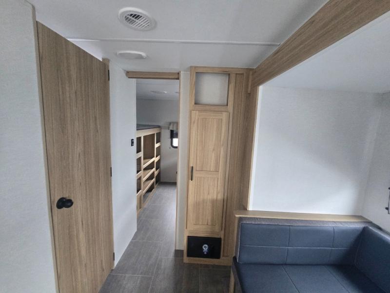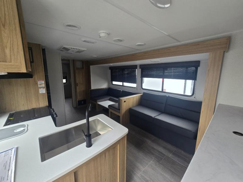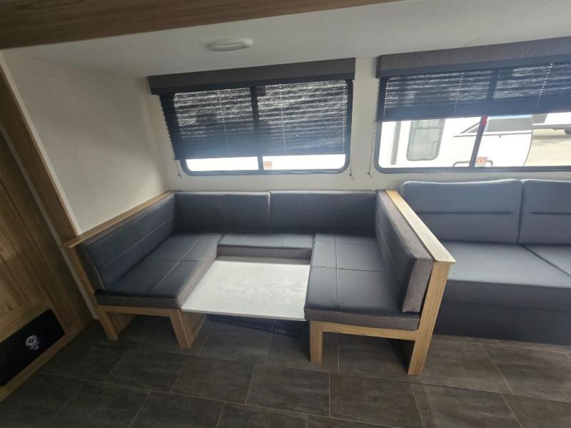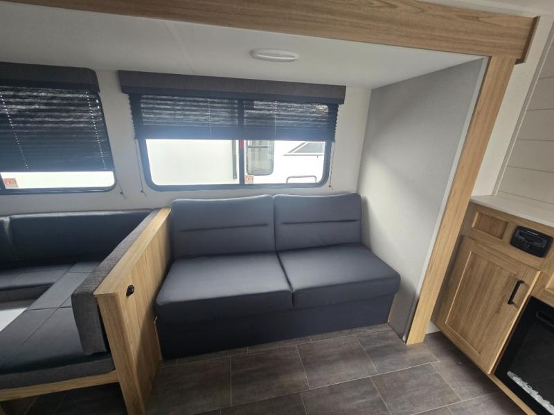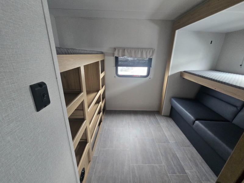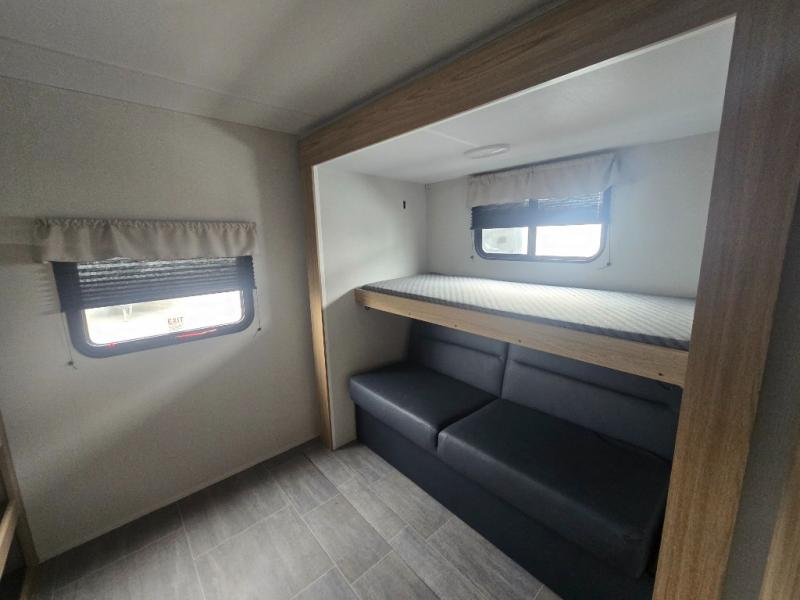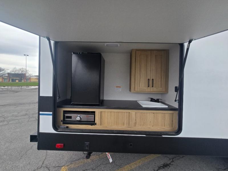 This spacious travel trailer will be perfect for extended stays or weekend getaways! The front private bedroom is sure to feel like home with its queen bed, dresser, wardrobe, plus washer and dryer prep for the option to add those appliances. Your guests can claim the rear private bunkhouse that includes bunk beds and a sofa plus a slide out for more floor space. The third slide out is found in the combined kitchen and living room, and here you'll enjoy the sofa and U-shaped dinette. There is also a full bath onboard, along with a full kitchen inside and an exterior kitchen, complete with a griddle, mini fridge, and sink!