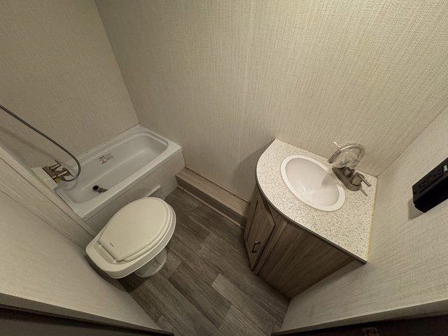 A full bathroom with shower, toilet, and sink allows you to freshen up comfortably without leaving your campsite.