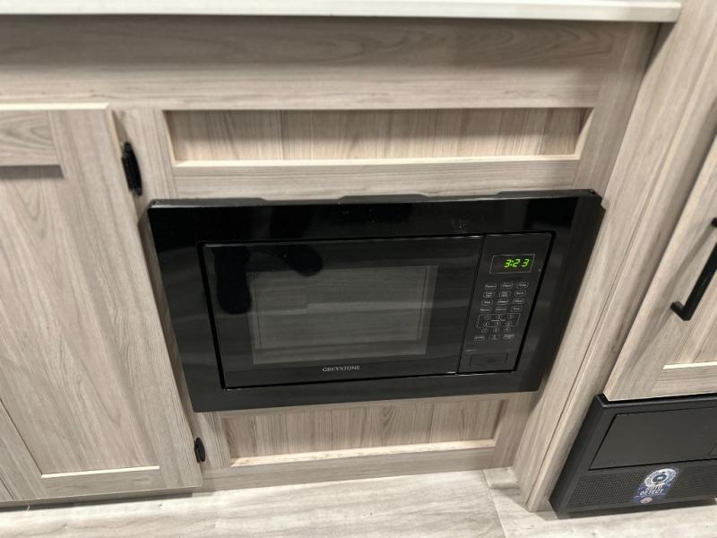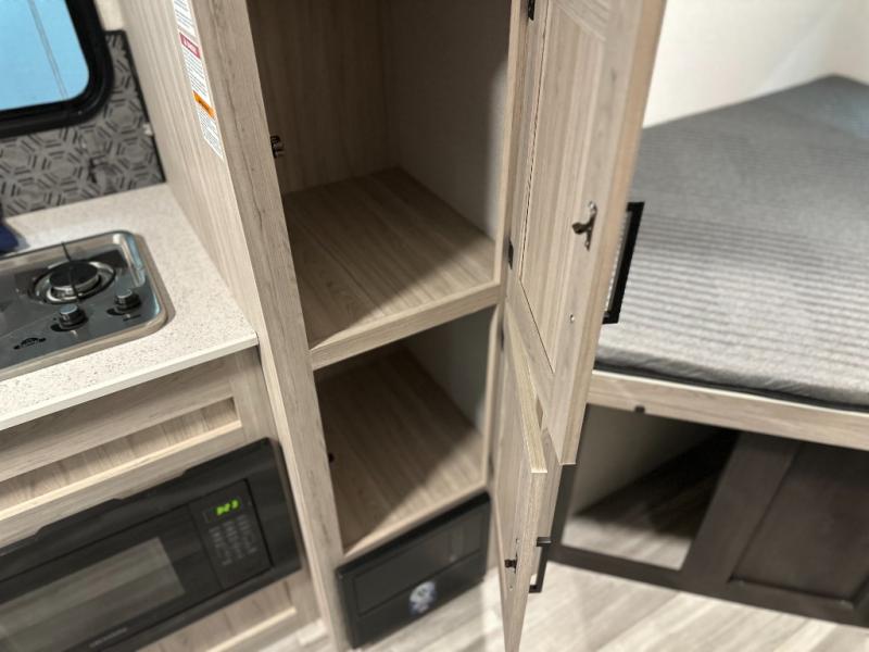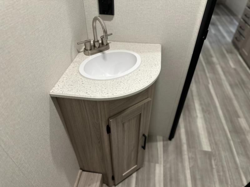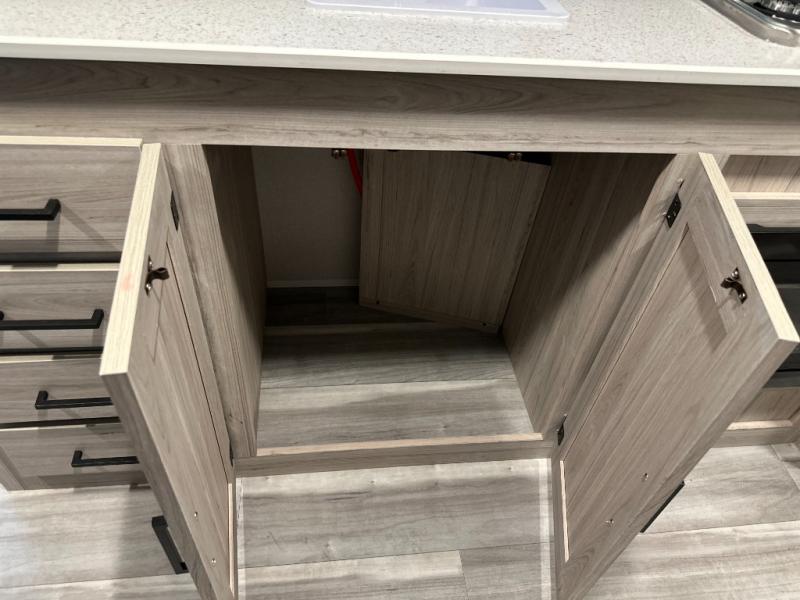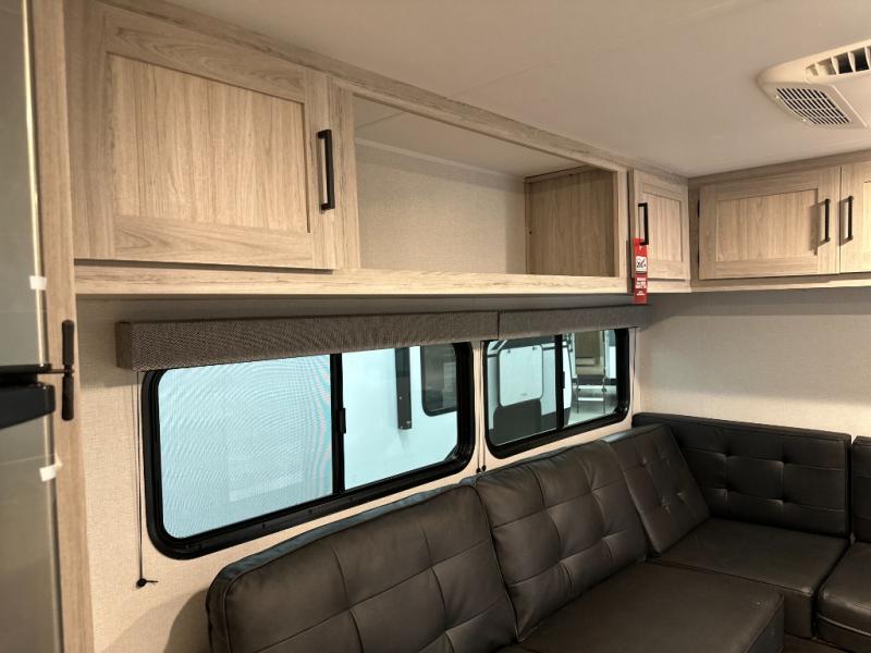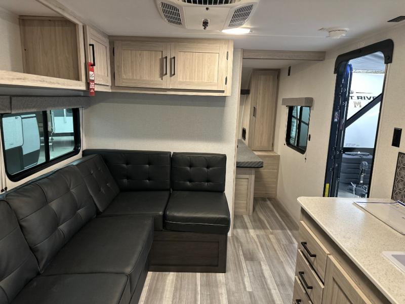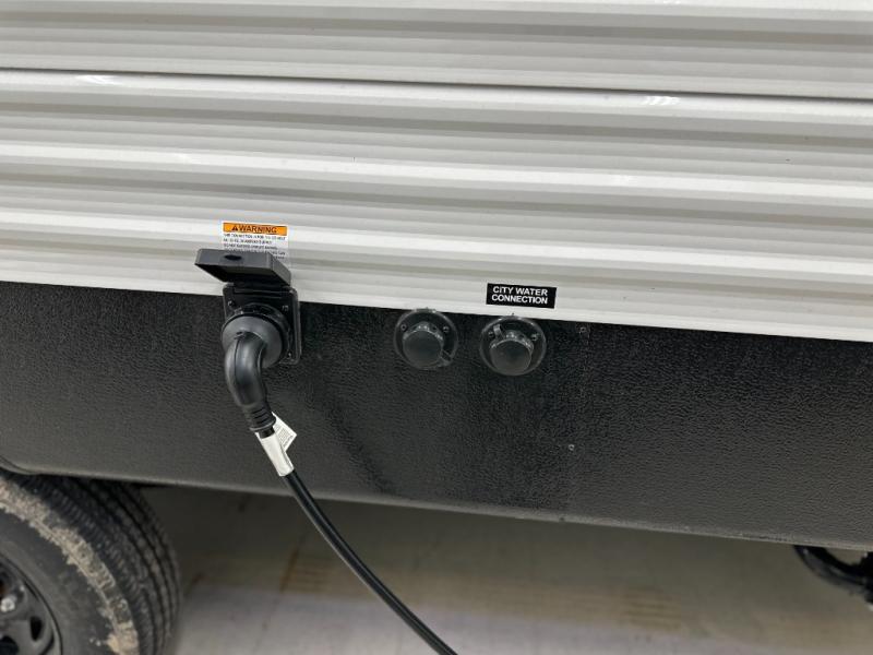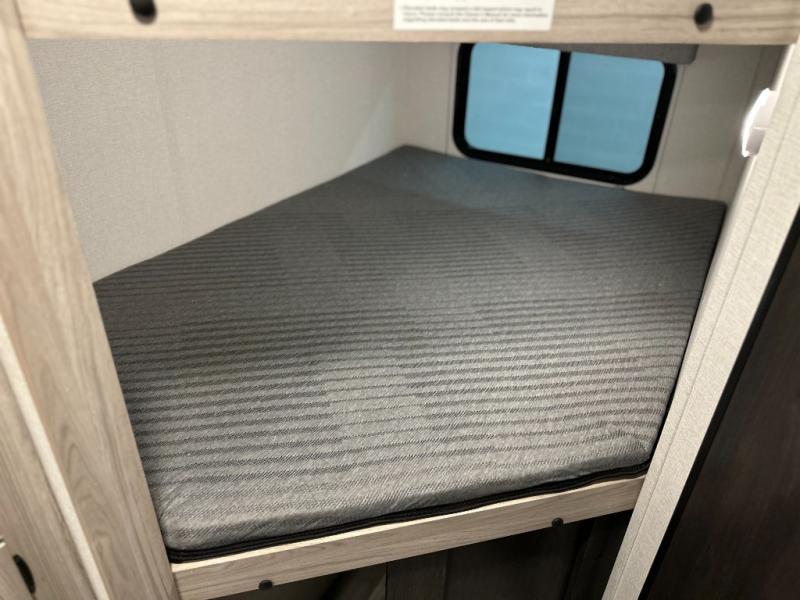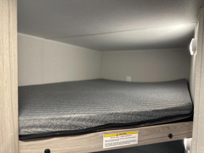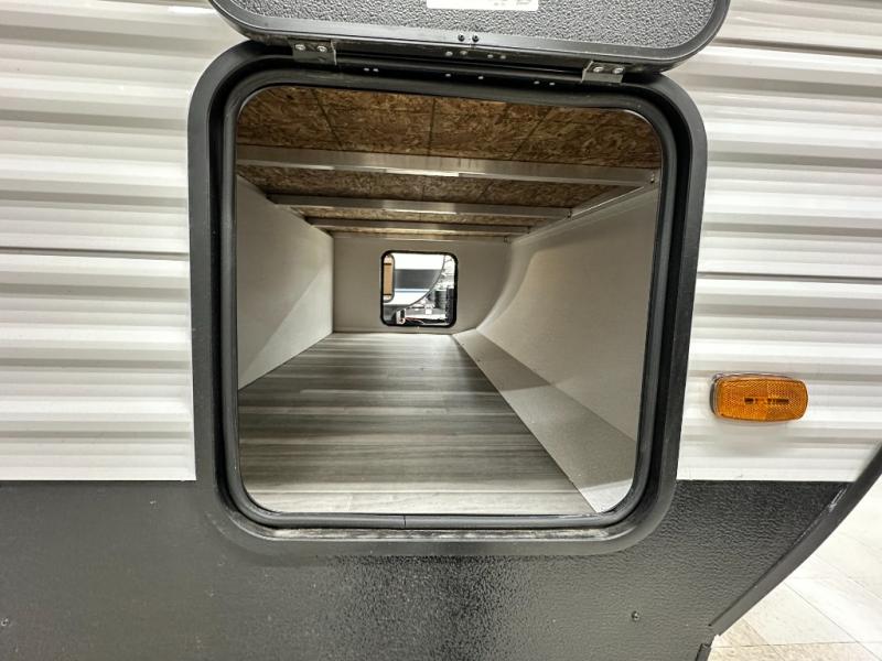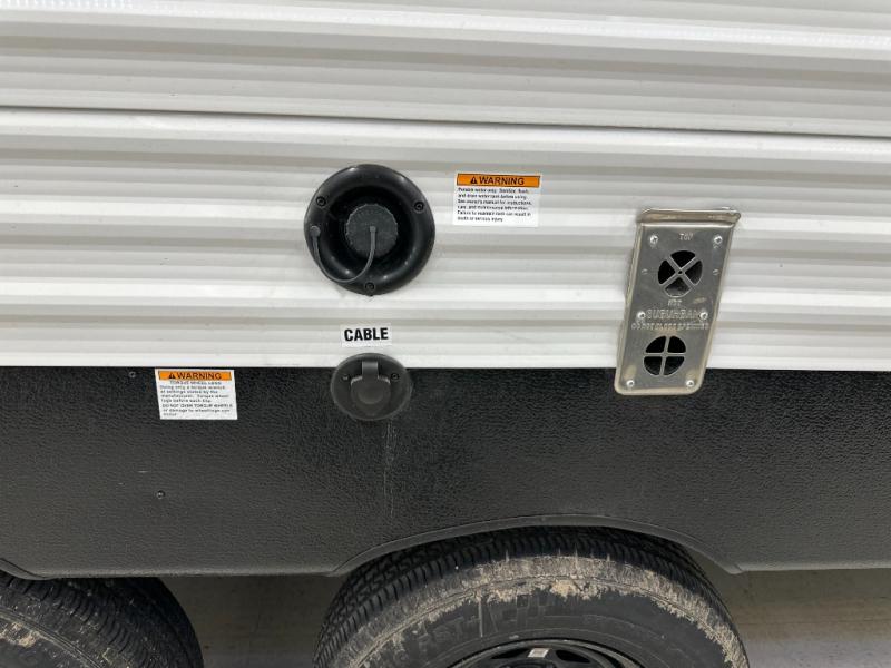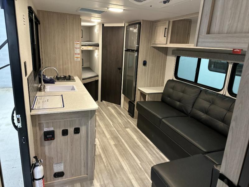 A front queen bed for you and double-size bunks for the kids or your guests make this the perfect trailer to take a larger groups camping. Your crew will love to dine on the L-shaped sofa, and there is a sofa table where you can put your drinks on. A full kitchen includes a two burner cooktop and 12V refrigerator to cook and store food, and the full bath onboard will let you freshen up each day. Outside, you'll enjoy the power awning for shade during the day, and the full pass-thru storage can be used for fishing poles, hiking gear, and more!