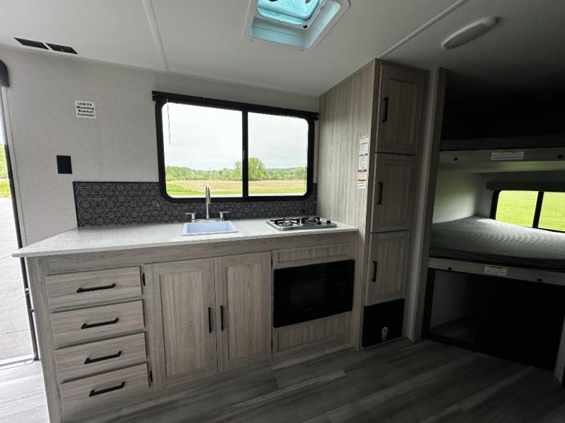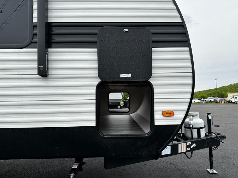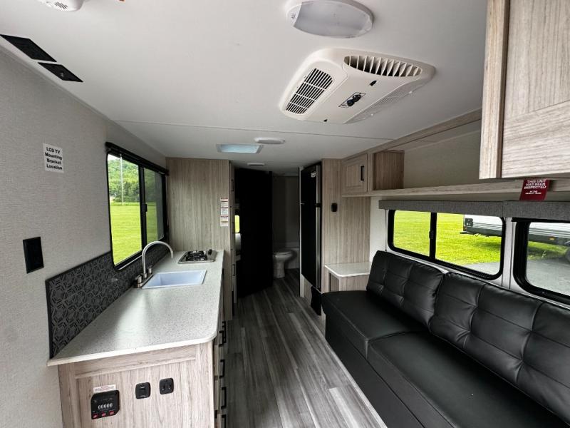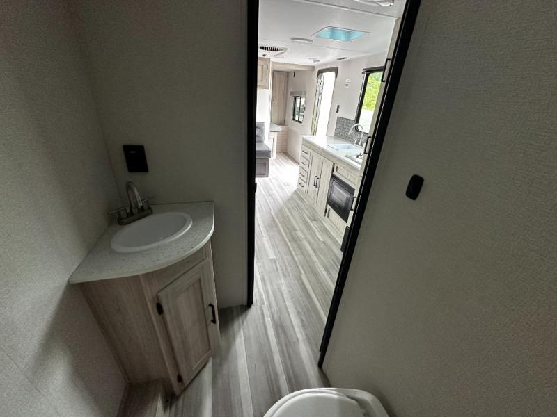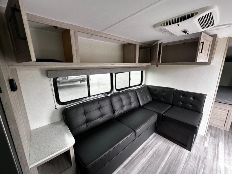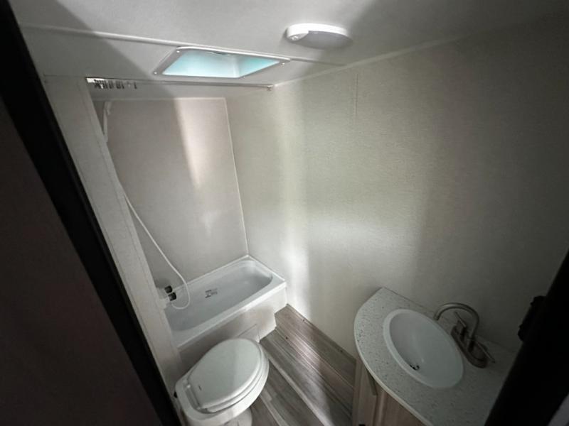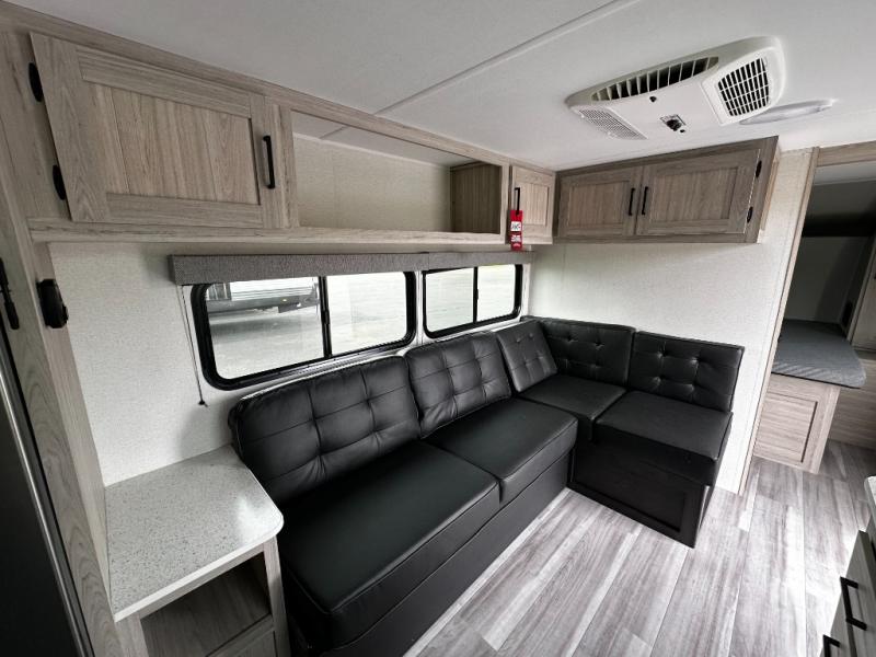 A front queen bed for you and double-size bunks for the kids or your guests make this the perfect trailer to take a larger groups camping. Your crew will love to dine on the L-shaped sofa, and there is a sofa table where you can put your drinks on. A full kitchen includes a two burner cooktop and 12V refrigerator to cook and store food, and the full bath onboard will let you freshen up each day. Outside, you'll enjoy the power awning for shade during the day, and the full pass-thru storage can be used for fishing poles, hiking gear, and more!