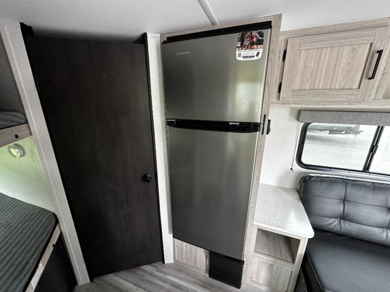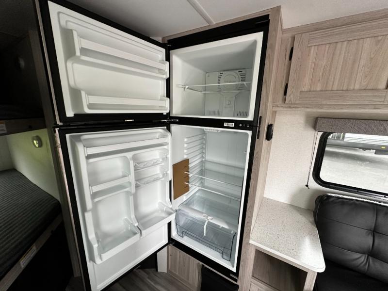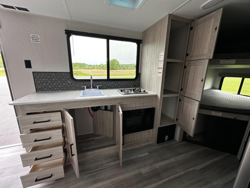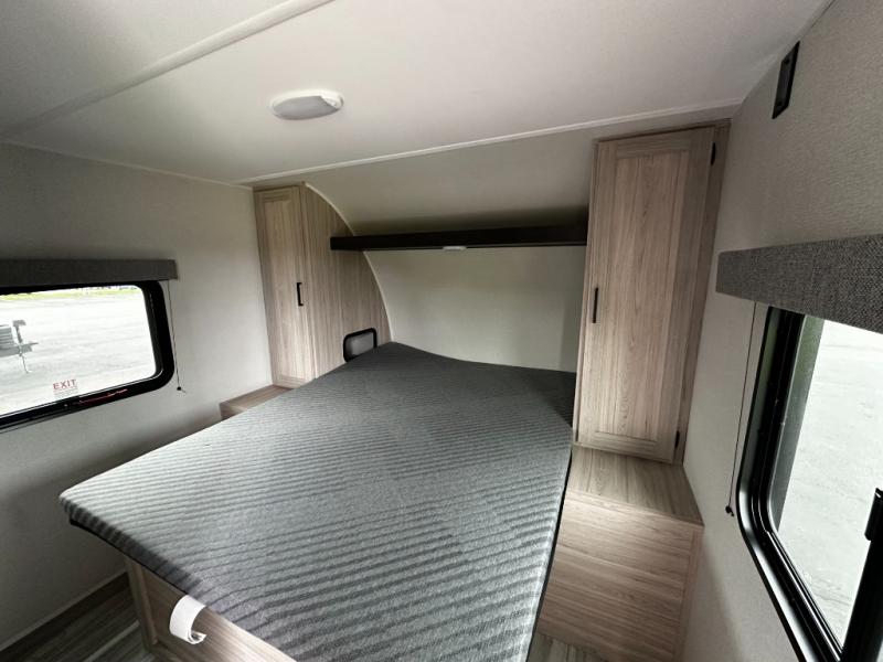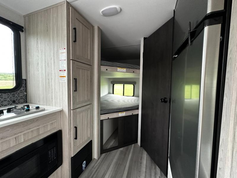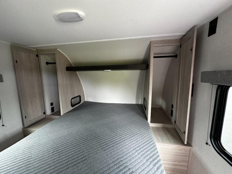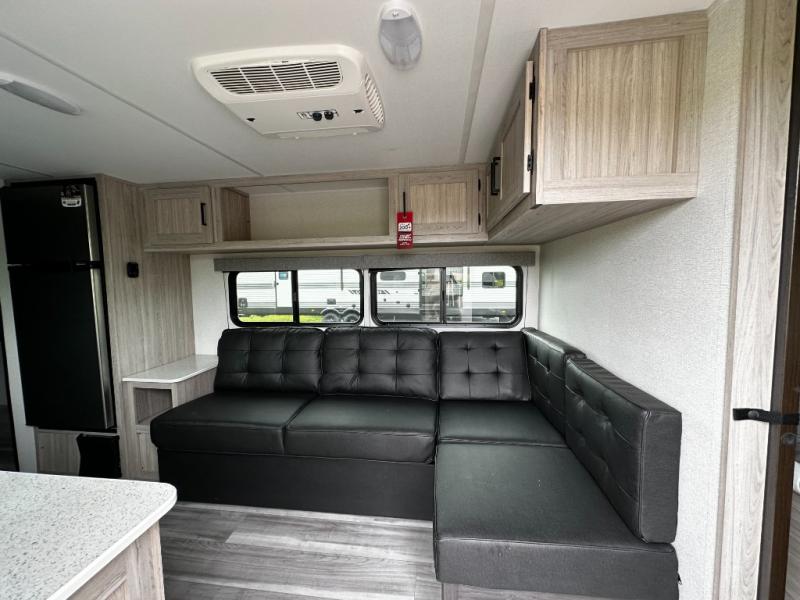 A front queen bed for you and double-size bunks for the kids or your guests make this the perfect trailer to take a larger groups camping. Your crew will love to dine on the L-shaped sofa, and there is a sofa table where you can put your drinks on. A full kitchen includes a two burner cooktop and 12V refrigerator to cook and store food, and the full bath onboard will let you freshen up each day. Outside, you'll enjoy the power awning for shade during the day, and the full pass-thru storage can be used for fishing poles, hiking gear, and more!