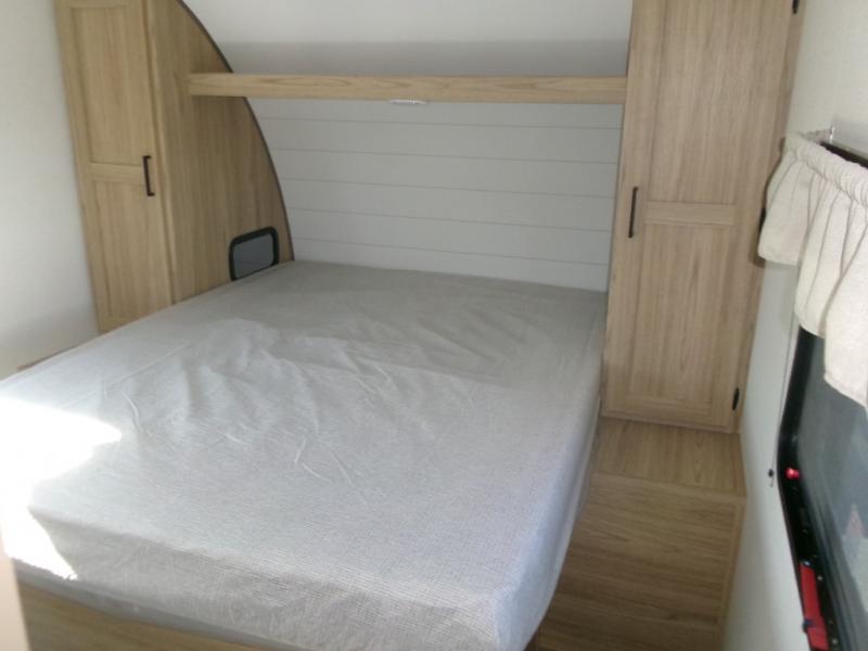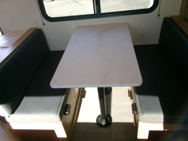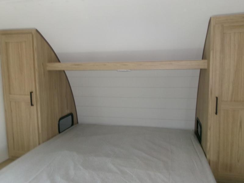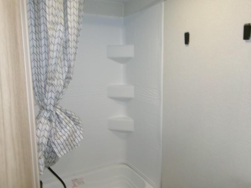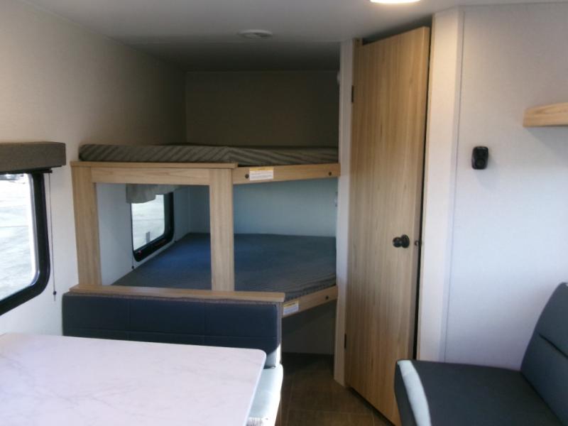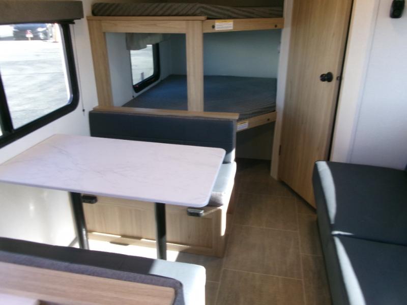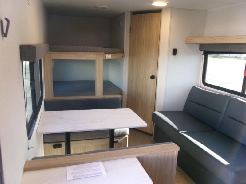 If you enjoy camping with a larger group of friends or family, this travel trailer is the one! You will love having your own front queen bed to sleep on each night, and there are double-size bunks in the rear corner for the little ones or your guests. A booth dinette provides a place to dine, play board games, and even sleep another guest if needed, and there is also a sofa to relax on. The chef of your group can whip up meals on the two burner cooktop, and there is a 12V residential refrigerator to keep food fresh. This model also includes a private bath with a shower and toilet so you don't have to use the camp's facilities at night!