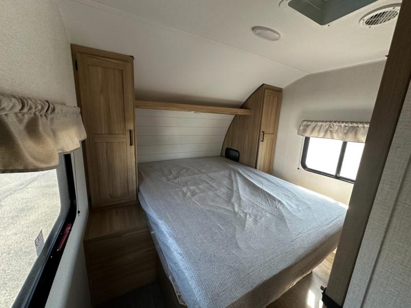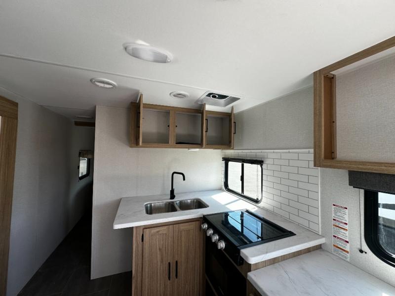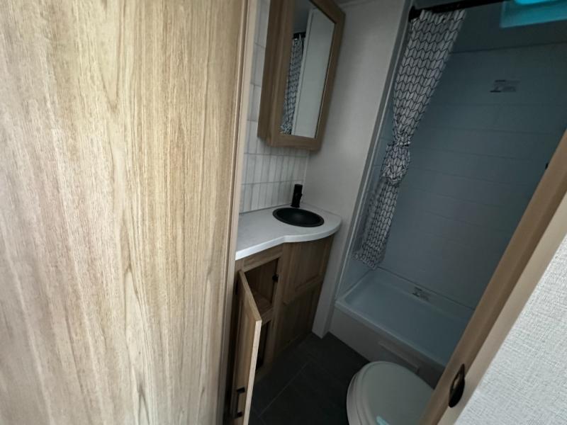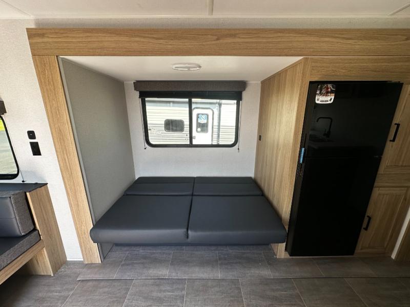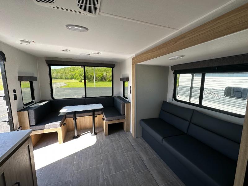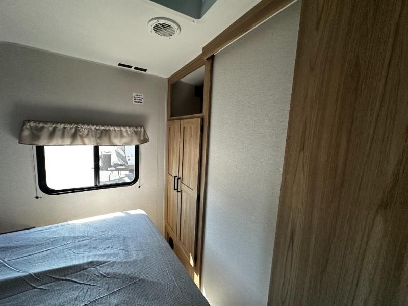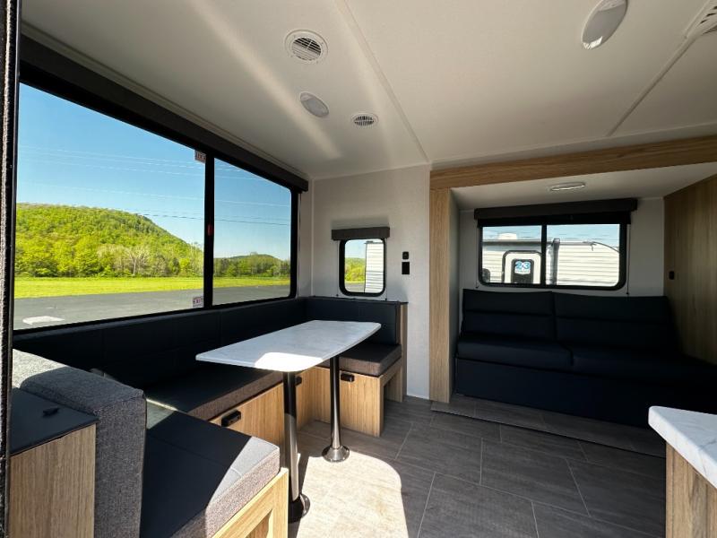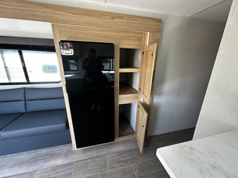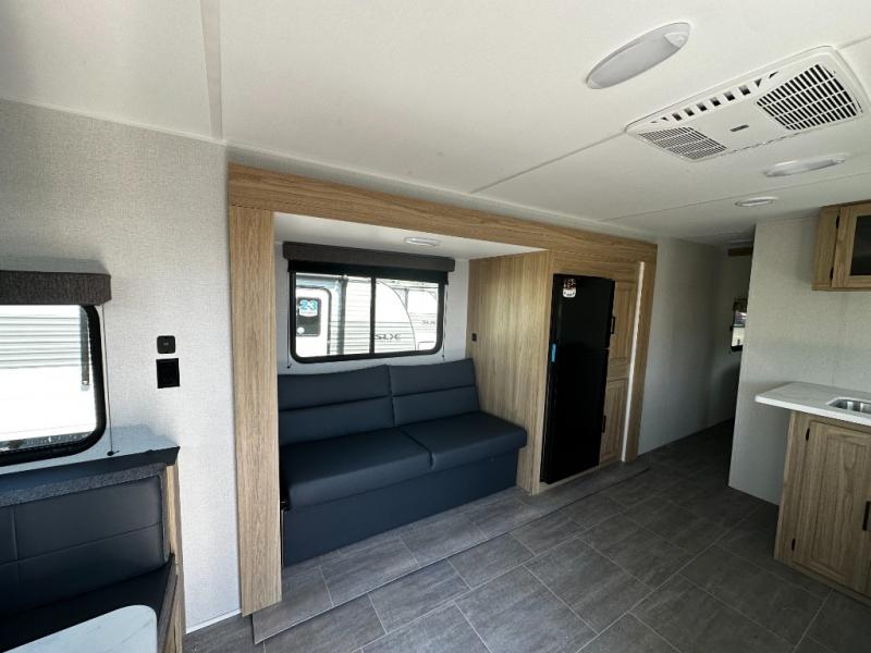 Head to your favorite camping spot in this single slide out travel trailer. You'll find the sofa within the large slide, along with the 12V refrigerator and pantry for food storage. Once dinner is made on the cooktop, your crew can dine around the U-shaped dinette. A spacious full bath will let you freshen up each day, and the front private bedroom is sure to make you feel at home. There is a queen bed, dual bedside wardrobes, plus a third bedroom wardrobe so nothing gets left behind!