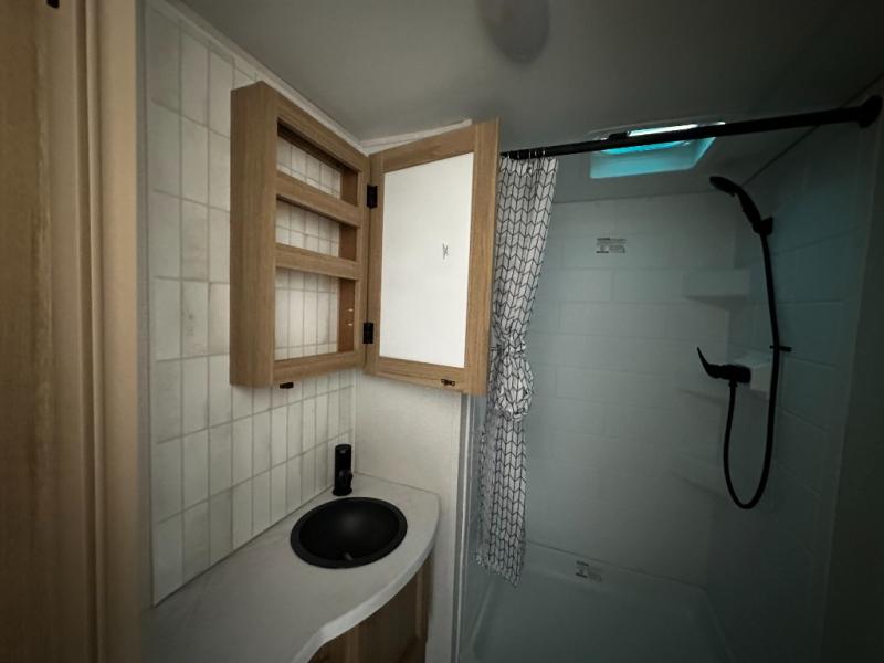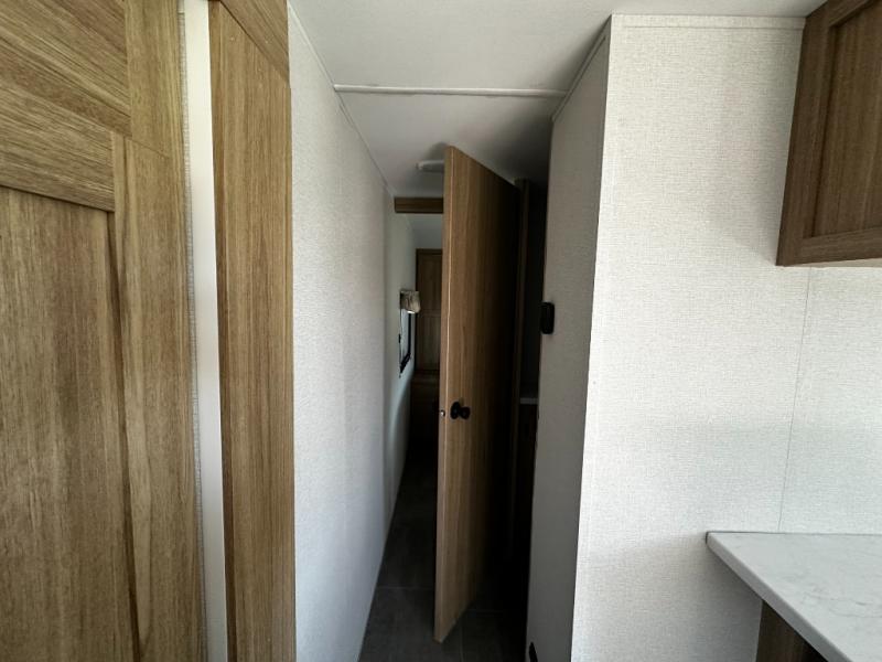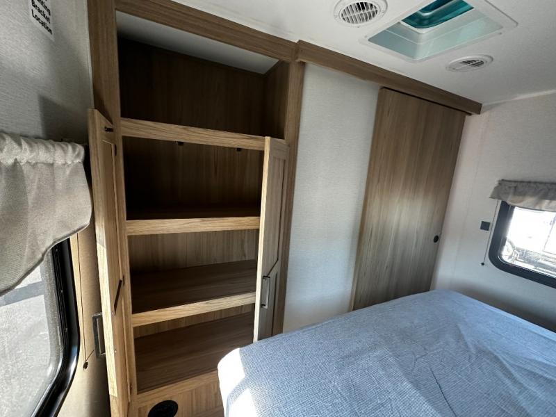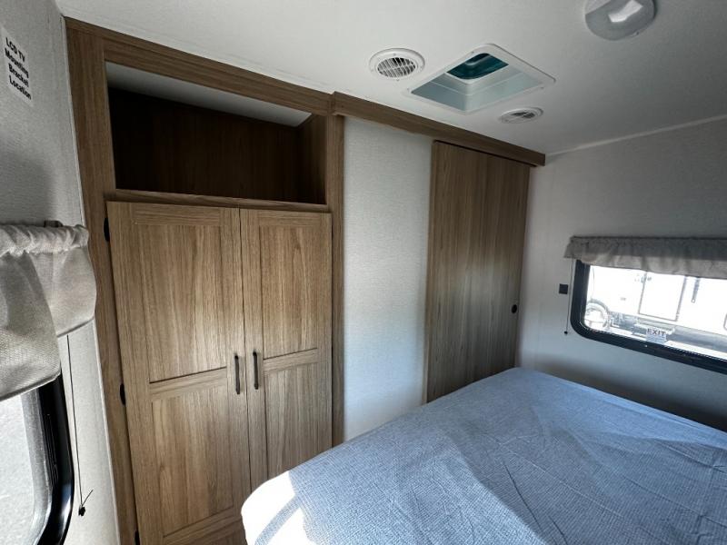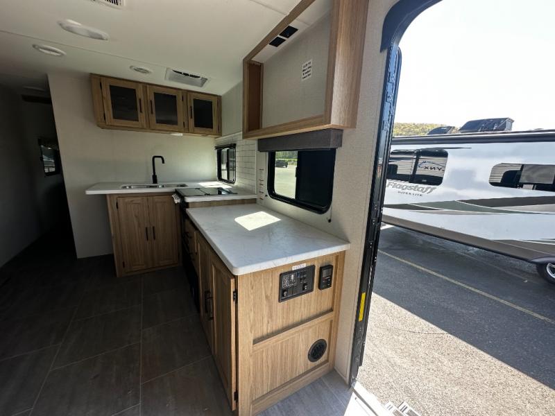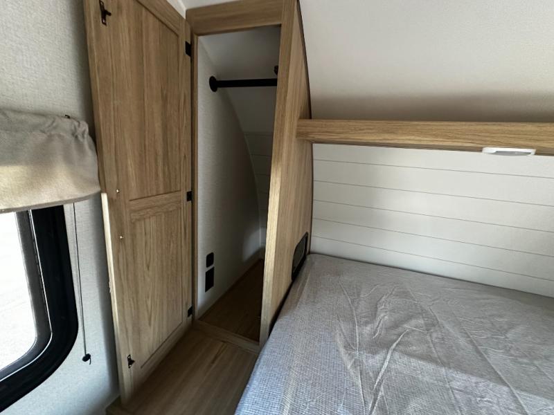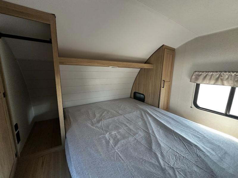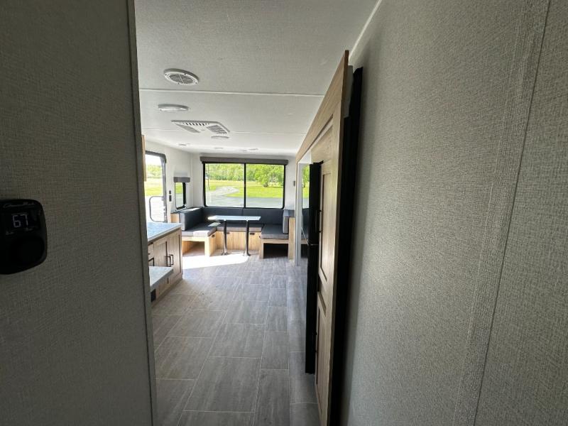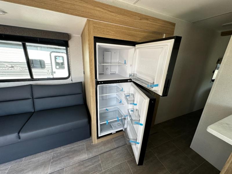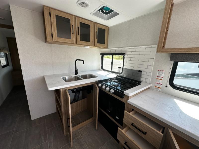 Head to your favorite camping spot in this single slide out travel trailer. You'll find the sofa within the large slide, along with the 12V refrigerator and pantry for food storage. Once dinner is made on the cooktop, your crew can dine around the U-shaped dinette. A spacious full bath will let you freshen up each day, and the front private bedroom is sure to make you feel at home. There is a queen bed, dual bedside wardrobes, plus a third bedroom wardrobe so nothing gets left behind!