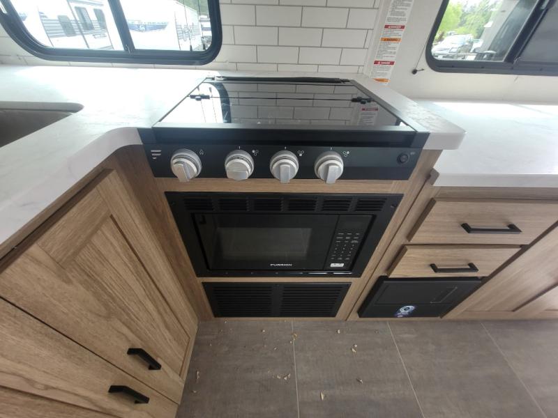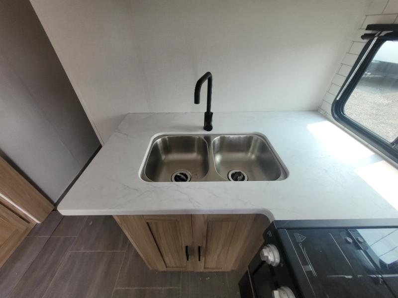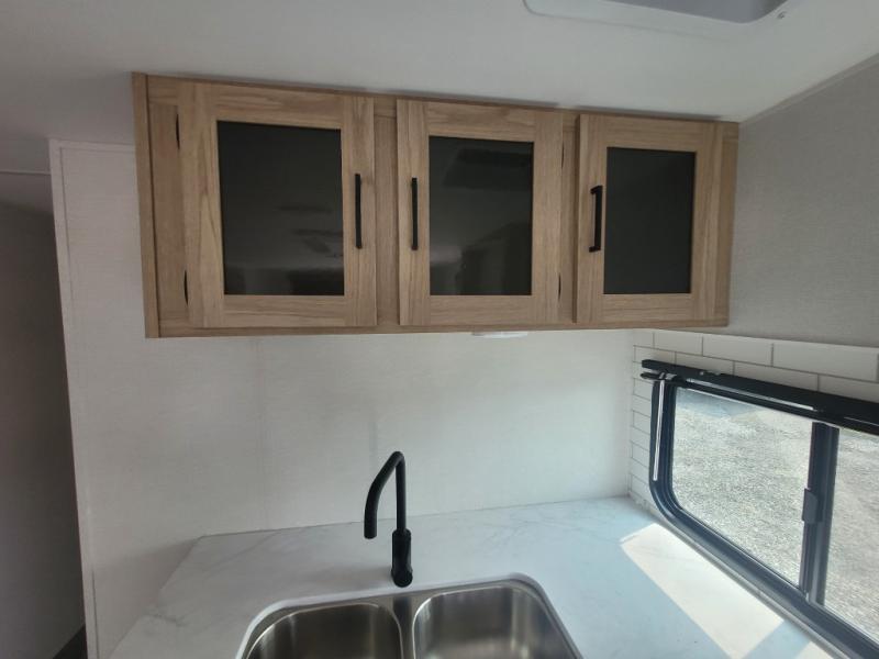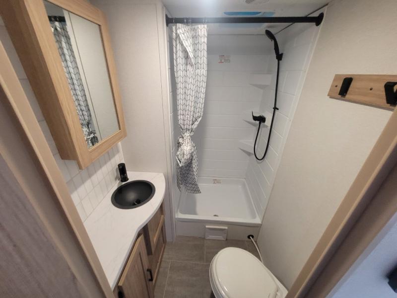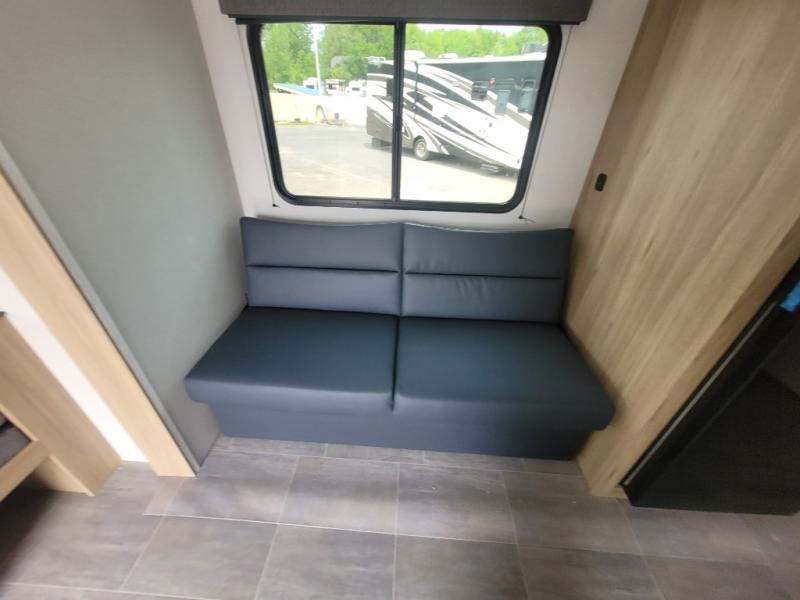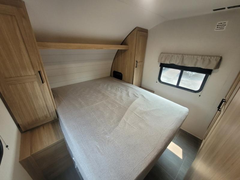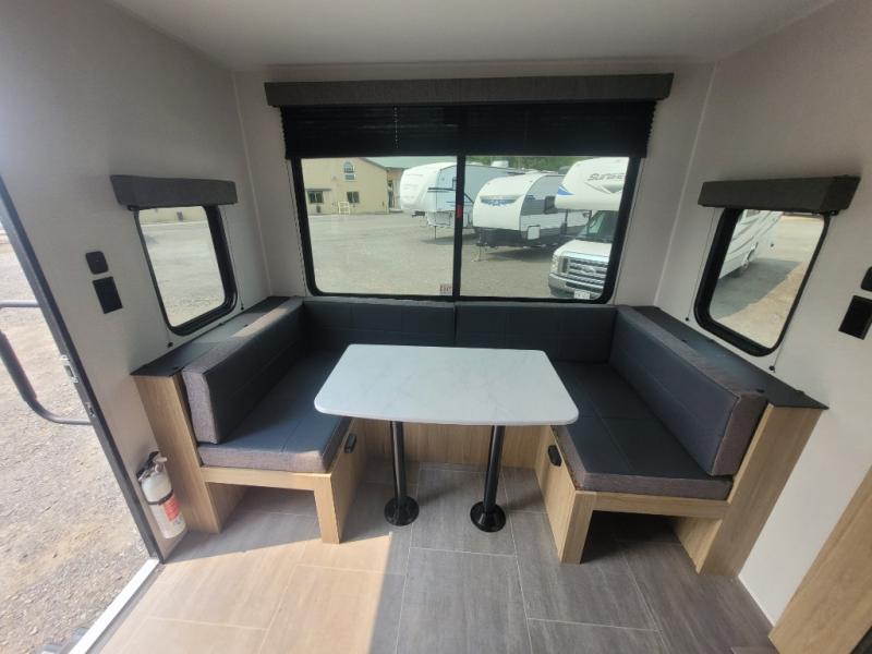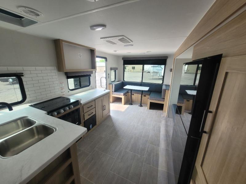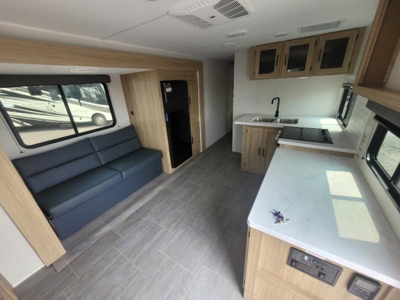 Head to your favorite camping spot in this single slide out travel trailer. You'll find the sofa within the large slide, along with the 12V refrigerator and pantry for food storage. Once dinner is made on the cooktop, your crew can dine around the U-shaped dinette. A spacious full bath will let you freshen up each day, and the front private bedroom is sure to make you feel at home. There is a queen bed, dual bedside wardrobes, plus a third bedroom wardrobe so nothing gets left behind!
