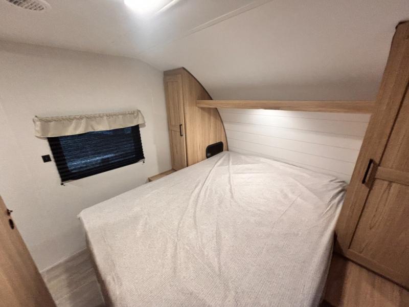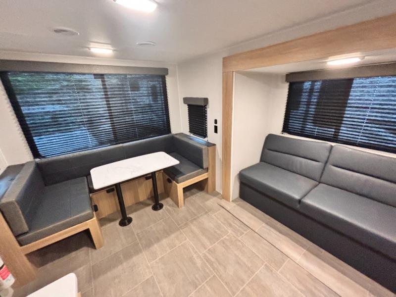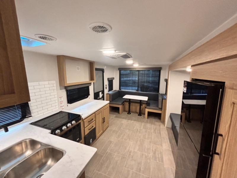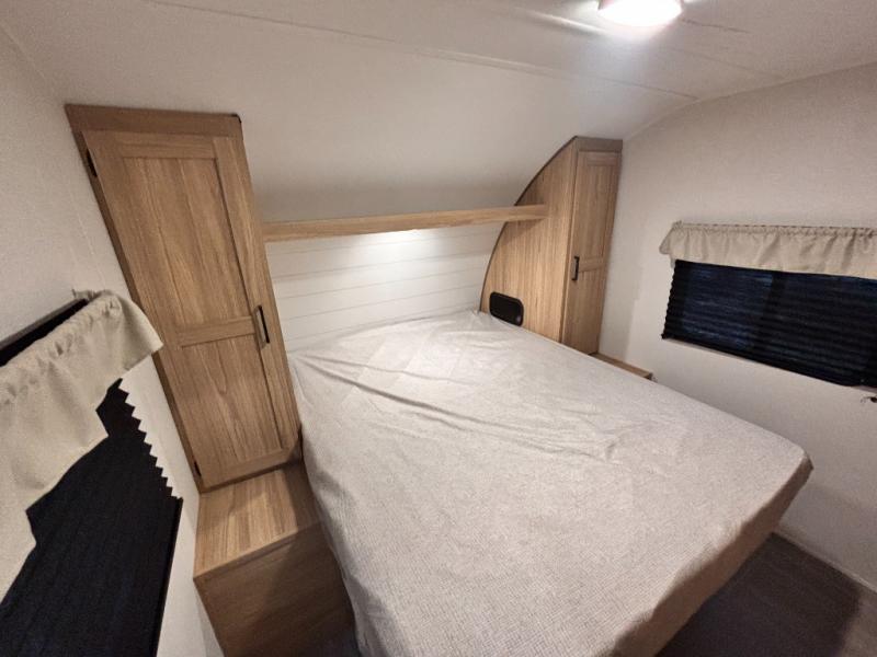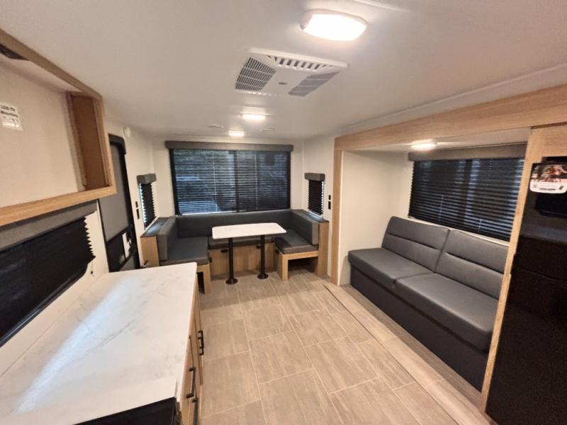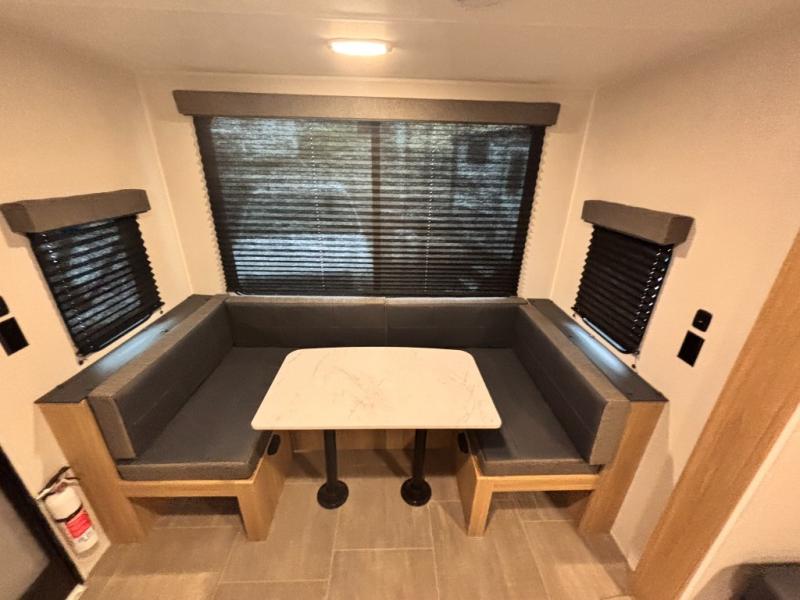 Head to your favorite camping spot in this single slide out travel trailer. You'll find the sofa within the large slide, along with the 12V refrigerator and pantry for food storage. Once dinner is made on the cooktop, your crew can dine around the U-shaped dinette. A spacious full bath will let you freshen up each day, and the front private bedroom is sure to make you feel at home. There is a queen bed, dual bedside wardrobes, plus a third bedroom wardrobe so nothing gets left behind!