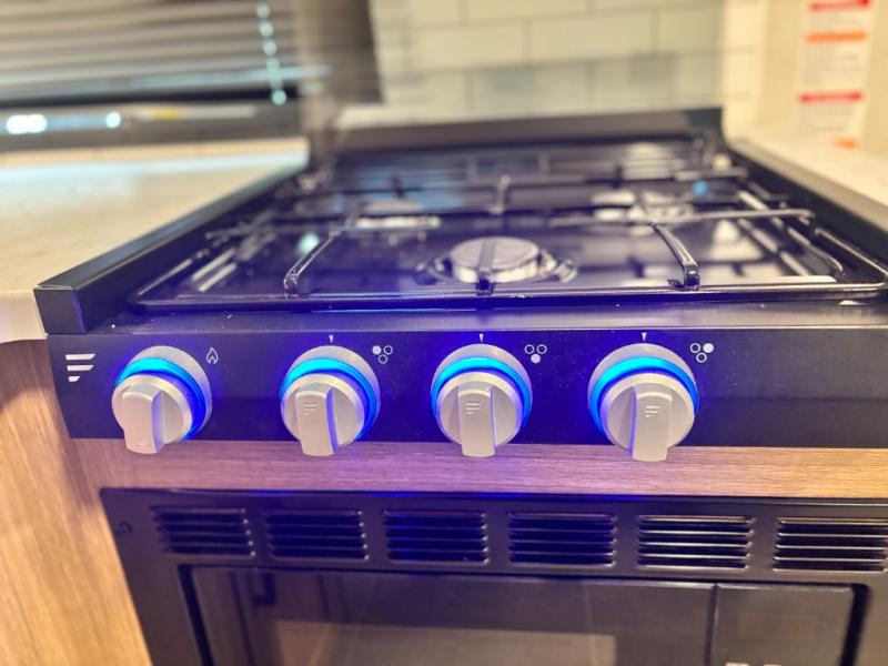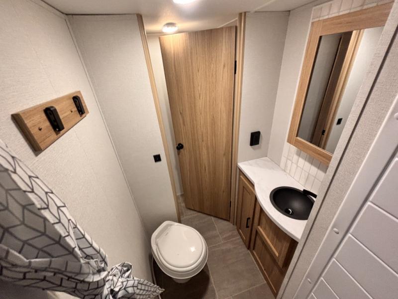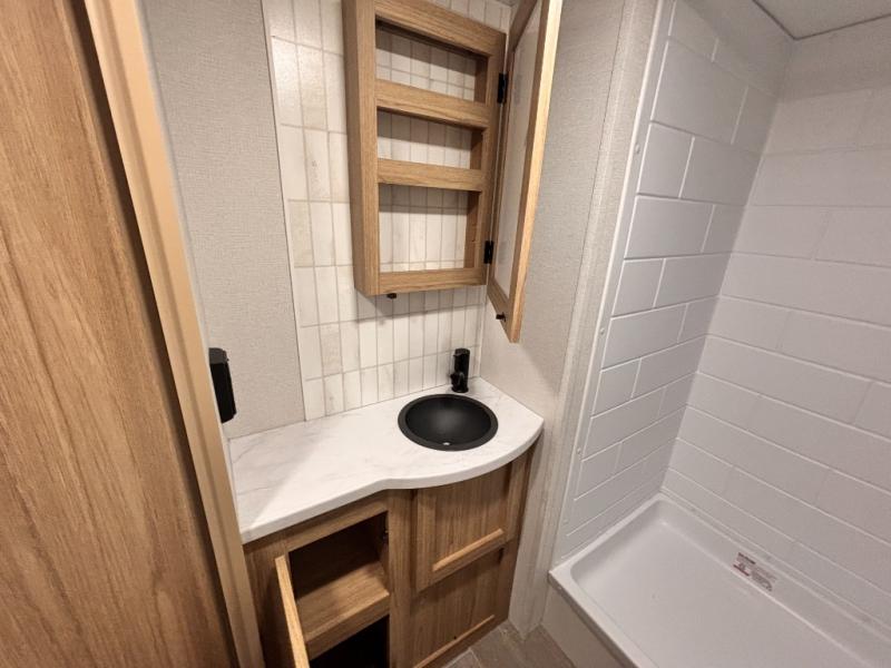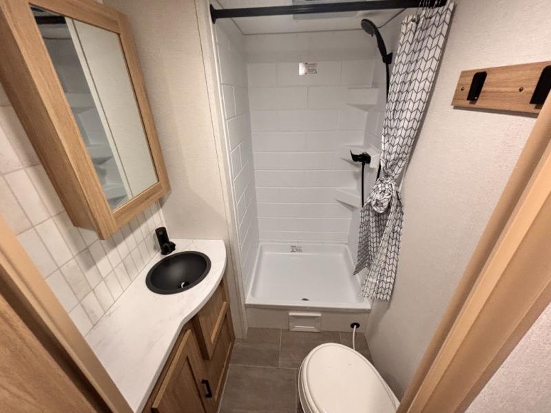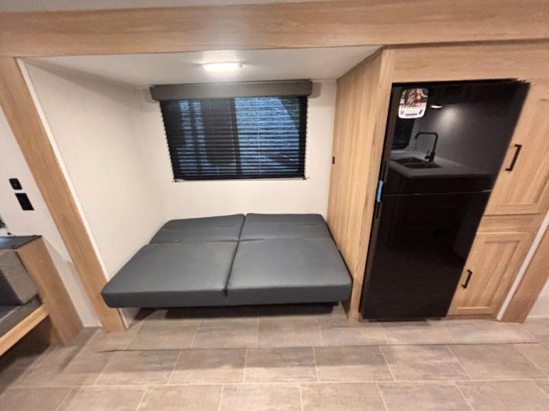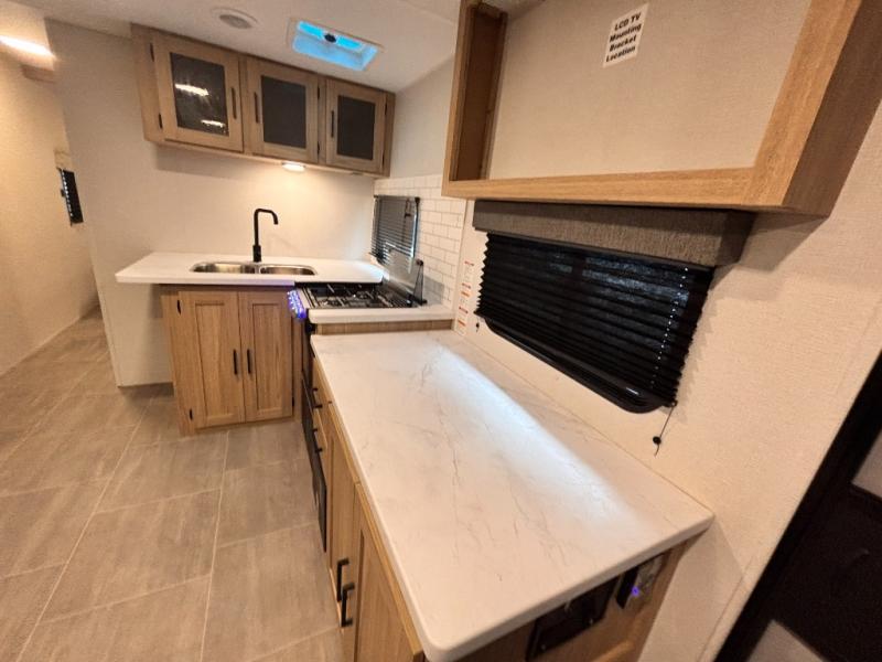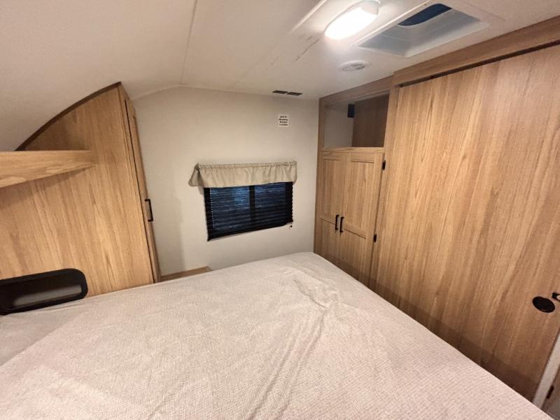 Head to your favorite camping spot in this single slide out travel trailer. You'll find the sofa within the large slide, along with the 12V refrigerator and pantry for food storage. Once dinner is made on the cooktop, your crew can dine around the U-shaped dinette. A spacious full bath will let you freshen up each day, and the front private bedroom is sure to make you feel at home. There is a queen bed, dual bedside wardrobes, plus a third bedroom wardrobe so nothing gets left behind!