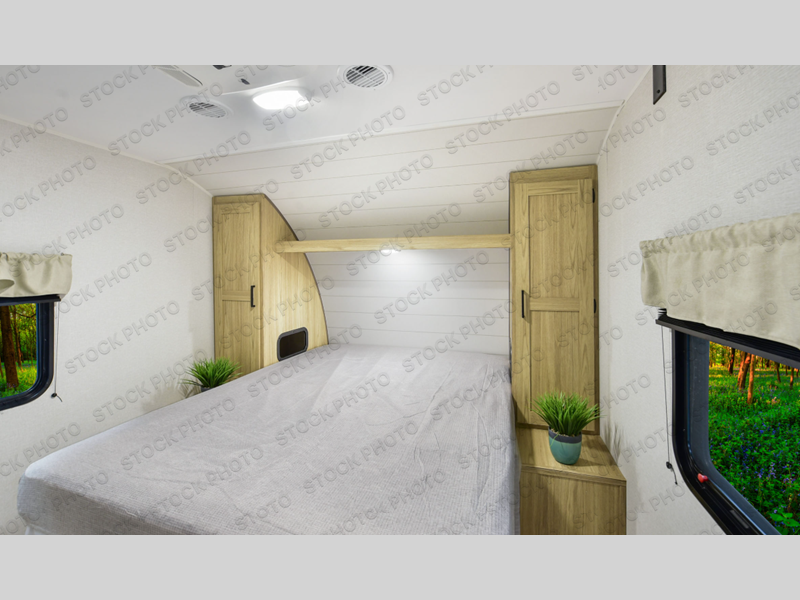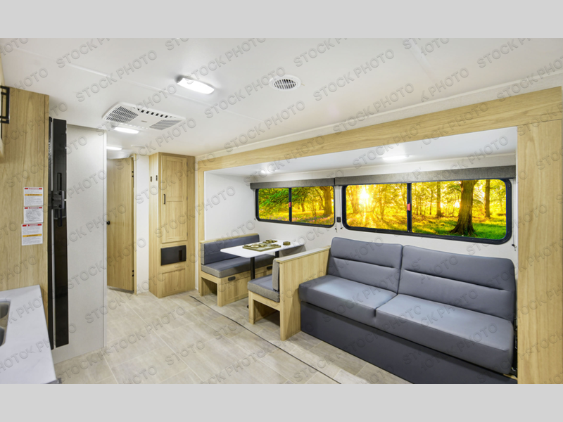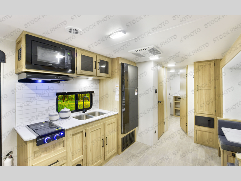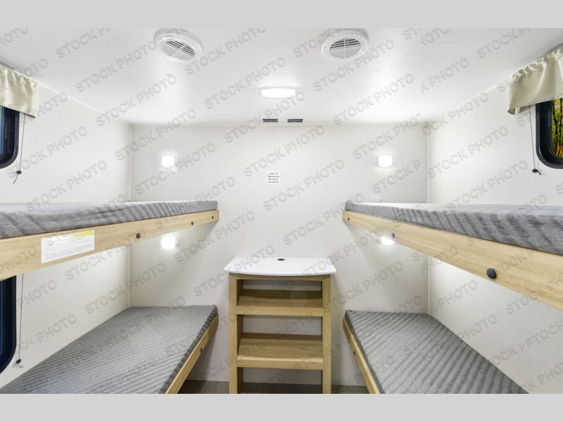 The littles ones will love camping in this travel trailer since there is a rear private bunkhouse with four bunks, a wardrobe, plus shelves to keep their things tidy. A full kitchen, complete with a cooktop, microwave, and 12V refrigerator will let you cook and store food, and a booth dinette provides a place to dine together. There is also a sofa where you can relax in the evenings if you're not outdoors under the 17' power awning. And when it's time to call it a night, you can head to the front private bedroom for a great night's rest on the queen bed!