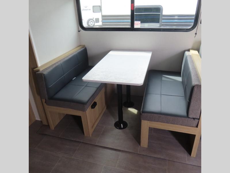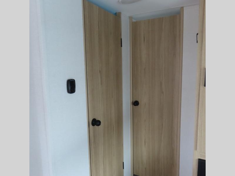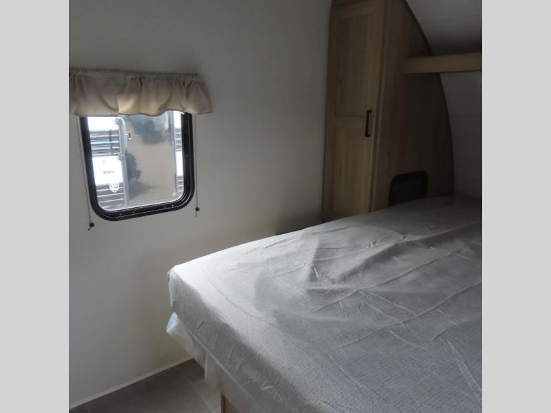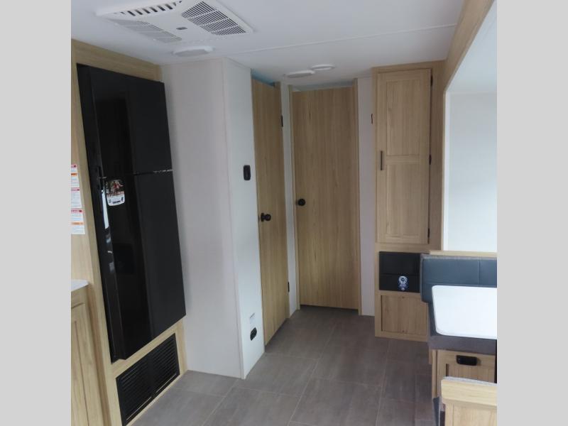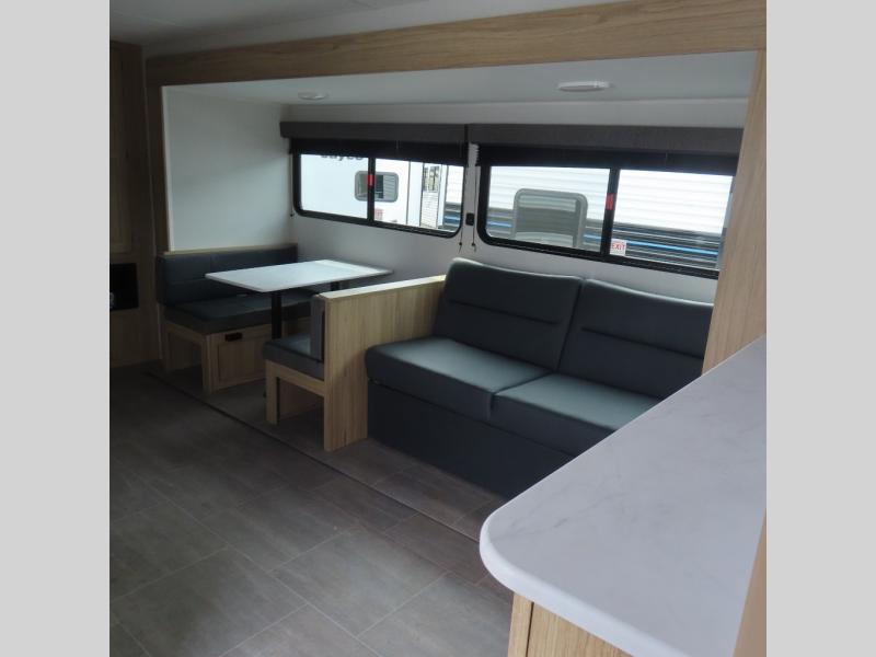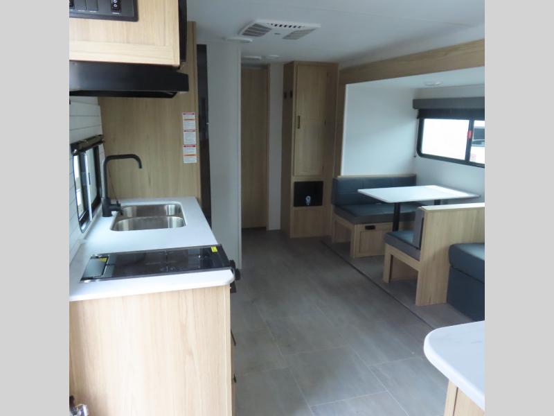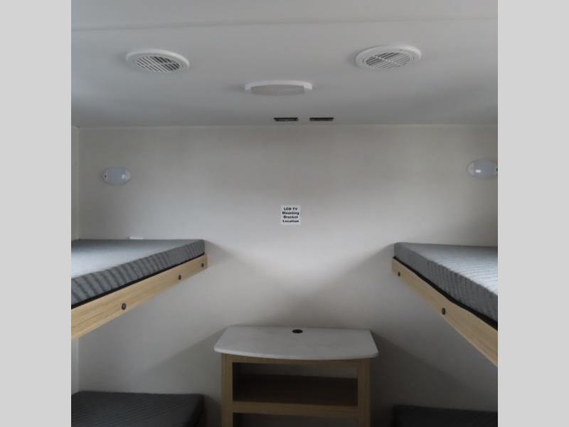 The littles ones will love camping in this travel trailer since there is a rear private bunkhouse with four bunks, a wardrobe, plus shelves to keep their things tidy. A full kitchen, complete with a cooktop, microwave, and 12V refrigerator will let you cook and store food, and a booth dinette provides a place to dine together. There is also a sofa where you can relax in the evenings if you're not outdoors under the 17' power awning. And when it's time to call it a night, you can head to the front private bedroom for a great night's rest on the queen bed!