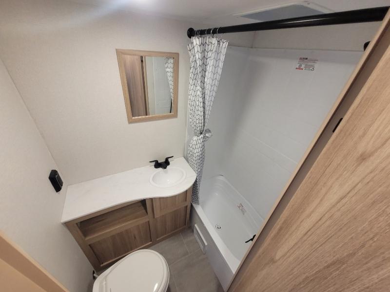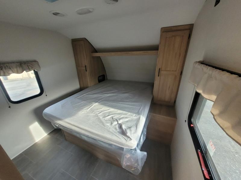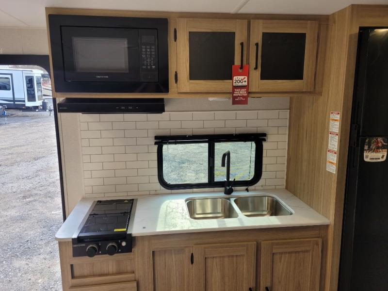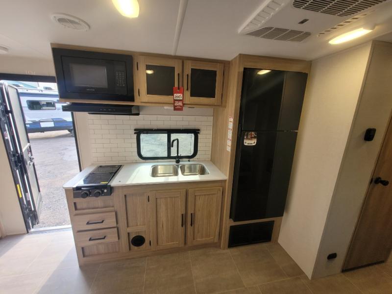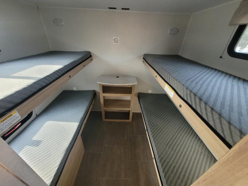 The littles ones will love camping in this travel trailer since there is a rear private bunkhouse with four bunks, a wardrobe, plus shelves to keep their things tidy. A full kitchen, complete with a cooktop, microwave, and 12V refrigerator will let you cook and store food, and a booth dinette provides a place to dine together. There is also a sofa where you can relax in the evenings if you're not outdoors under the 17' power awning. And when it's time to call it a night, you can head to the front private bedroom for a great night's rest on the queen bed!