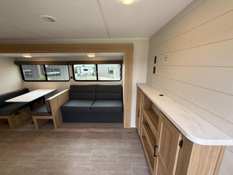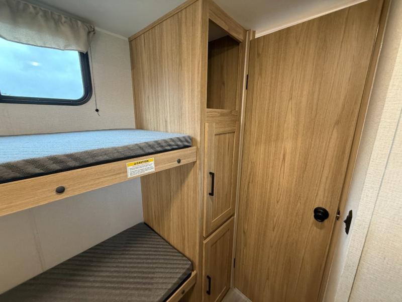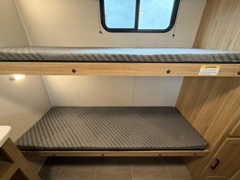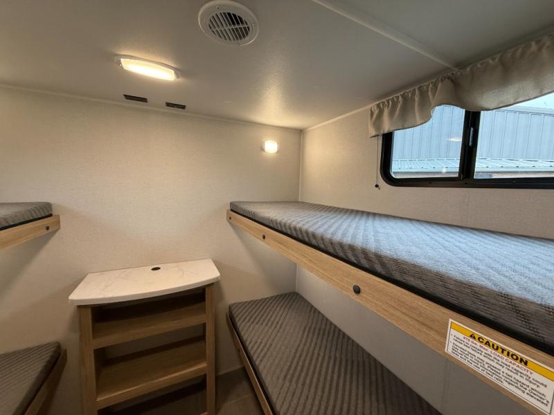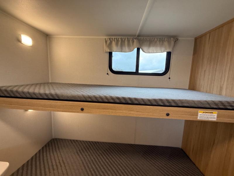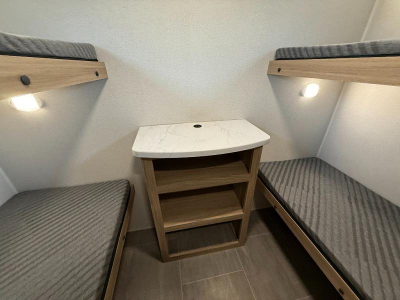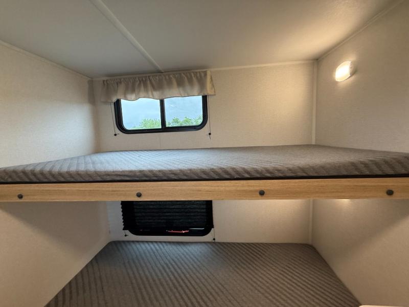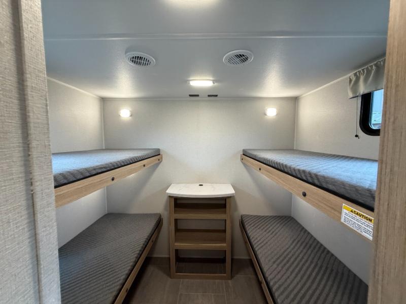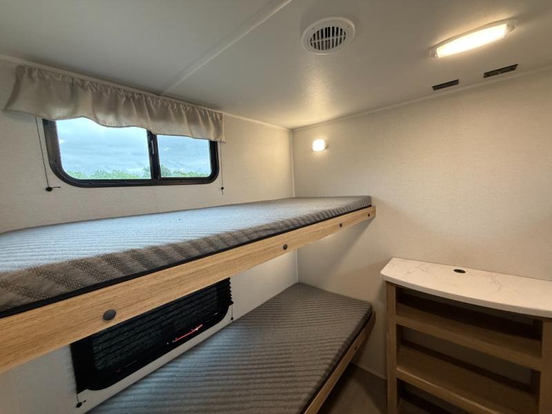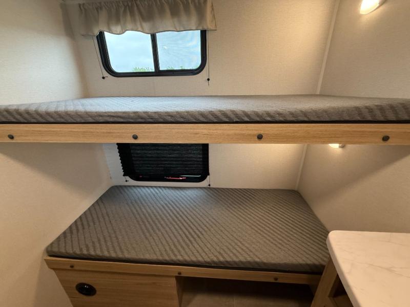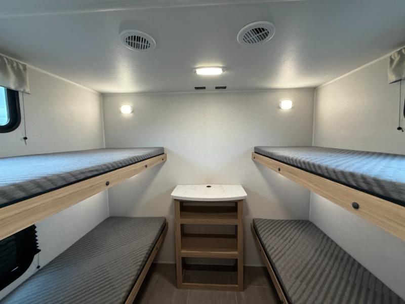The littles ones will love camping in this travel trailer since there is a rear private bunkhouse with four bunks, a wardrobe, plus shelves to keep their things tidy. A full kitchen, complete with a cooktop, microwave, and 12V refrigerator will let you cook and store food, and a booth dinette provides a place to dine together. There is also a sofa where you can relax in the evenings if you're not outdoors under the 17' power awning. And when it's time to call it a night, you can head to the front private bedroom for a great night's rest on the queen bed!