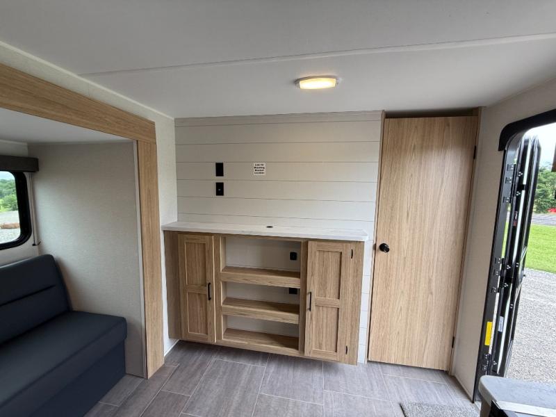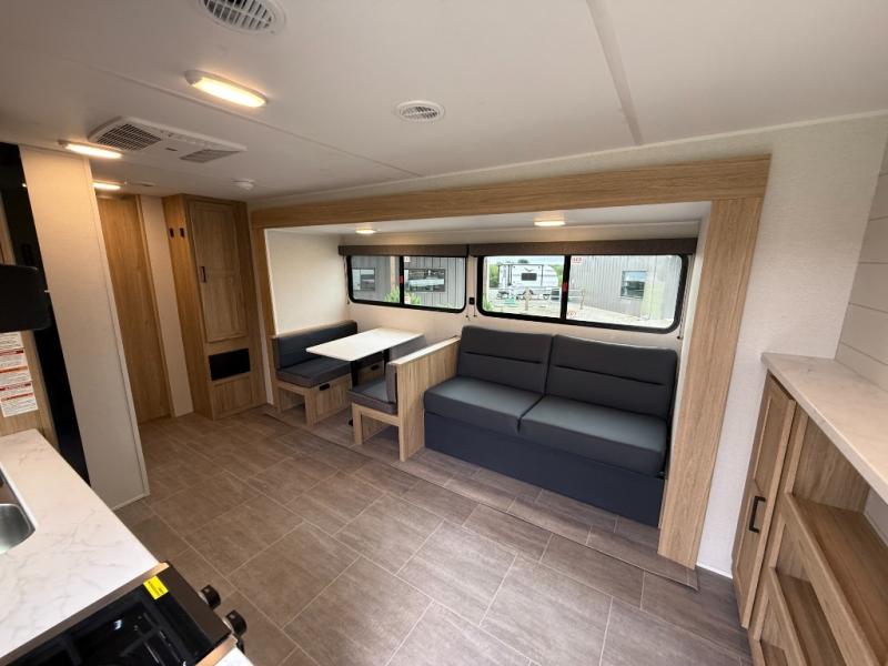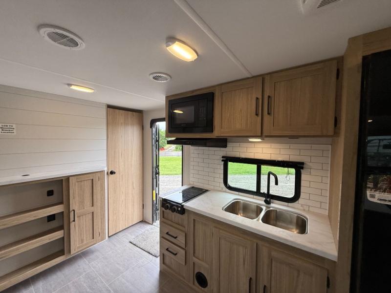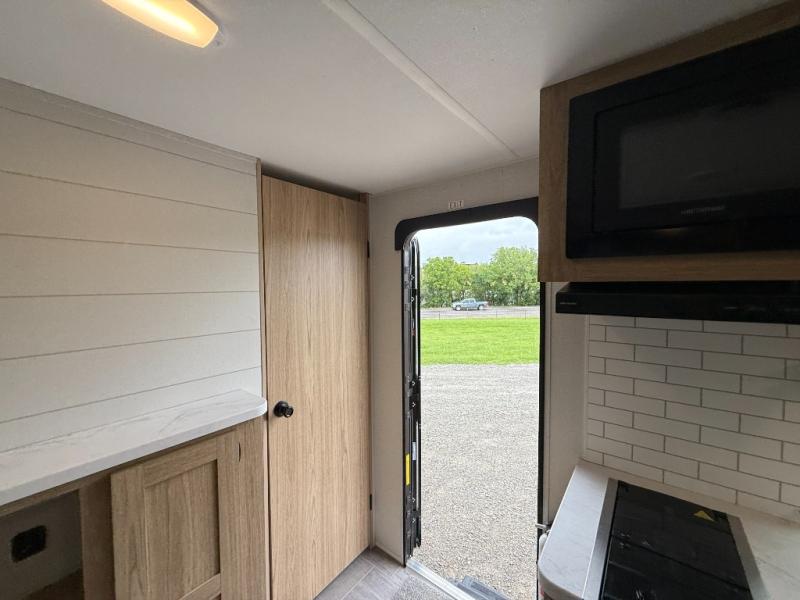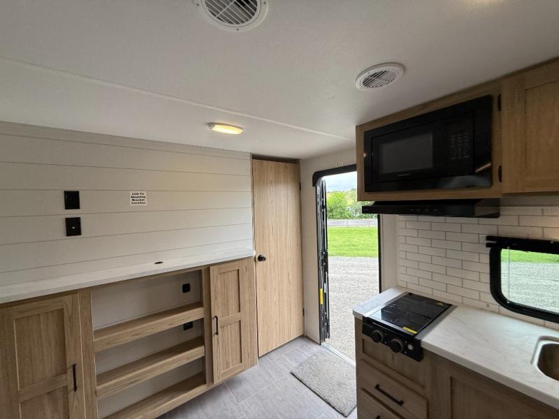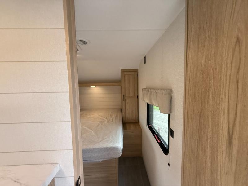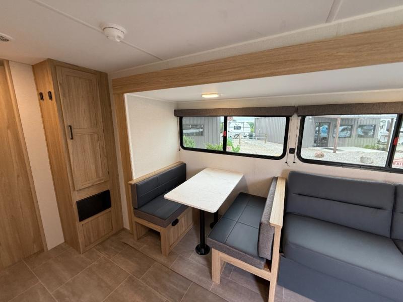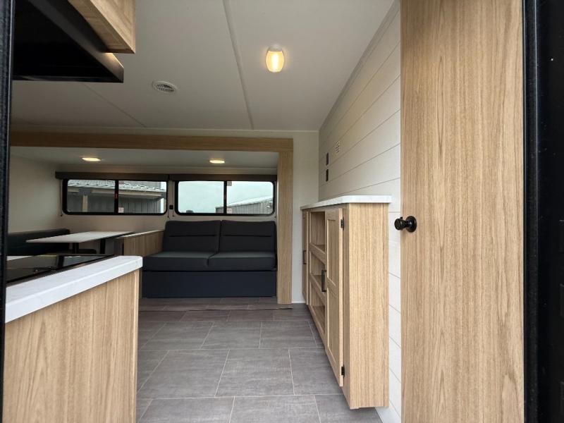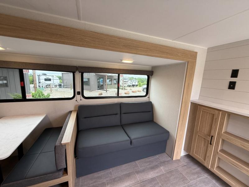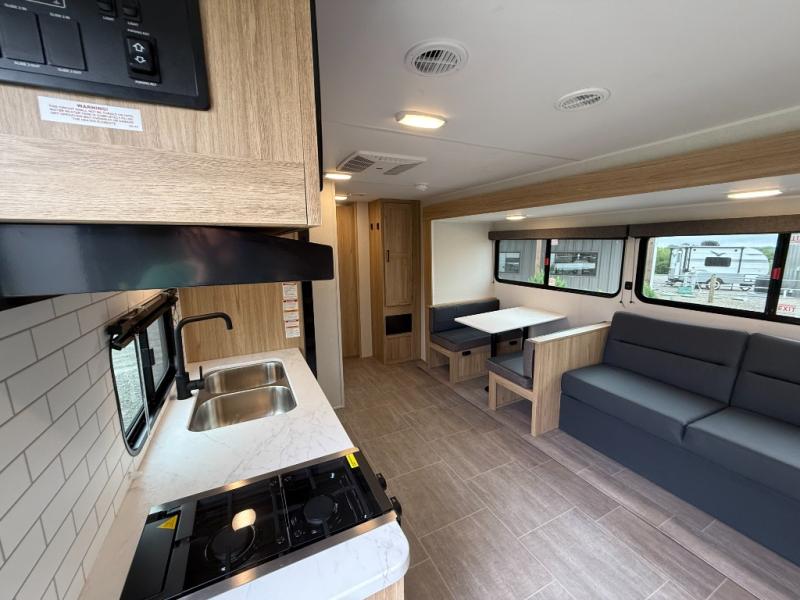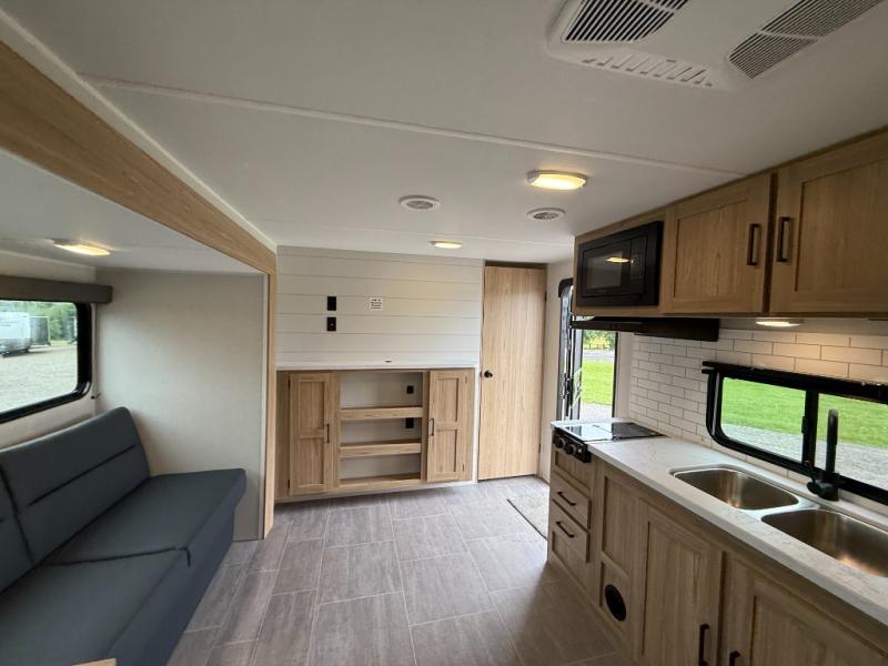 The littles ones will love camping in this travel trailer since there is a rear private bunkhouse with four bunks, a wardrobe, plus shelves to keep their things tidy. A full kitchen, complete with a cooktop, microwave, and 12V refrigerator will let you cook and store food, and a booth dinette provides a place to dine together. There is also a sofa where you can relax in the evenings if you're not outdoors under the 17' power awning. And when it's time to call it a night, you can head to the front private bedroom for a great night's rest on the queen bed!