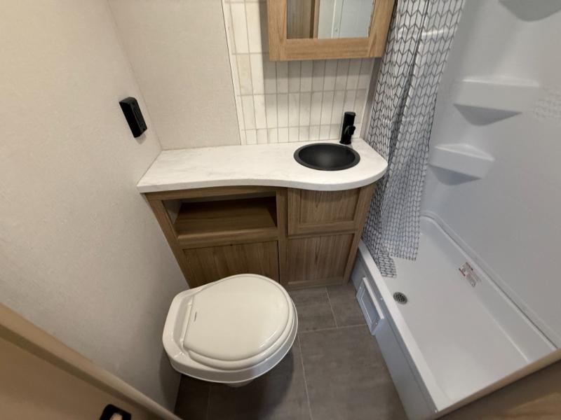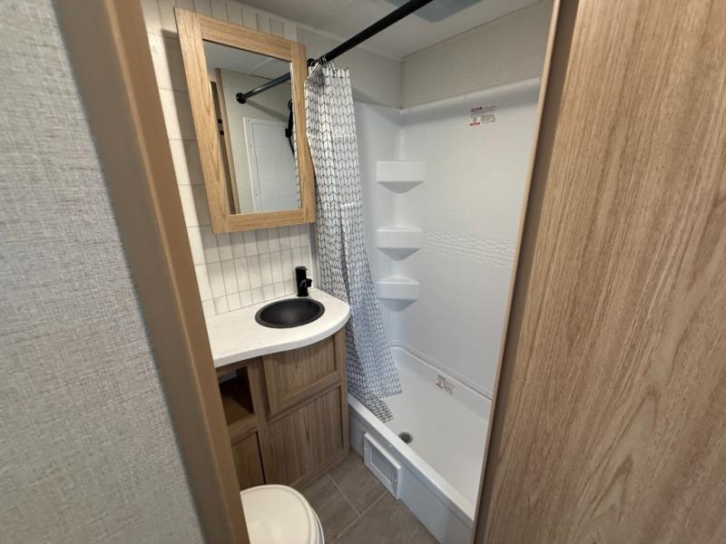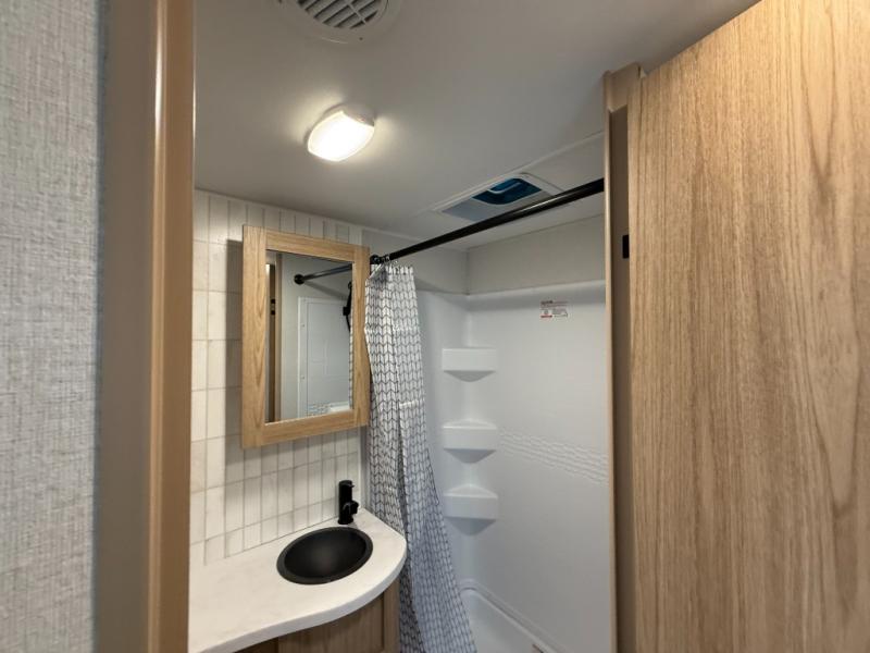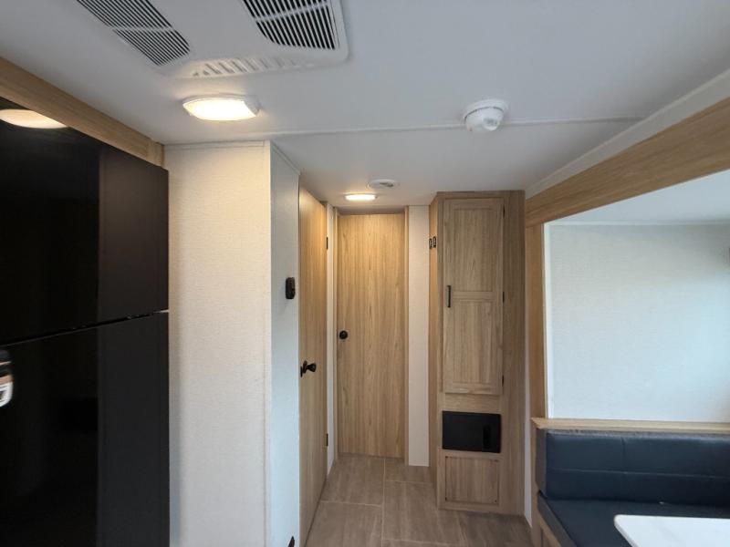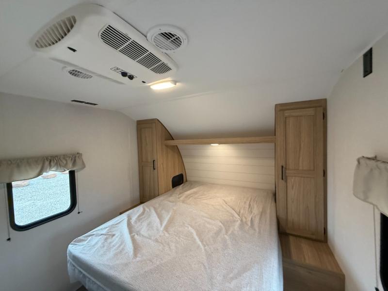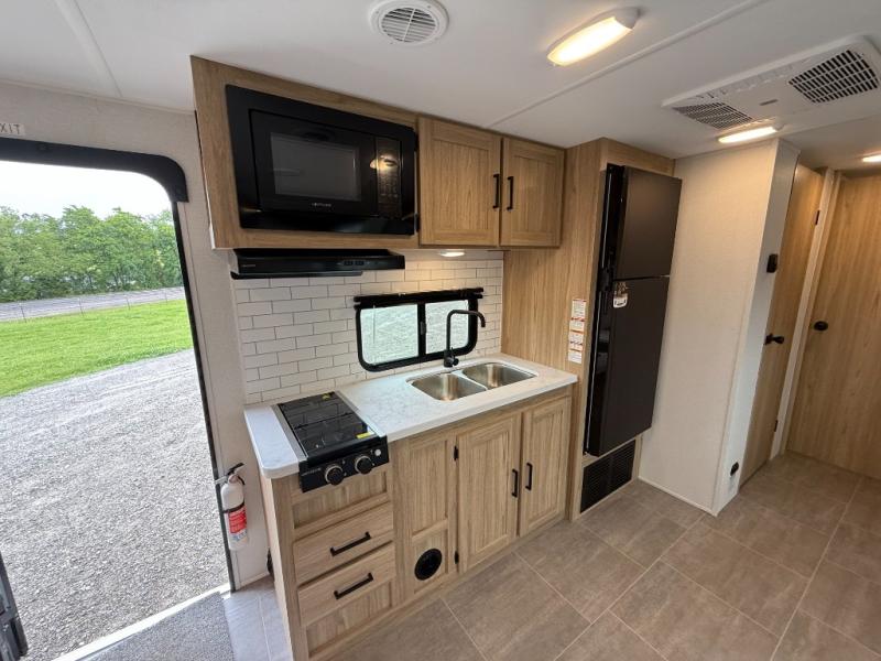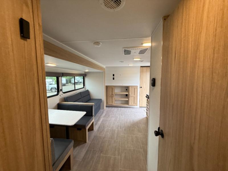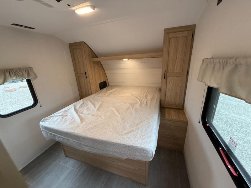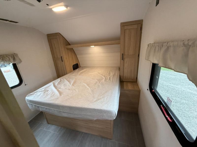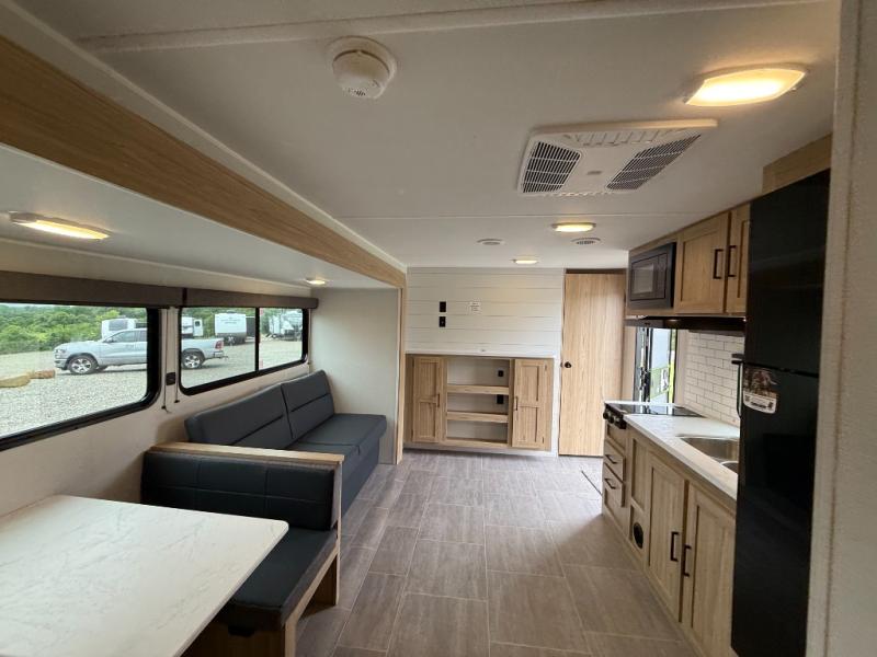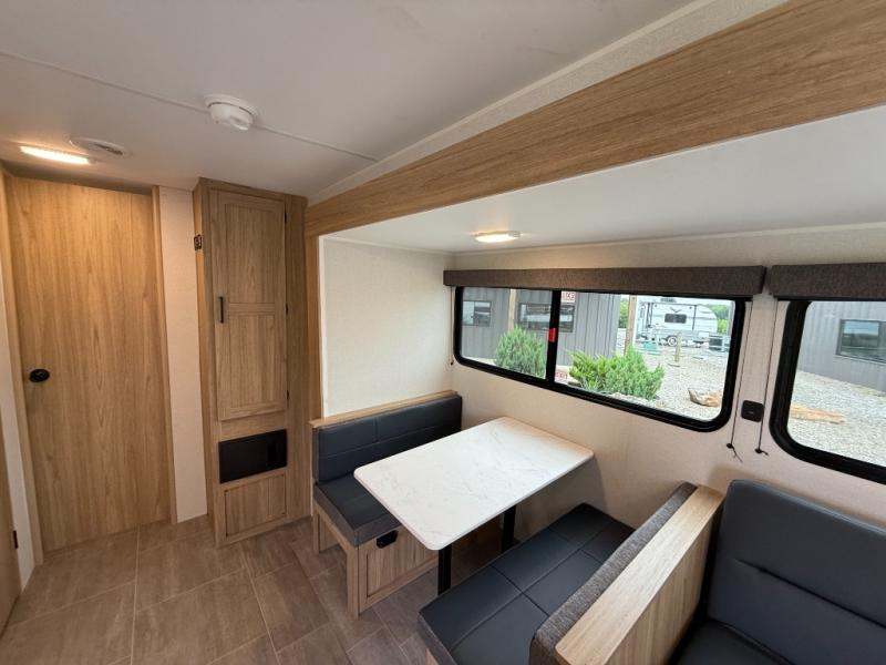 The littles ones will love camping in this travel trailer since there is a rear private bunkhouse with four bunks, a wardrobe, plus shelves to keep their things tidy. A full kitchen, complete with a cooktop, microwave, and 12V refrigerator will let you cook and store food, and a booth dinette provides a place to dine together. There is also a sofa where you can relax in the evenings if you're not outdoors under the 17' power awning. And when it's time to call it a night, you can head to the front private bedroom for a great night's rest on the queen bed!