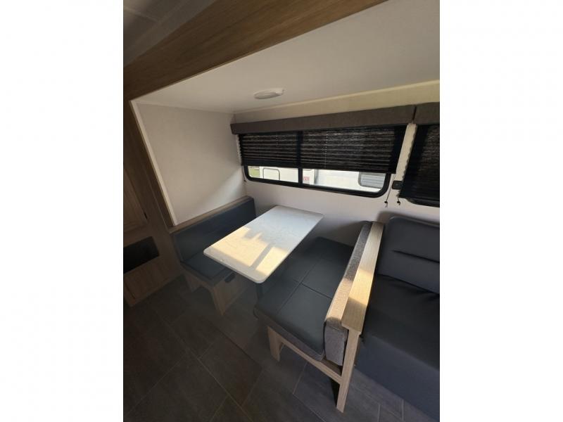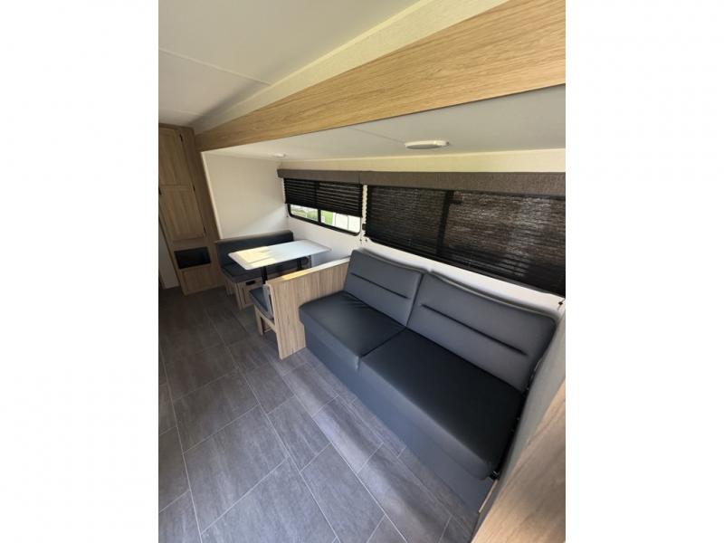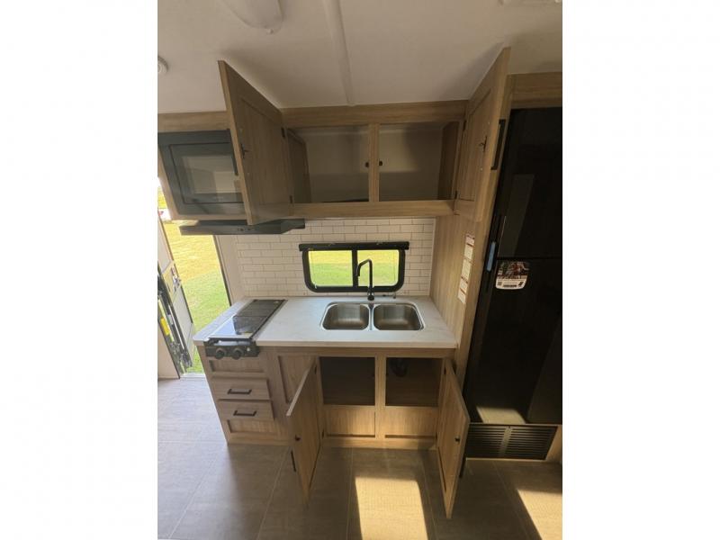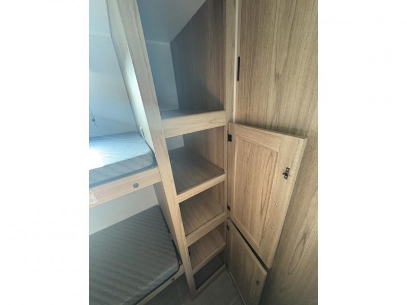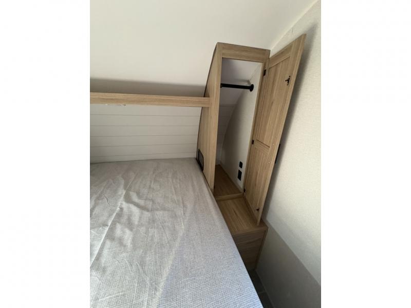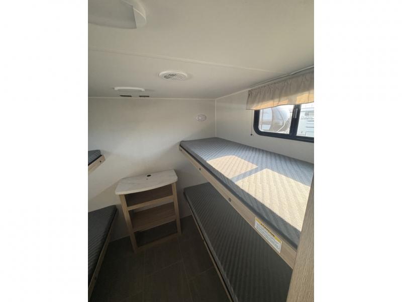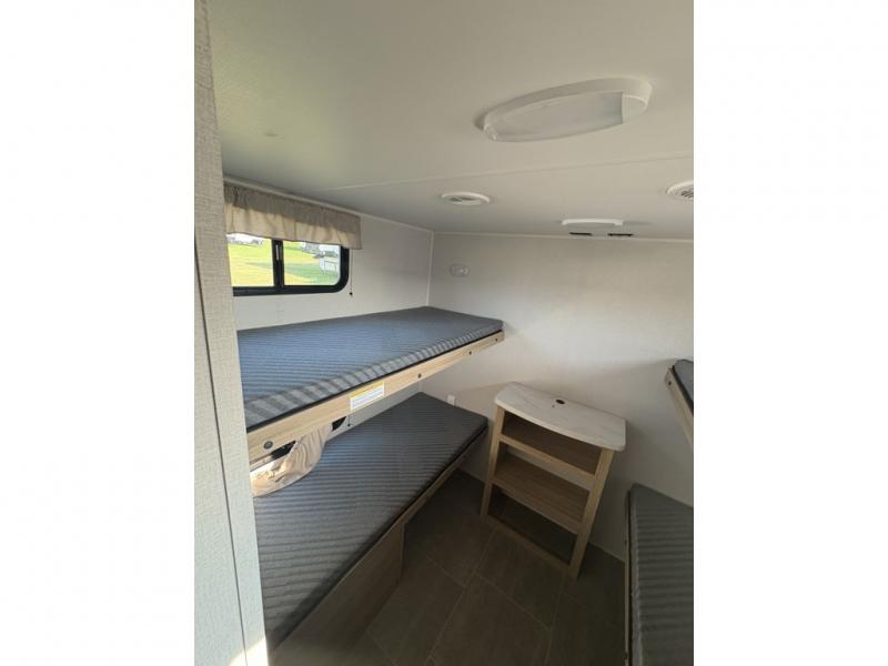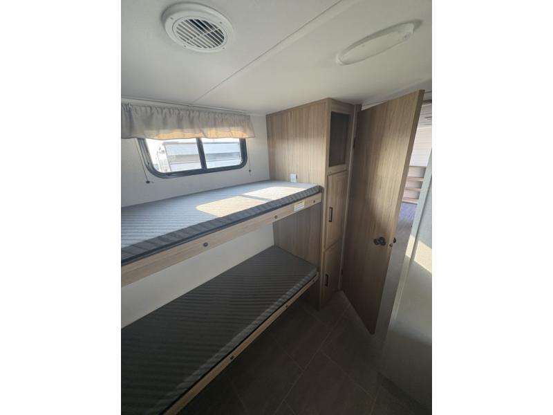 The littles ones will love camping in this travel trailer since there is a rear private bunkhouse with four bunks, a wardrobe, plus shelves to keep their things tidy. A full kitchen, complete with a cooktop, microwave, and 12V refrigerator will let you cook and store food, and a booth dinette provides a place to dine together. There is also a sofa where you can relax in the evenings if you're not outdoors under the 17' power awning. And when it's time to call it a night, you can head to the front private bedroom for a great night's rest on the queen bed!