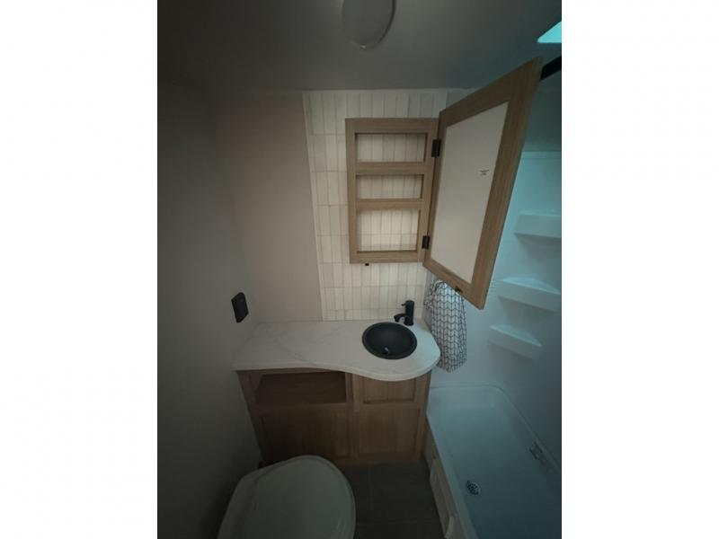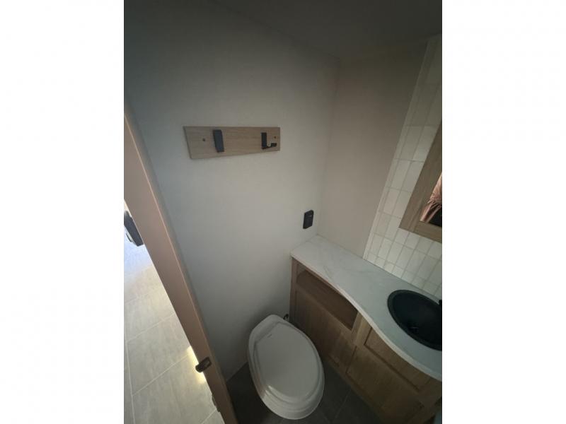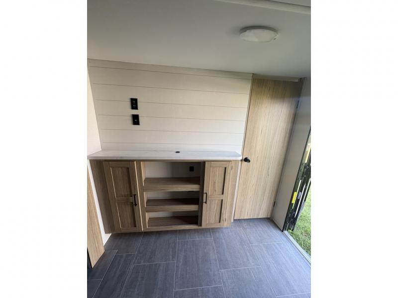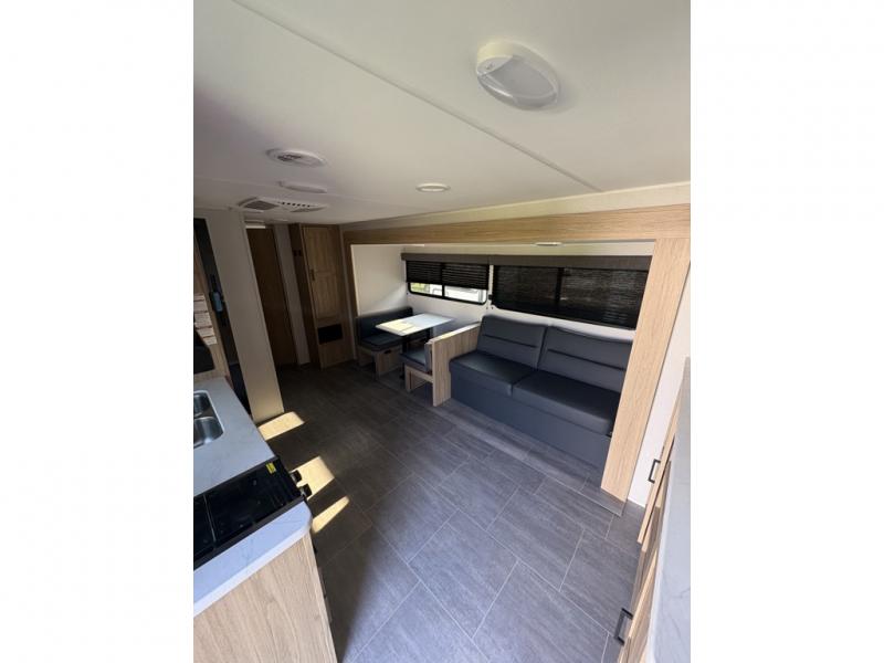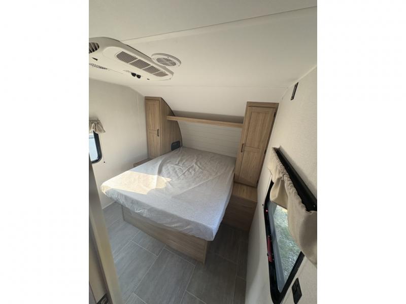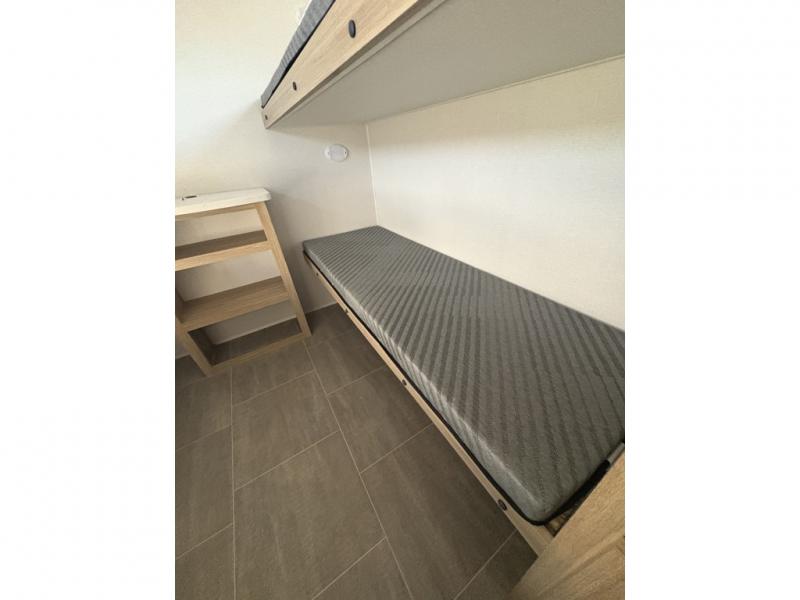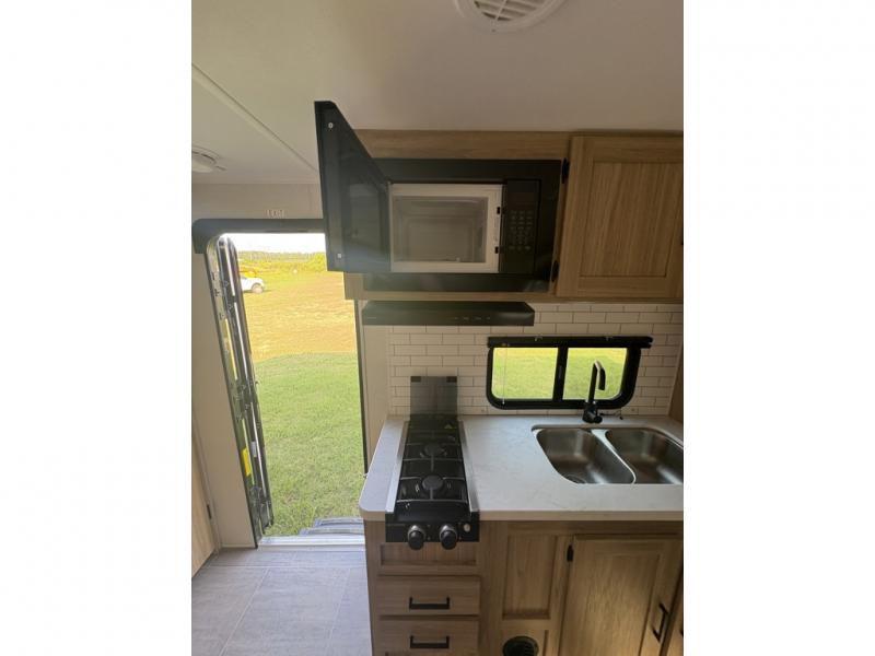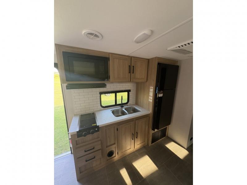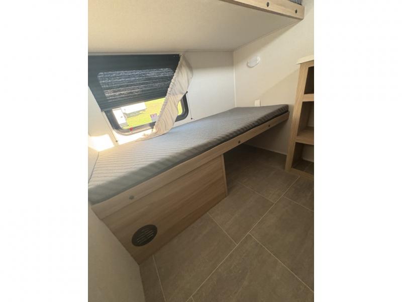 The littles ones will love camping in this travel trailer since there is a rear private bunkhouse with four bunks, a wardrobe, plus shelves to keep their things tidy. A full kitchen, complete with a cooktop, microwave, and 12V refrigerator will let you cook and store food, and a booth dinette provides a place to dine together. There is also a sofa where you can relax in the evenings if you're not outdoors under the 17' power awning. And when it's time to call it a night, you can head to the front private bedroom for a great night's rest on the queen bed!