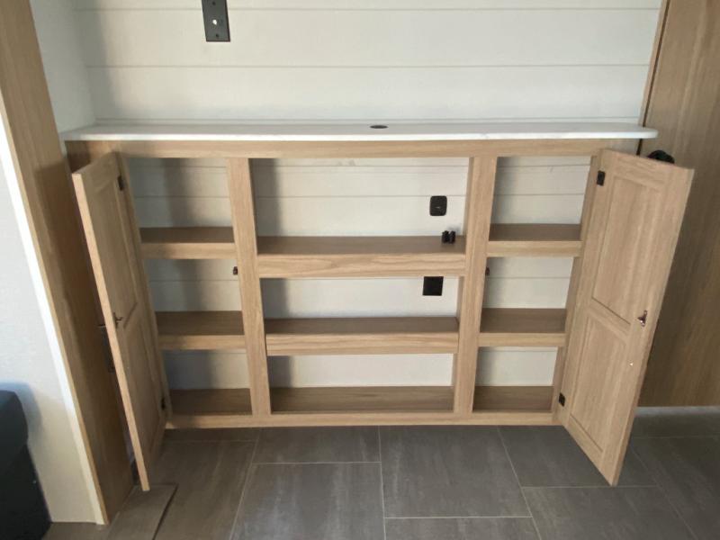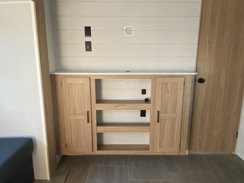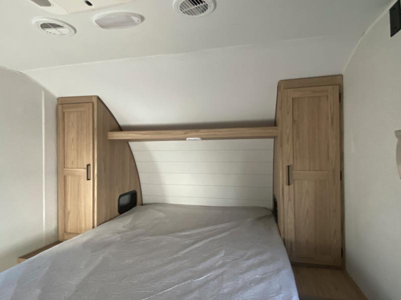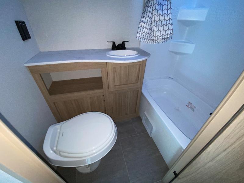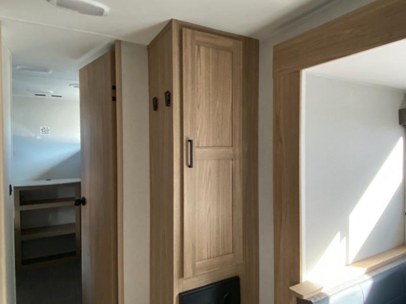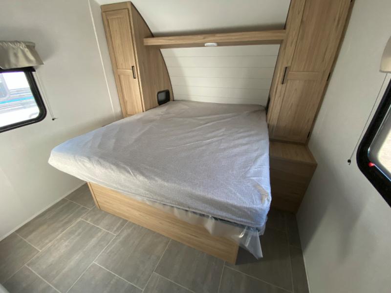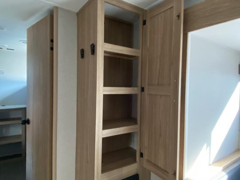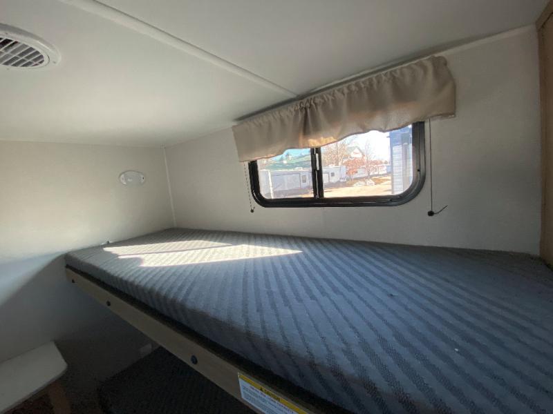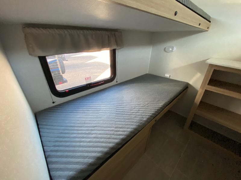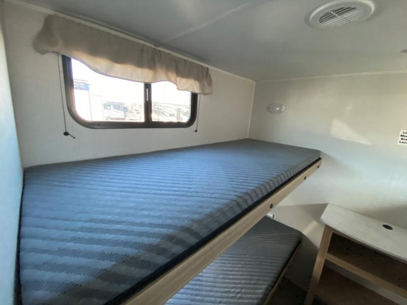 The littles ones will love camping in this travel trailer since there is a rear private bunkhouse with four bunks, a wardrobe, plus shelves to keep their things tidy. A full kitchen, complete with a cooktop, microwave, and 12V refrigerator will let you cook and store food, and a booth dinette provides a place to dine together. There is also a sofa where you can relax in the evenings if you're not outdoors under the 17' power awning. And when it's time to call it a night, you can head to the front private bedroom for a great night's rest on the queen bed!