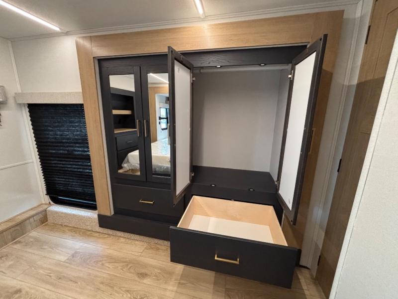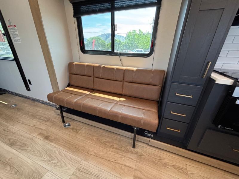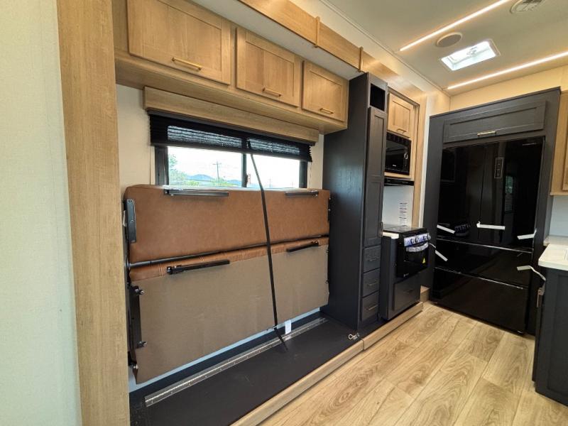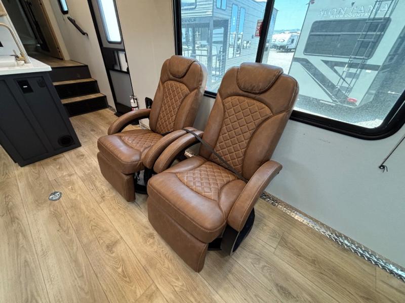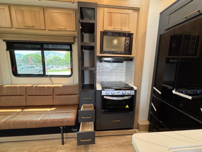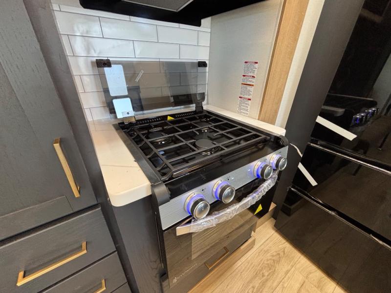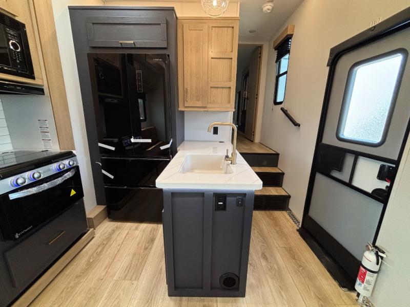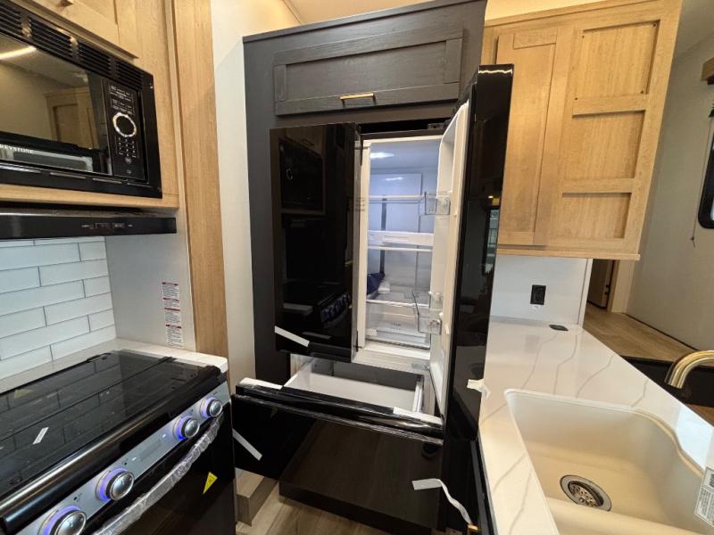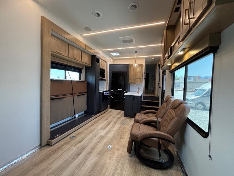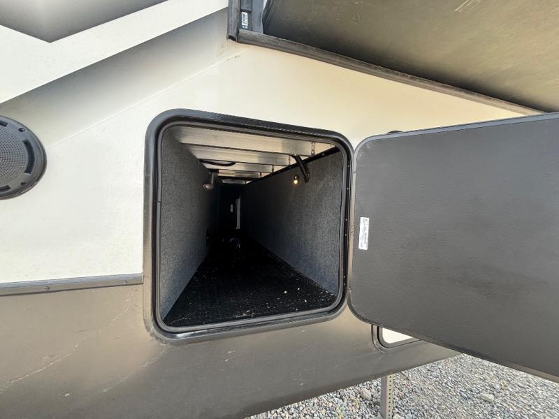 This toy hauler has an open concept to create maximum interior space when set up at the campground! The whole family will have comfortable places to sleep between the 70" x 74" king bed slide across from a wardrobe slide in the front private bedroom, and the electric queen bed above the convertible sofa. Next to the pantry and three burner range is a sofa with a flip up floor all housed in the slide. The two recliners by the entertainment center offer a comfortable place to relax after a fun day on the trails. You can also rinse the mud out of your hair in the full bathroom in the spacious bathtub with a skylight above for added natural lighting. The outdoor Griddle & Go lets you fry up some delicious fish while staying protected under the 18' electric awning. If you want even more convenience then you can add the optional ramp door patio with a rear electric awning and LED lights to create the perfect gathering spot at night!