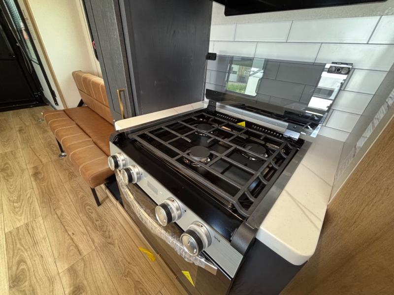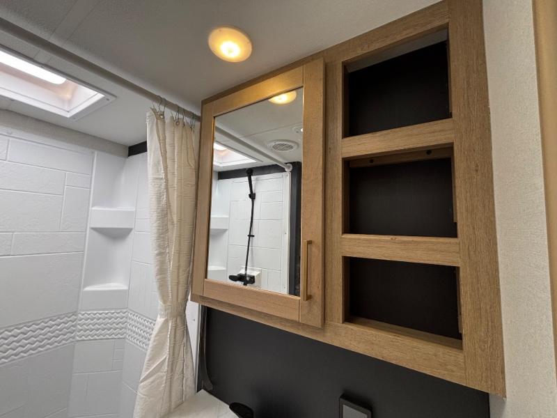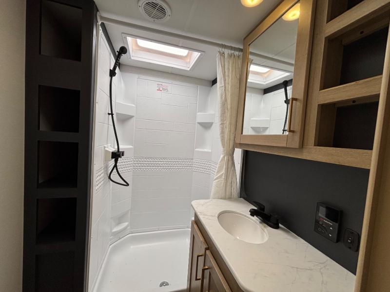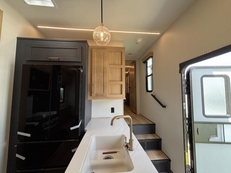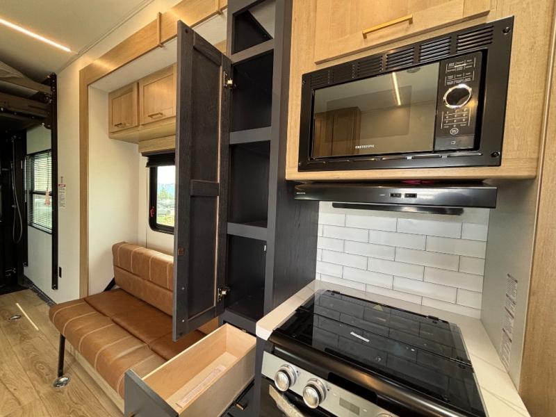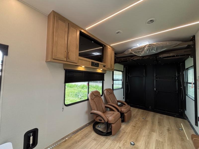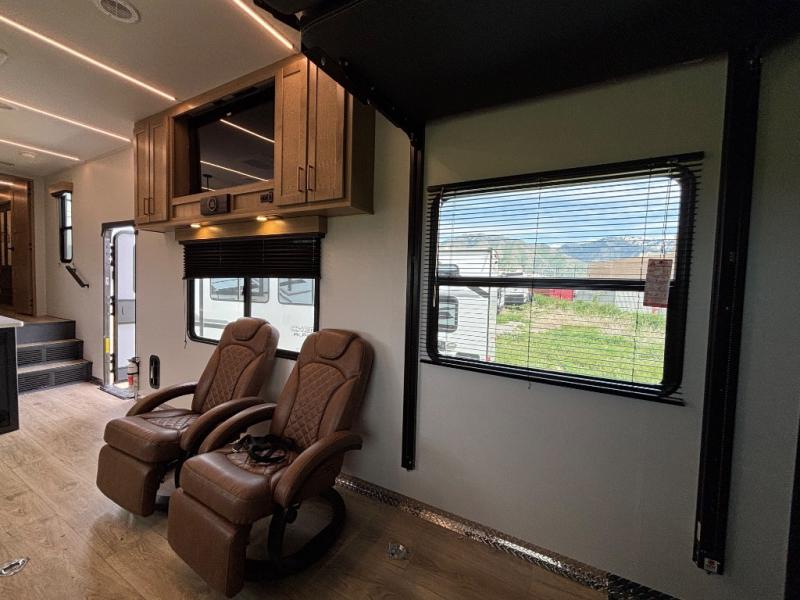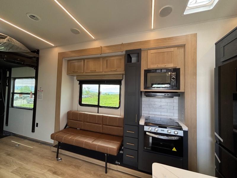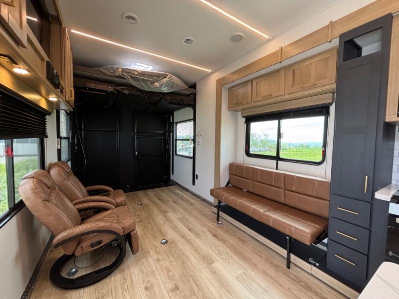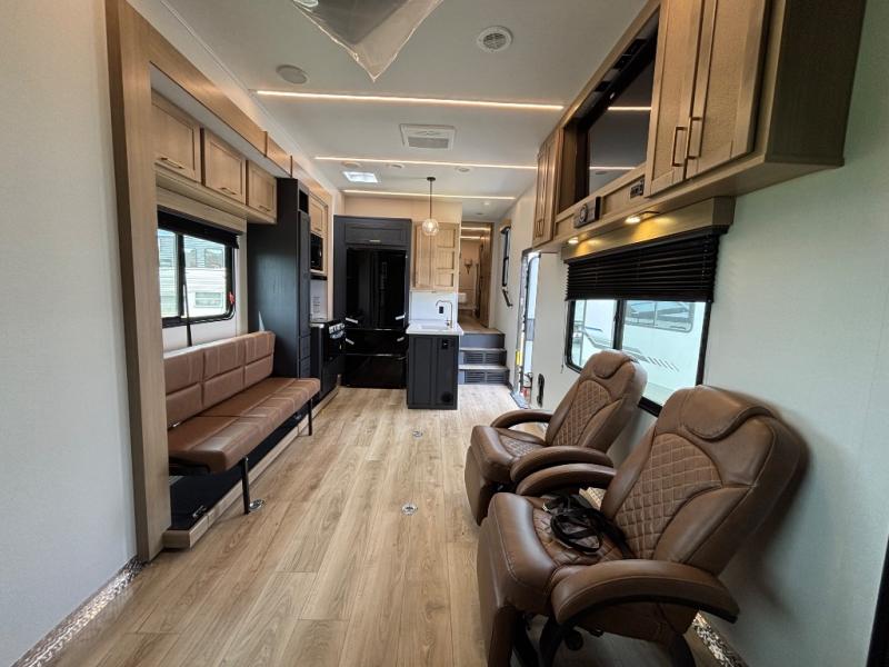 In the central living area, you’ll find theater seating, a large entertainment center, and modern finishes. The kitchen includes solid-surface countertops, a large refrigerator, three-burner cooktop, oven, microwave, and pantry — providing everything needed for meals on the road.