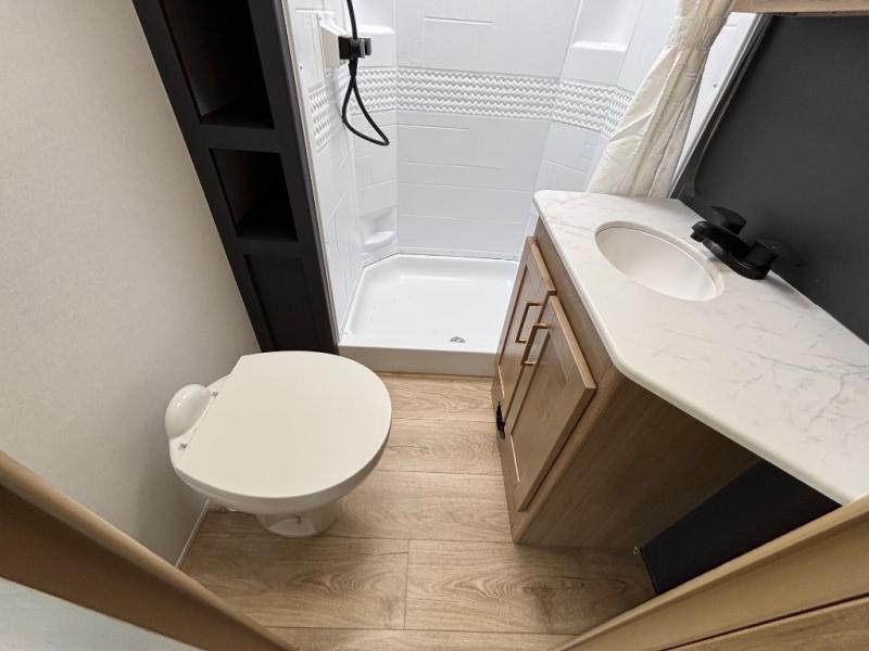 The front king master suite gives you a spacious retreat with wardrobe storage, while the loft offers additional sleeping space. The bathroom features a residential-style shower, toilet, vanity, and storage, giving you full convenience wherever your adventures take you.