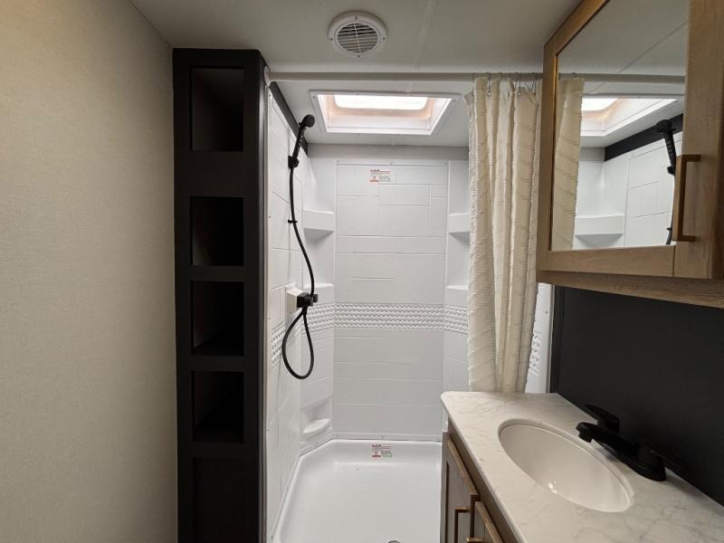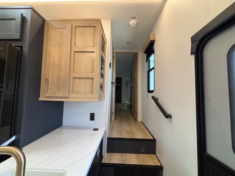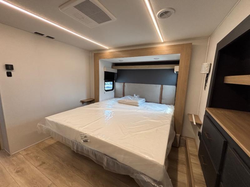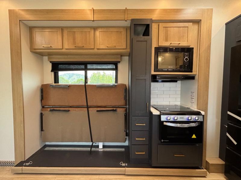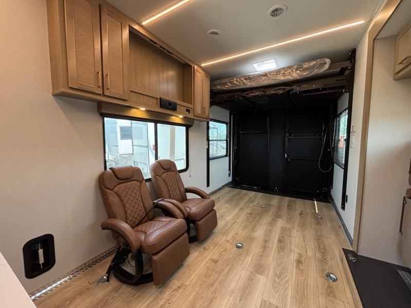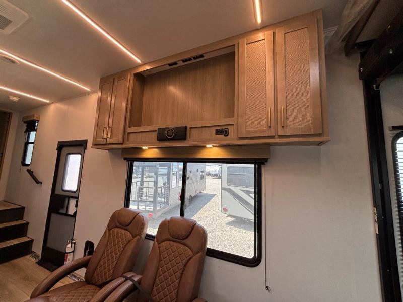 In the central living area, you’ll find theater seating, a large entertainment center, and modern finishes. The kitchen includes solid-surface countertops, a large refrigerator, three-burner cooktop, oven, microwave, and pantry — providing everything needed for meals on the road.