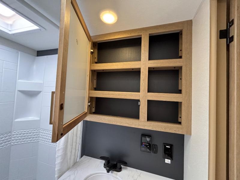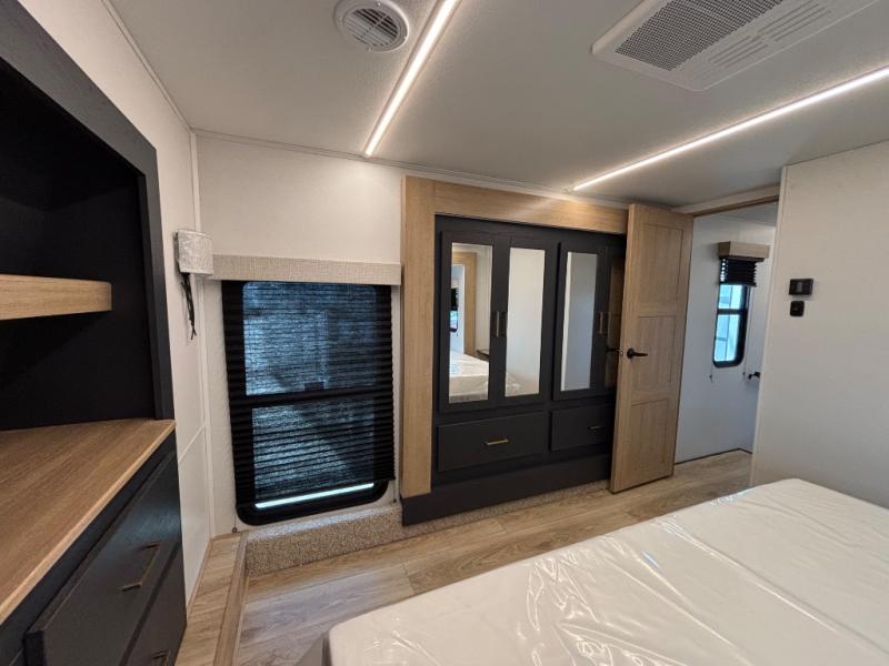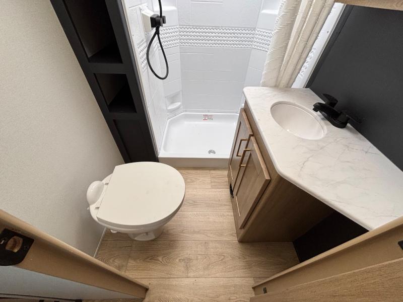 The front king master suite gives you a spacious retreat with wardrobe storage, while the loft offers additional sleeping space. The bathroom features a residential-style shower, toilet, vanity, and storage, giving you full convenience wherever your adventures take you.