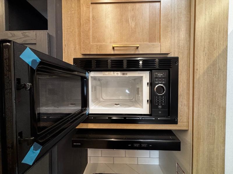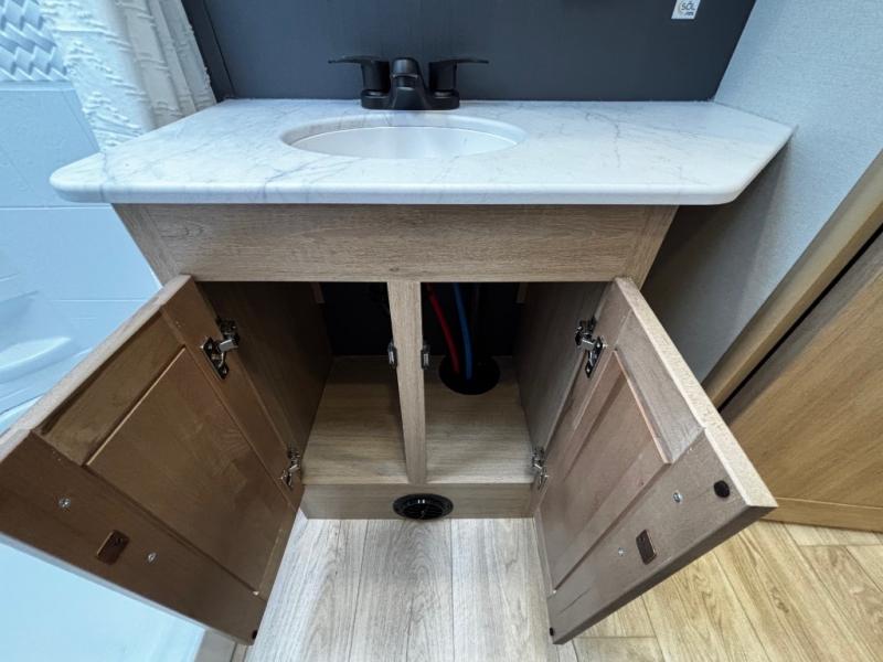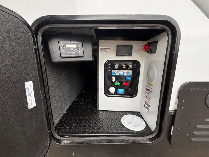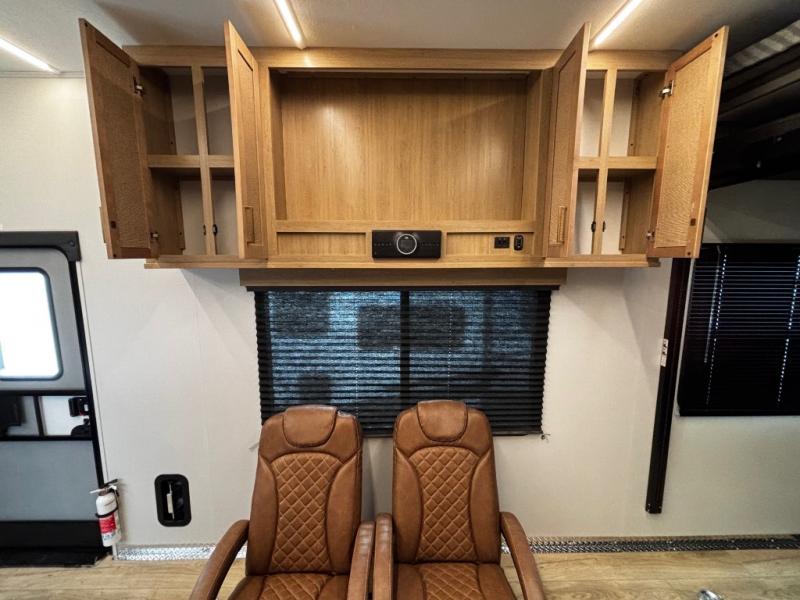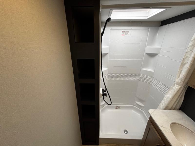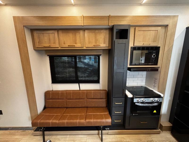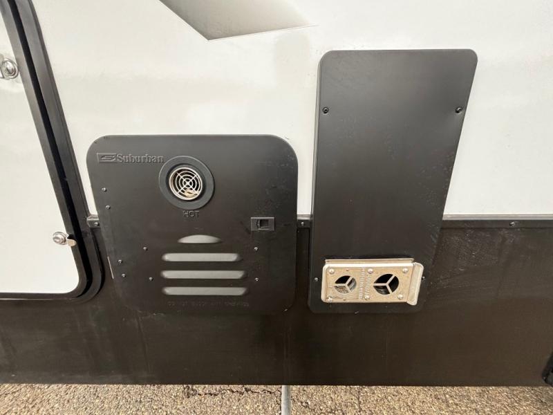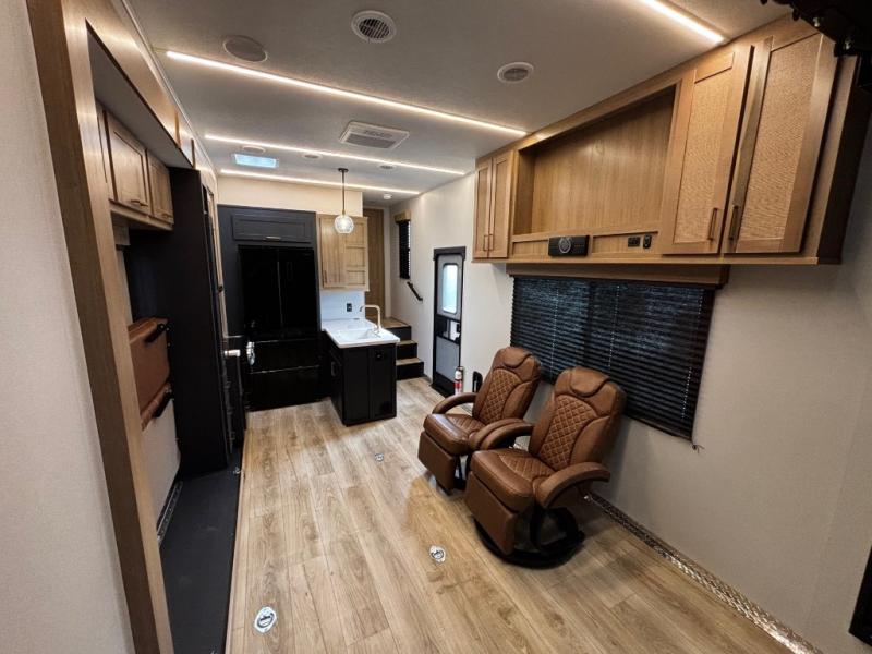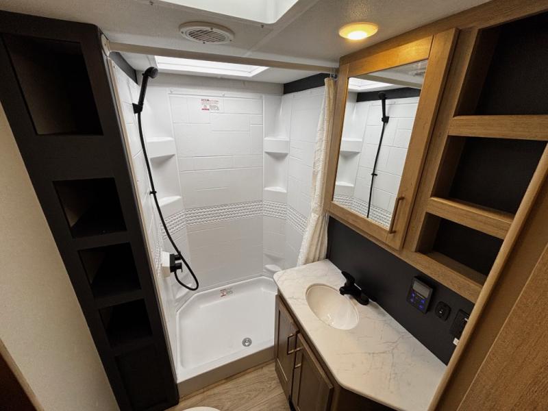 This toy hauler has an open concept to create maximum interior space when set up at the campground! The whole family will have comfortable places to sleep between the 70" x 74" king bed slide across from a wardrobe slide in the front private bedroom, and the electric queen bed above the convertible sofa. Next to the pantry and three burner range is a sofa with a flip up floor all housed in the slide. The two recliners by the entertainment center offer a comfortable place to relax after a fun day on the trails. You can also rinse the mud out of your hair in the full bathroom in the spacious bathtub with a skylight above for added natural lighting. The outdoor Griddle & Go lets you fry up some delicious fish while staying protected under the 18' electric awning. If you want even more convenience then you can add the optional ramp door patio with a rear electric awning and LED lights to create the perfect gathering spot at night!
