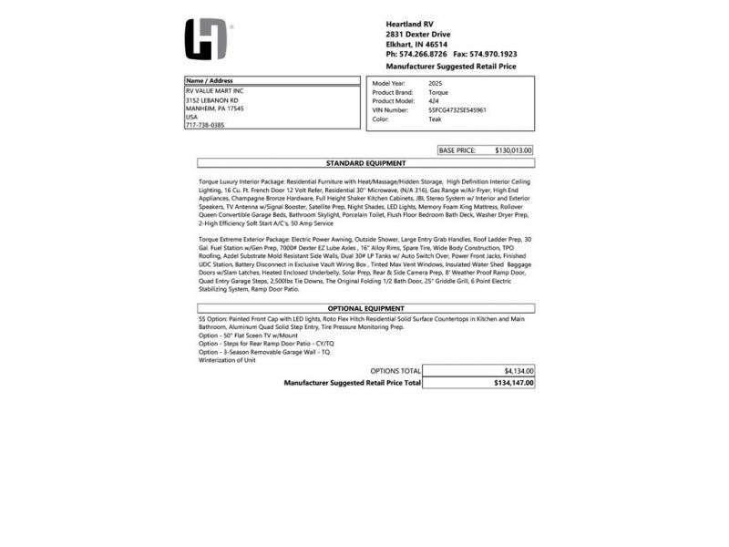 New 2025 Heartland Torque 424 Toy Hauler Fifth Wheel