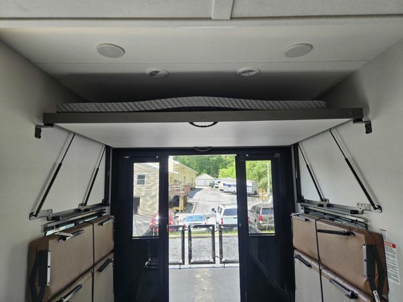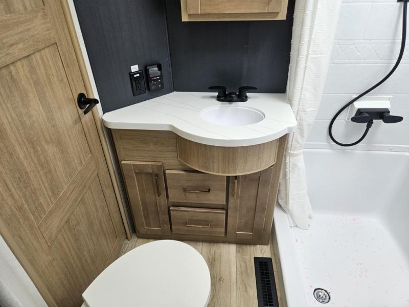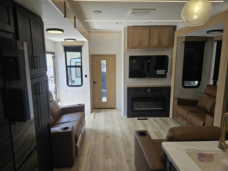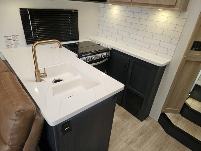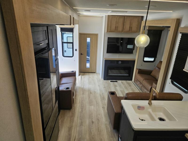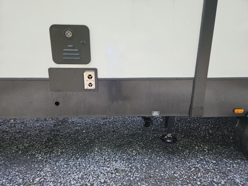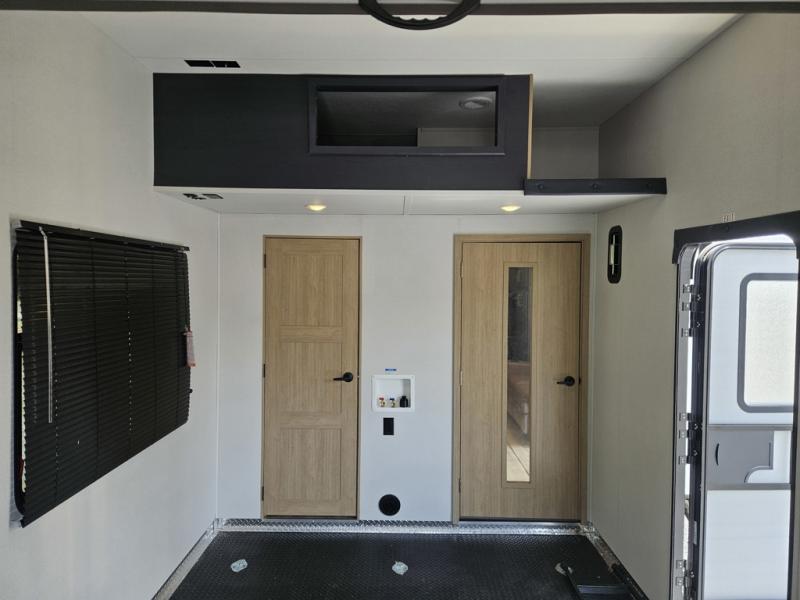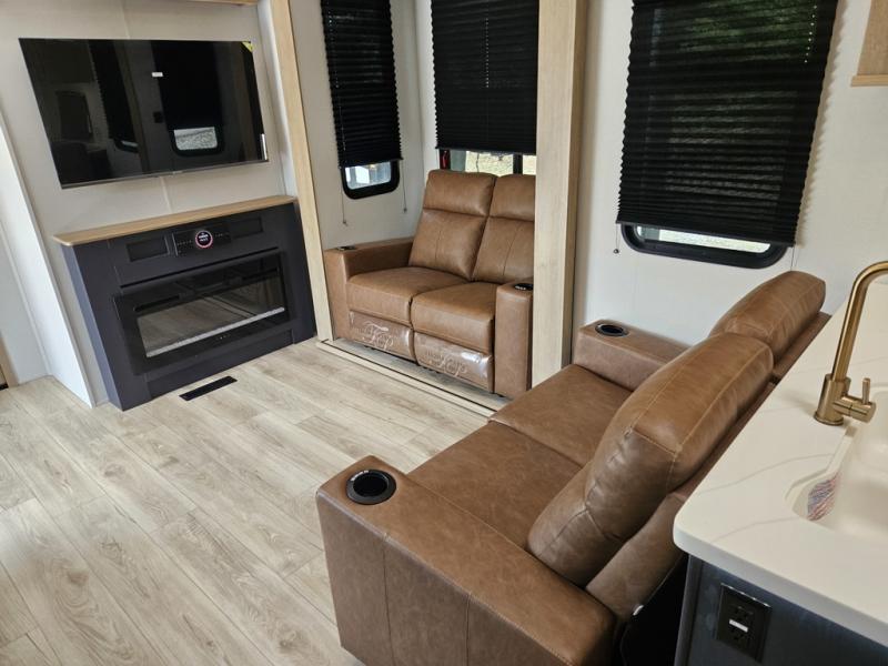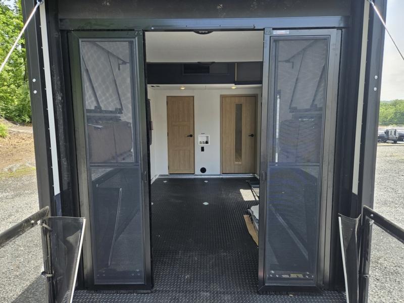 You have everything you need in this toy hauler! The 14' garage area has a half bathroom, an electric queen bed with convertible sofa below it, and one of the dual entry doors to the unit. The chef can prepare their best home cooked meals either indoors with the three burner cooktop or head to the outdoor Griddle & Go, and the outdoor sink will allow them to wash up before starting dinner. Freshen up in the dual entry bathroom with the spacious tub which has a skylight above to bring the outdoors inside and it leads directly into the front master suite which has a king bed slide and a wardrobe slide to keep your clothes looking their best!