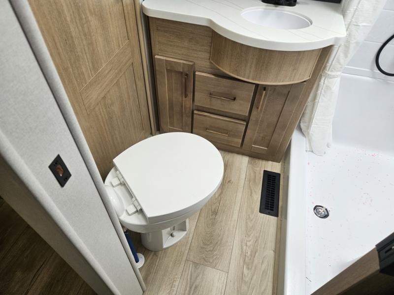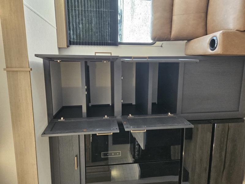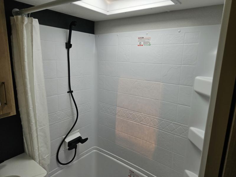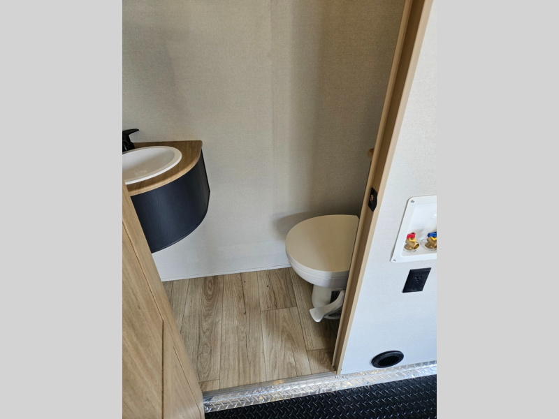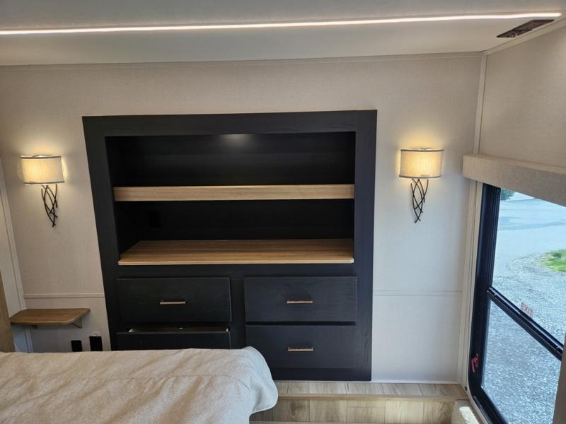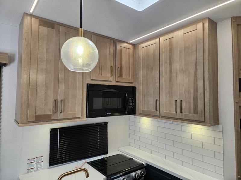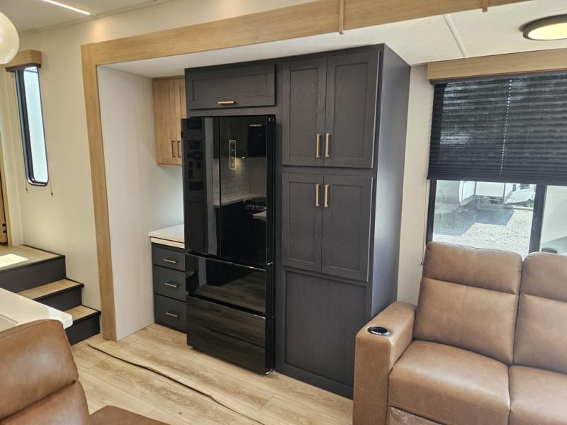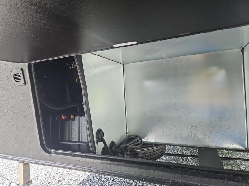 You have everything you need in this toy hauler! The 14' garage area has a half bathroom, an electric queen bed with convertible sofa below it, and one of the dual entry doors to the unit. The chef can prepare their best home cooked meals either indoors with the three burner cooktop or head to the outdoor Griddle & Go, and the outdoor sink will allow them to wash up before starting dinner. Freshen up in the dual entry bathroom with the spacious tub which has a skylight above to bring the outdoors inside and it leads directly into the front master suite which has a king bed slide and a wardrobe slide to keep your clothes looking their best!