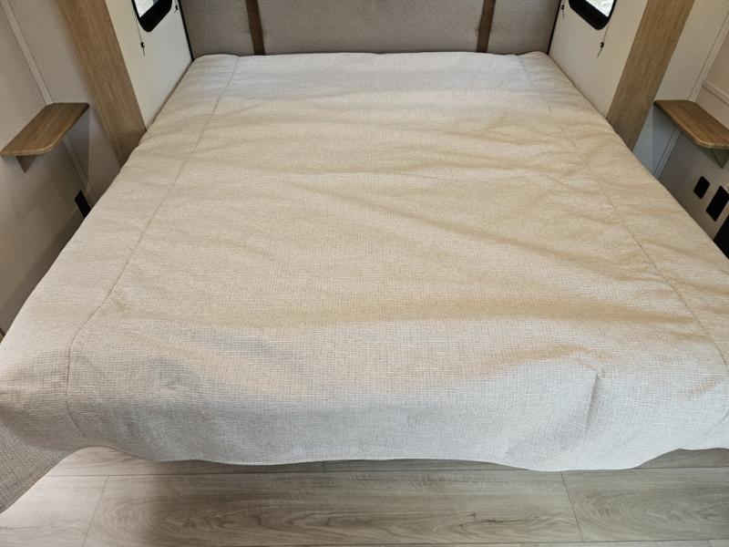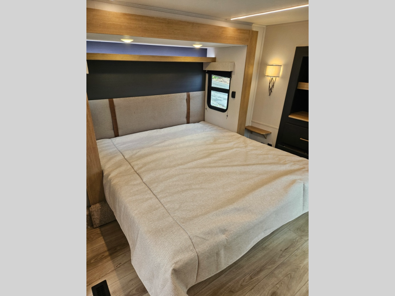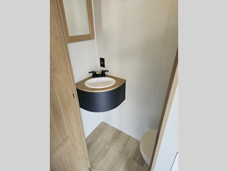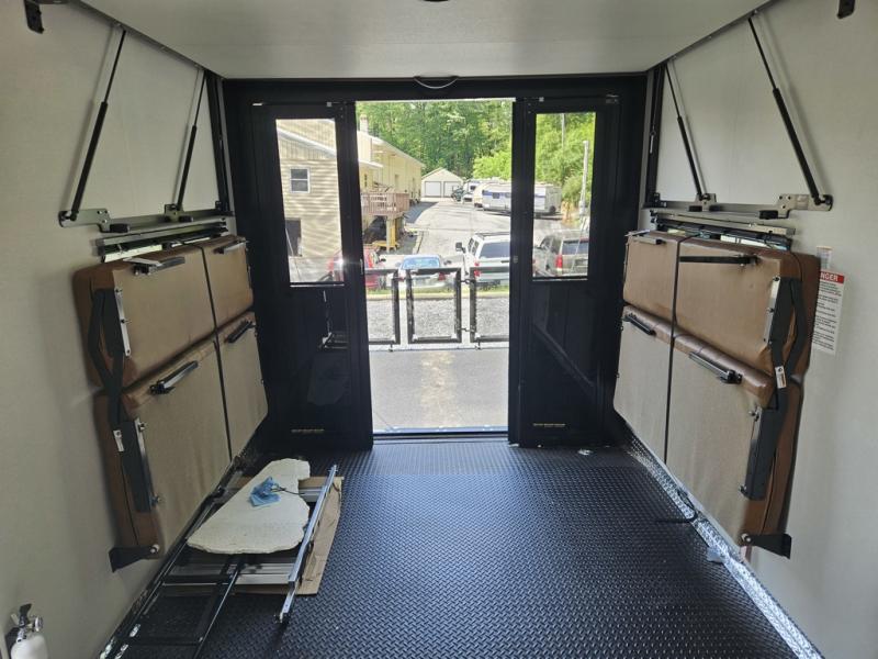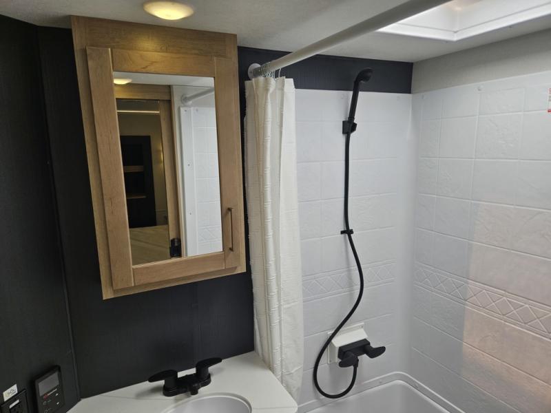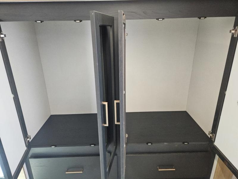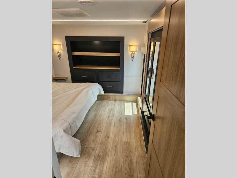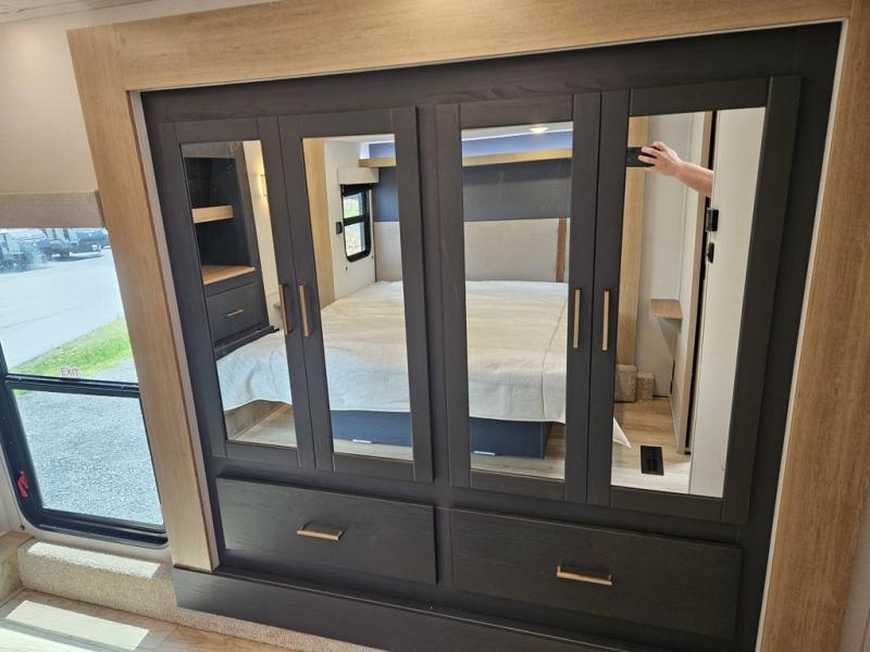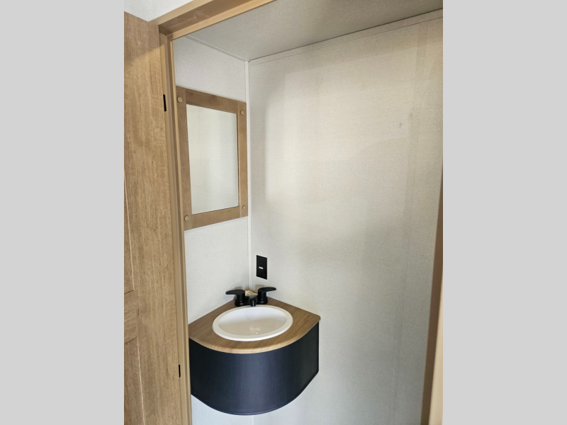 You have everything you need in this toy hauler! The 14' garage area has a half bathroom, an electric queen bed with convertible sofa below it, and one of the dual entry doors to the unit. The chef can prepare their best home cooked meals either indoors with the three burner cooktop or head to the outdoor Griddle & Go, and the outdoor sink will allow them to wash up before starting dinner. Freshen up in the dual entry bathroom with the spacious tub which has a skylight above to bring the outdoors inside and it leads directly into the front master suite which has a king bed slide and a wardrobe slide to keep your clothes looking their best!