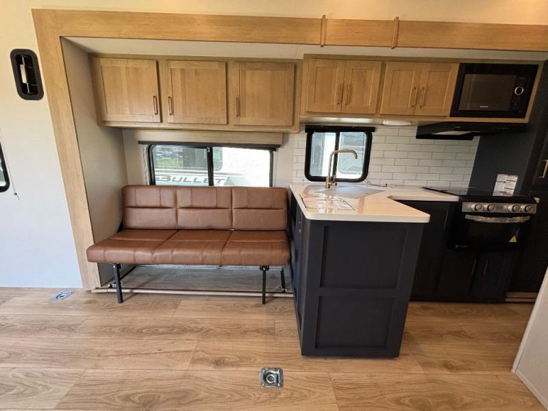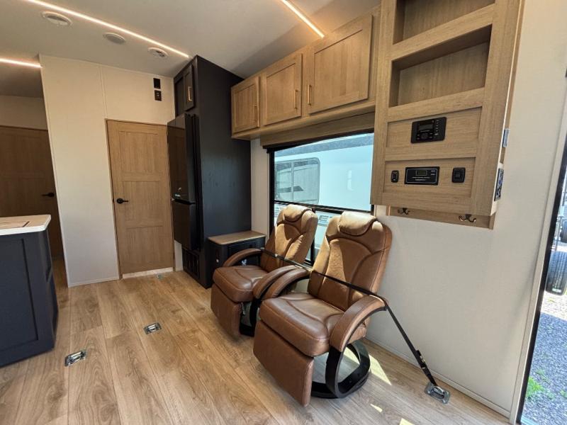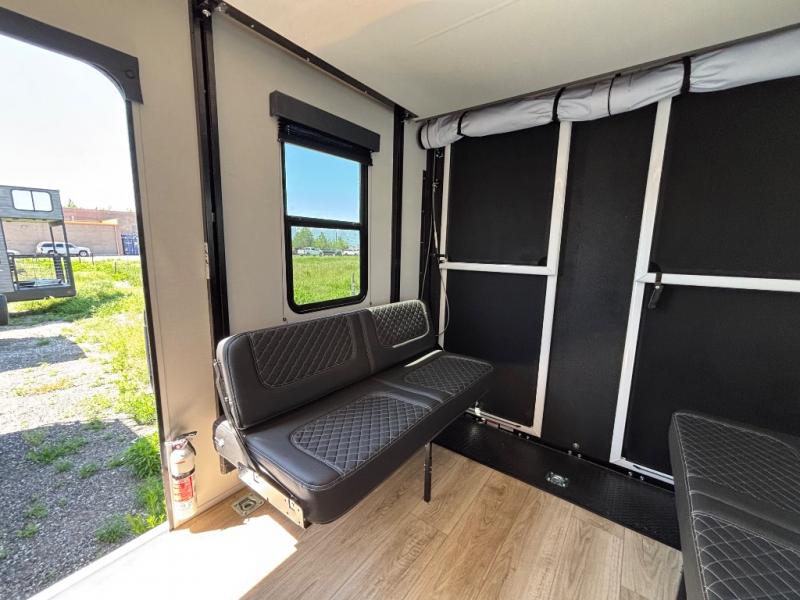 Easily load and unload your toys into the 16' garage area of this toy hauler with the 2,500 lb. ramp door! The garage also has a power queen bed above a sofa with a dinette, two recliners, and another sofa for a relaxing evening. Keep your perishables fresh in the 10.7 cu. ft. refrigerator, fry some bacon on the three burner cooktop, and easily clean up with the deep basin undermount sink with high rise pull-out faucet. The dual entry bathroom has a radius shower with a skylight above to bring the outdoors inside, and leads directly into the front master suite which has a king bed to enjoy a good night's rest and one of the dual entry doors to the unit so you can sneak out for an early morning fishing trip!