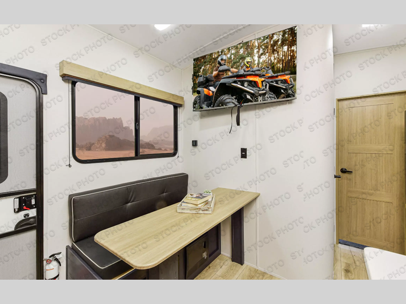 Bring the whole gang with you and your off-road toys in this toy hauler with a 13' garage area! Once your toys are unloaded, you can set up the power queen bed above the sofa with a dinette, plus there is one of the dual entry doors to the unit. You can prepare home cooked meals with the three burner cooktop and then eat them either in the garage dinette or the one sided booth dinette seating with a table across from the kitchen. After dinner, let your stomach settle on either the sofa or the theater seating then freshen up in the dual entry bathroom with the shower that has a skylight above it for added natural lighting. Enjoy a good night's rest each night on the king bed in the front private bedroom!