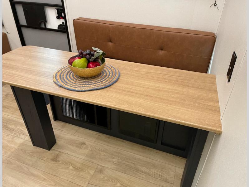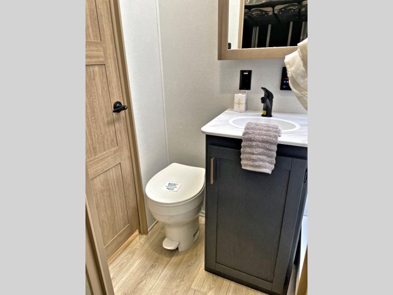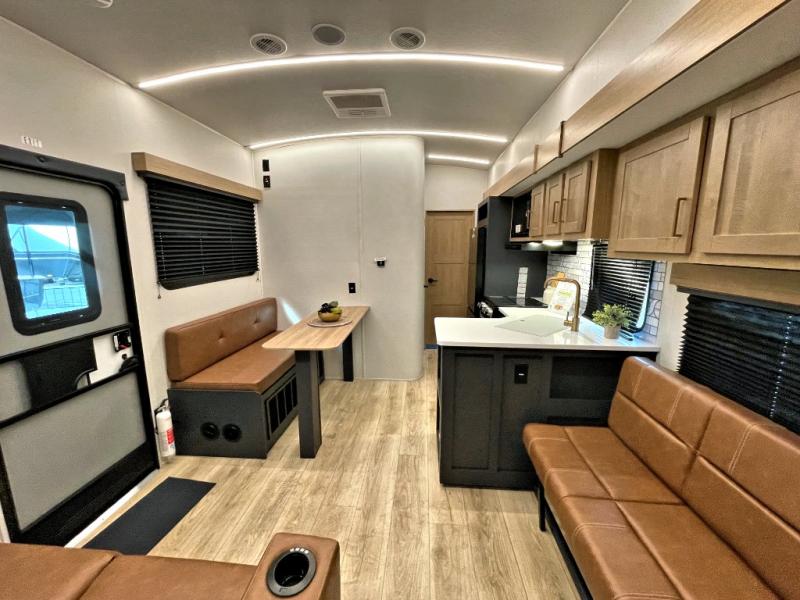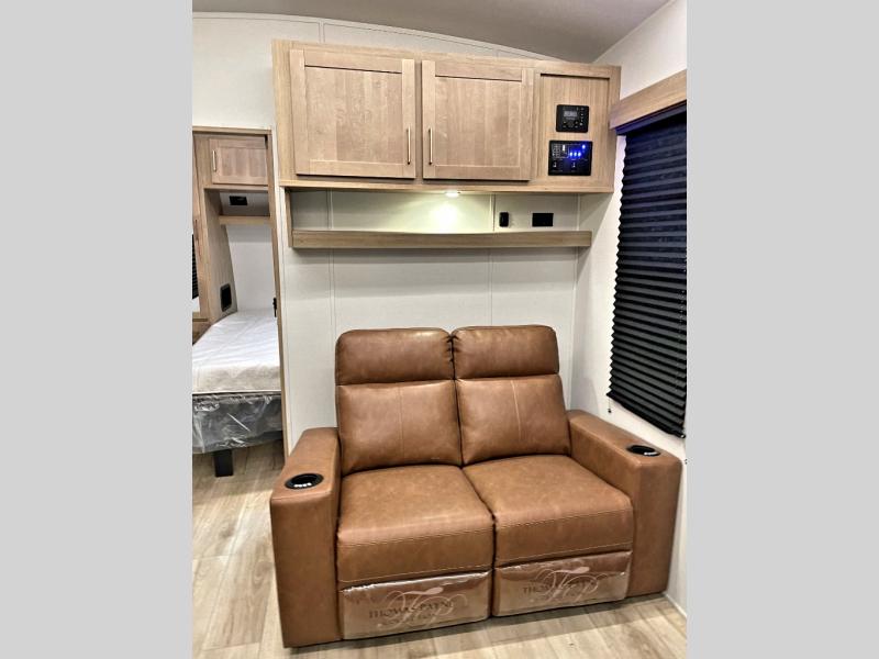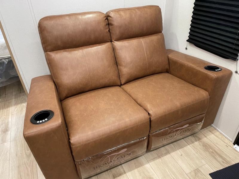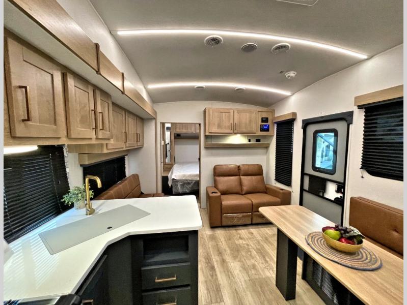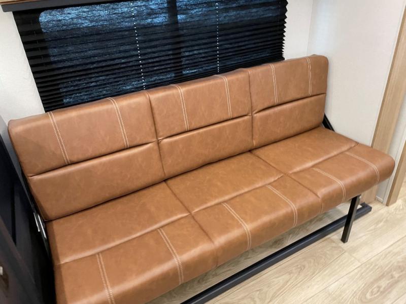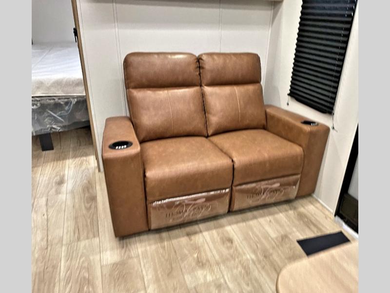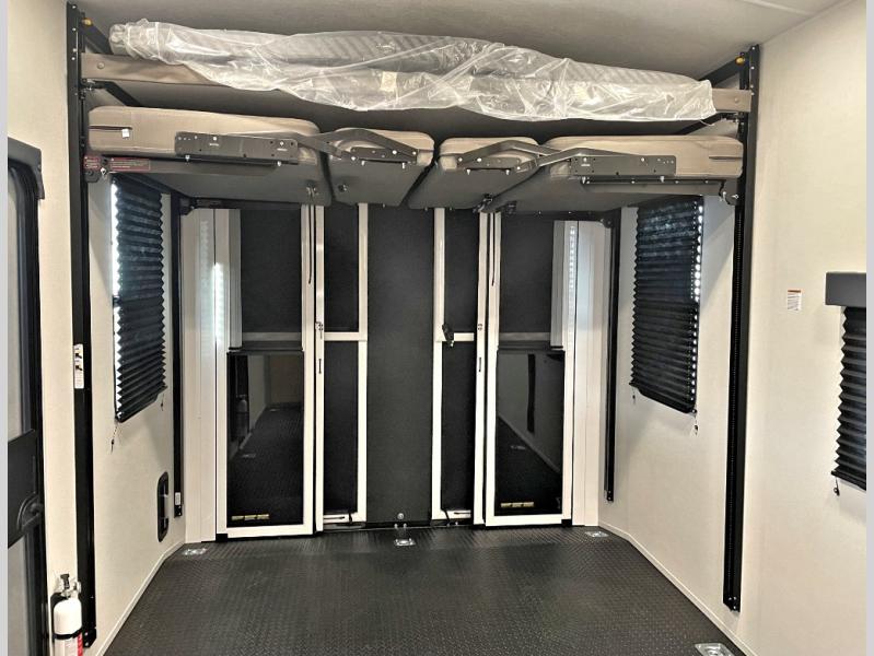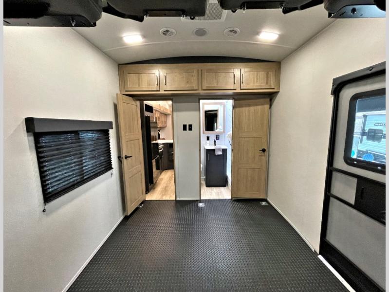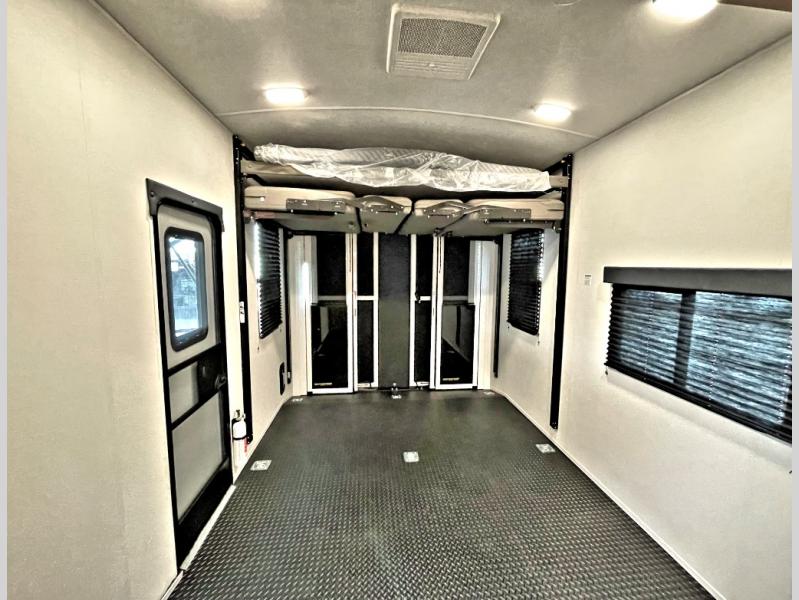 Bring the whole gang with you and your off-road toys in this toy hauler with a 13' garage area! Once your toys are unloaded, you can set up the power queen bed above the sofa with a dinette, plus there is one of the dual entry doors to the unit. You can prepare home cooked meals with the three burner cooktop and then eat them either in the garage dinette or the one sided booth dinette seating with a table across from the kitchen. After dinner, let your stomach settle on either the sofa or the theater seating then freshen up in the dual entry bathroom with the shower that has a skylight above it for added natural lighting. Enjoy a good night's rest each night on the king bed in the front private bedroom!