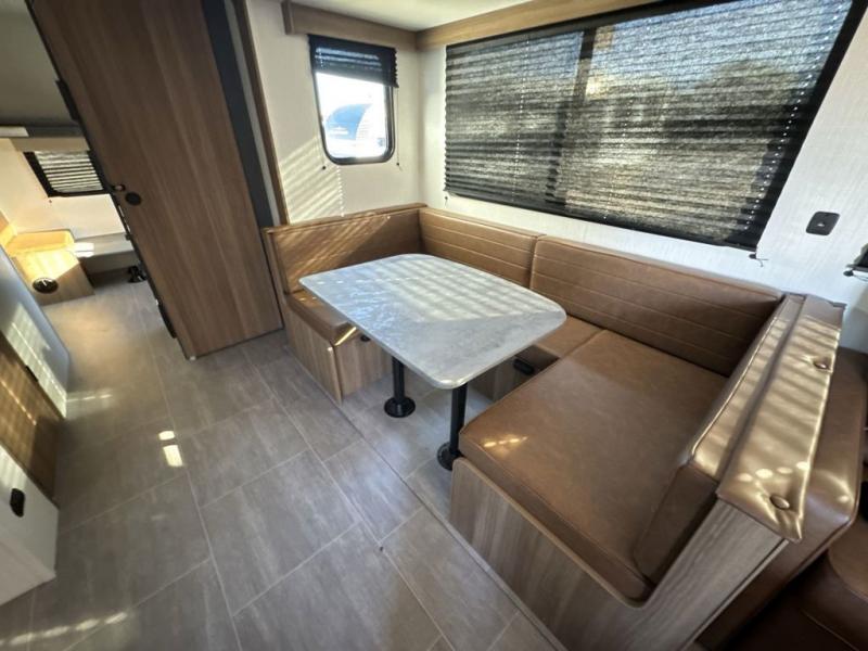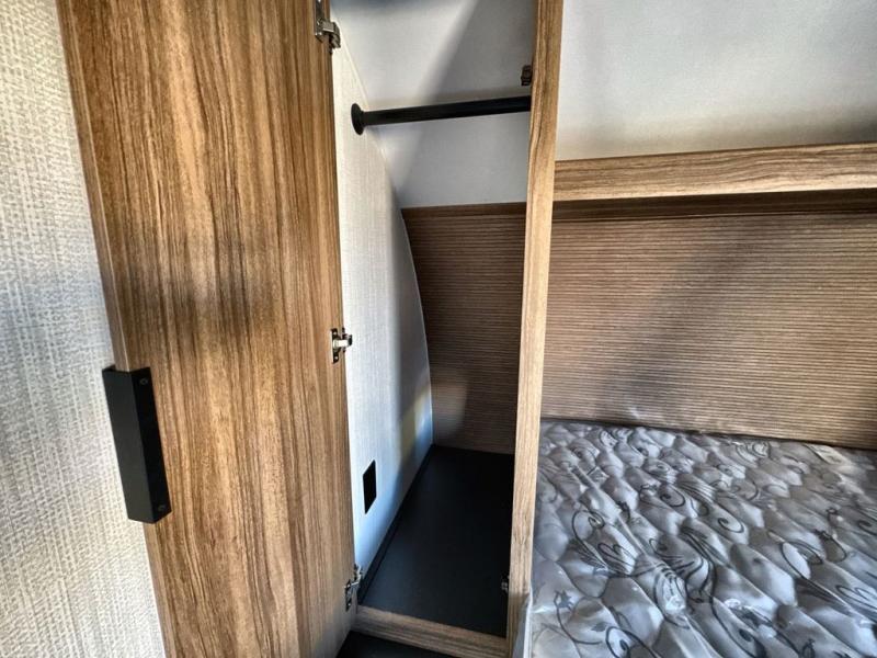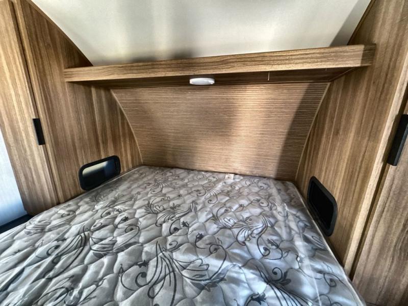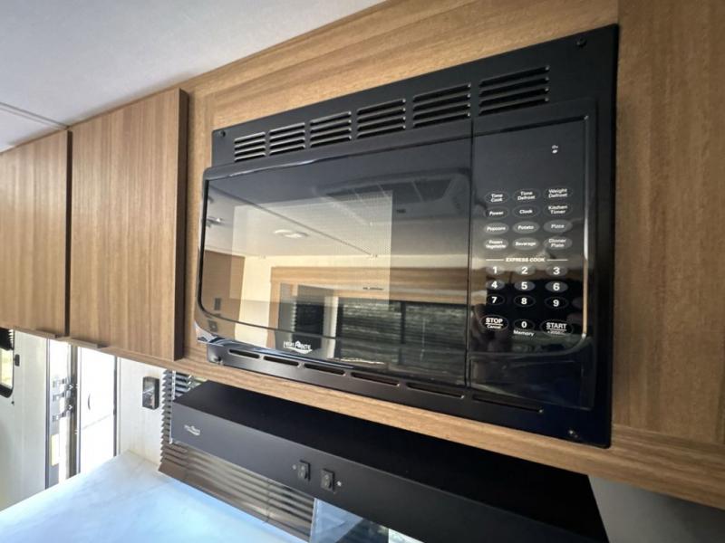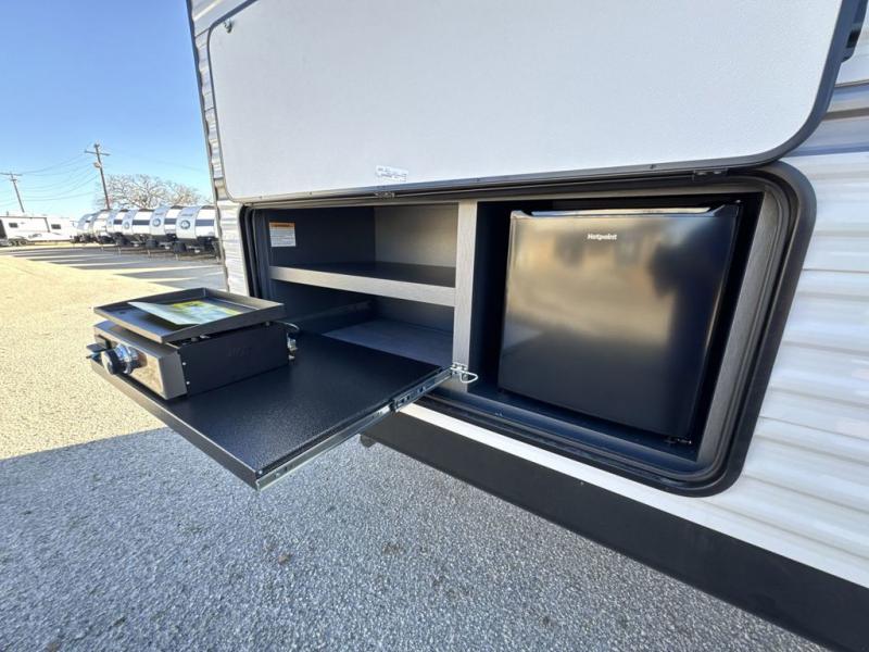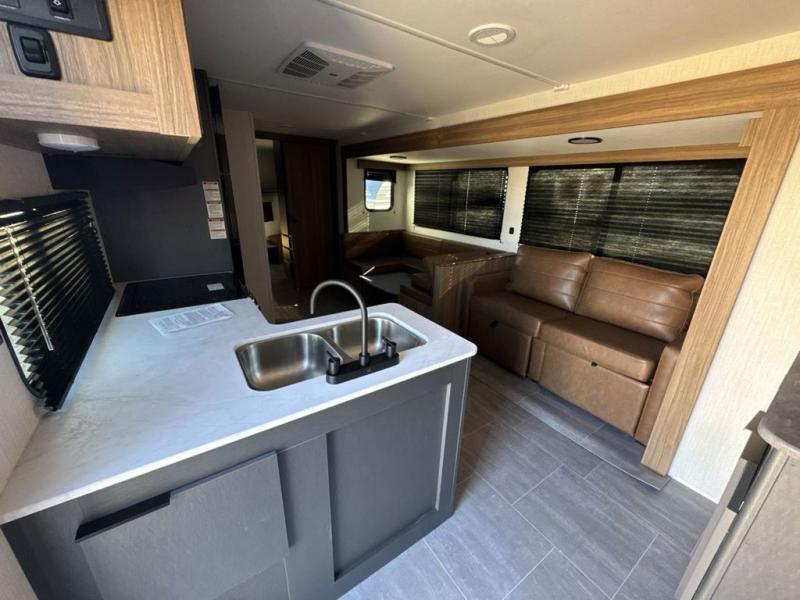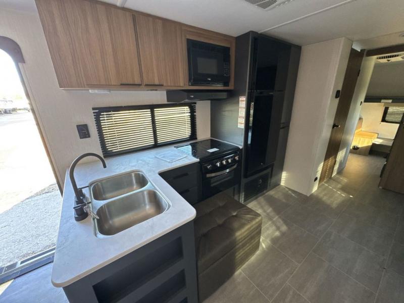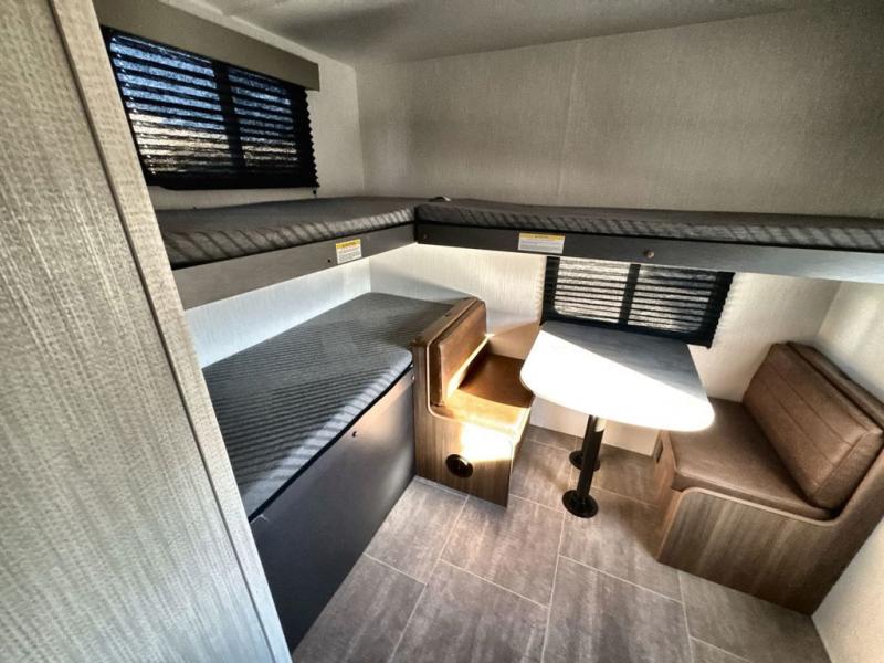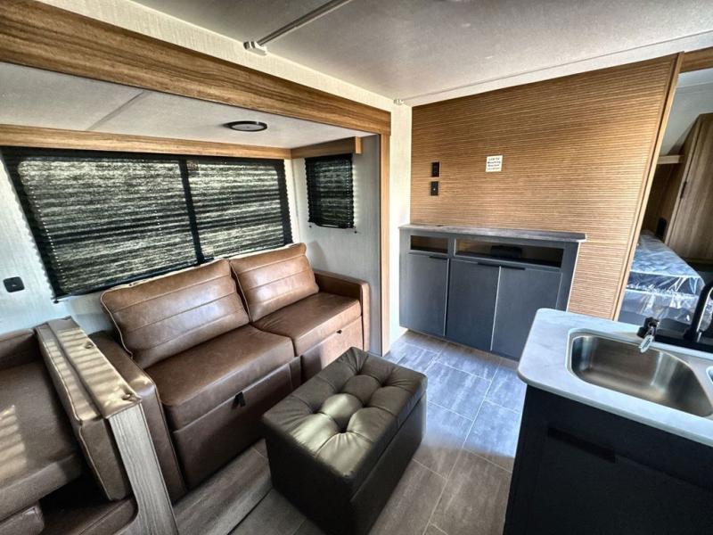 The whole family will have everything they need for a comfortable camping trip in this travel trailer! There is a rear private bunkhouse with a flip-up bunk above a dinette and an additional bunk bed. Enjoy your own privacy with the front private bedroom which has a queen bed with under-bed storage and wireless cell charging stations for one less thing to bring with you. Prepare your best home cooked meals either indoors with the three burner cooktop or head to the great outdoors to use the outside kitchen with a griddle. Everyone can gather together for meals at the U-shaped dinette then relax on the sofa.