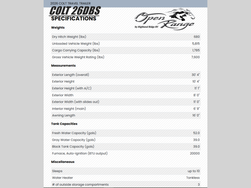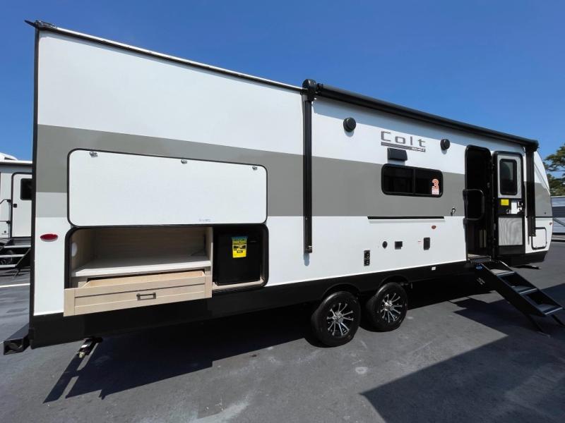 Upgrade from tent camping and experience more comfort with the new Colt Travel Trailer Series, our most budget-friendly RV lineup. Available in single or double axle, standard or CTR Edition, the Colt offers 15 versatile floorplans designed to fit your lifestyle. Inside, you’ll enjoy residential-style features like solid countertops, hidden-hinge cabinetry, a high-rise kitchen faucet, and a 12V refrigerator. The main sleeping area includes a standard queen mattress for home-like comfort, while the bathroom is equipped with a marine-grade foot-flush toilet, tub/shower surround, skylight, vent, and an on-demand tankless water heater that delivers long hot showers. Durable swing-down solid steps provide a sturdy entry every time, giving you confidence with each adventure. Perfect for first-time RVers or anyone seeking an affordable, lightweight upgrade, the Colt Travel Trailer makes camping easy, comfortable, and accessible.