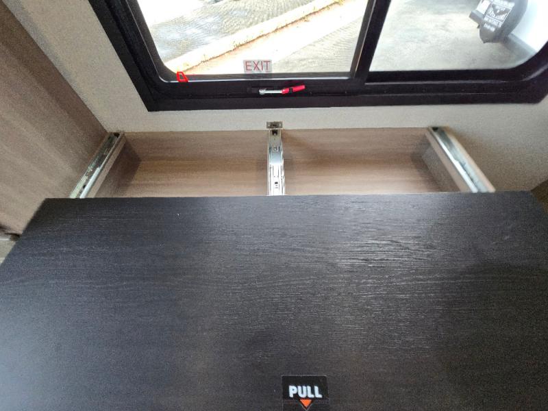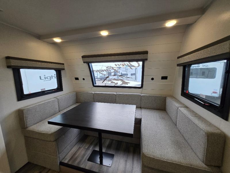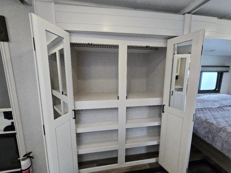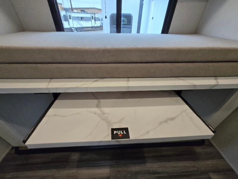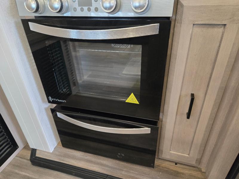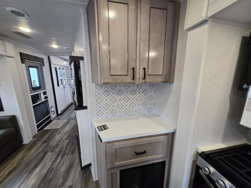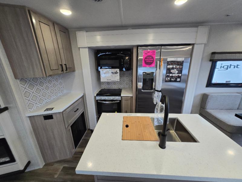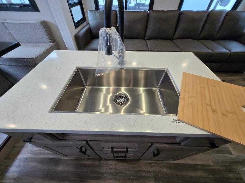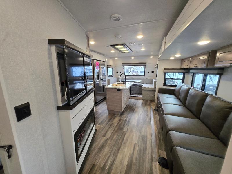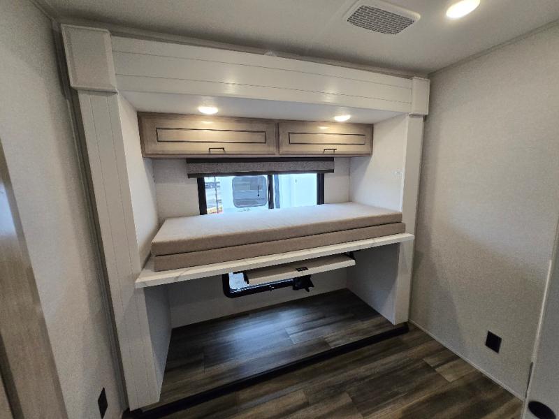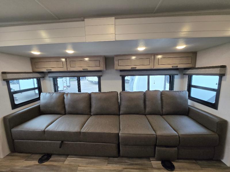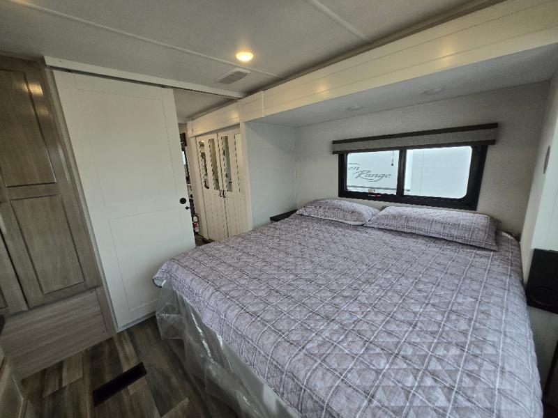 This Open Range travel trailer offers fantastic flexibility! The private rear bedroom with queen bed and king bed option is a lovely retreat, while your guests or children enjoy the middle room with a 28" x 74" bunk along with a desk. The common living area is an open space with a mega lounge with two pedestal tables, plus a U-dinette for even more seating! The frameless windows provide the perfect view! A full bath is easily accessible, and the kitchen offers a full suite of appliances plus an island for convenient work space. Outside is a second kitchen with fridge and pull-out griddle for even more fun!