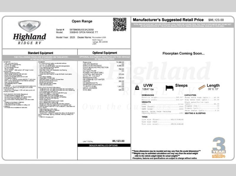 Brand New 2025 Highland Ridge Open Range travel trailer 338BHS highlights: