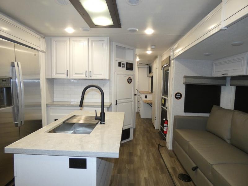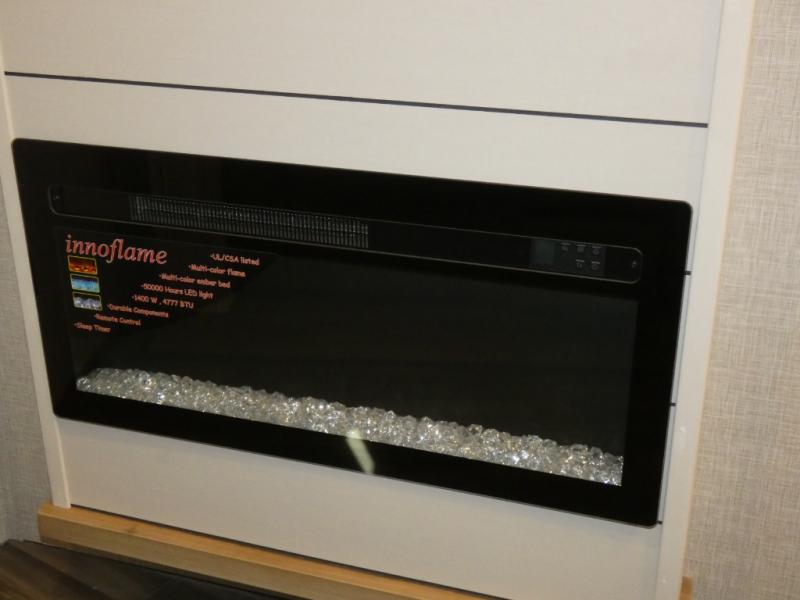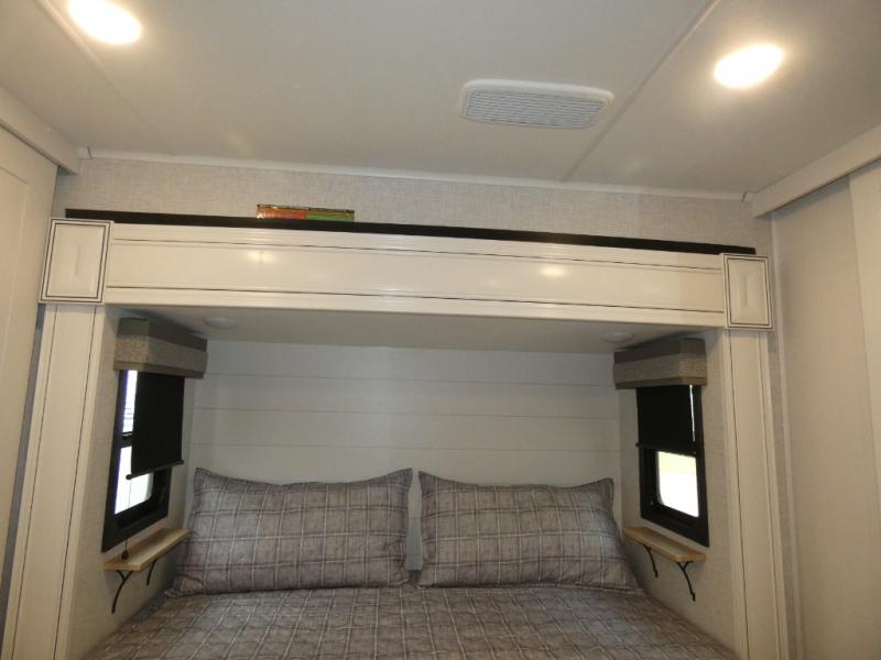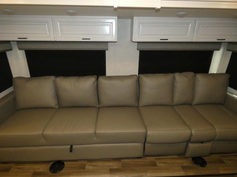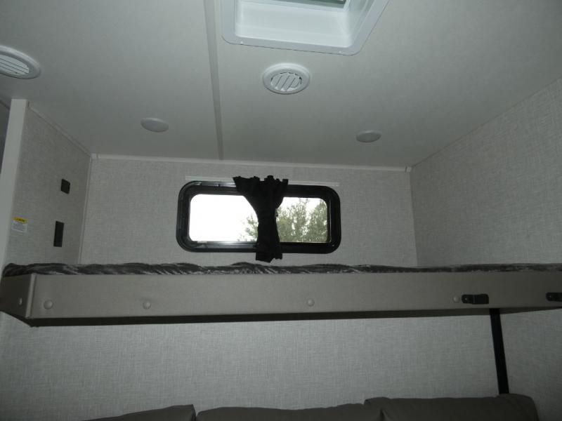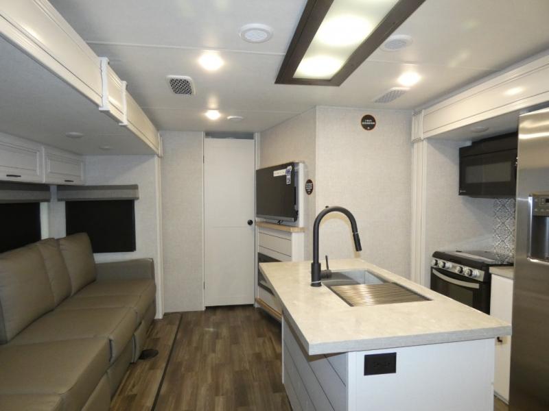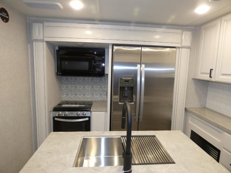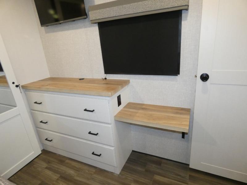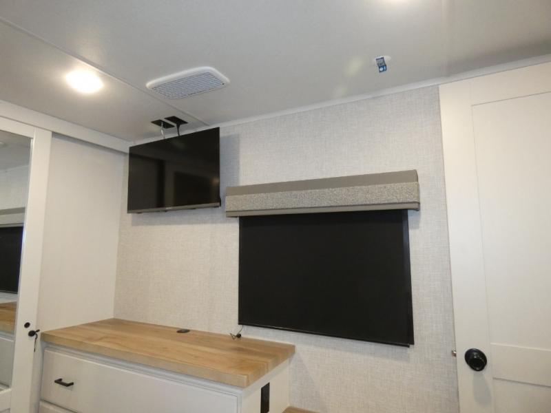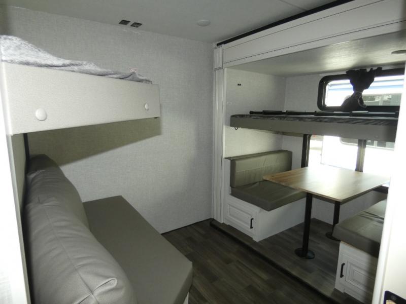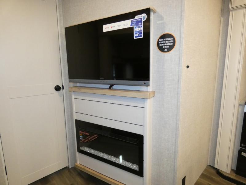 Spacious, comfortable and convenient are a few adjectives you might use when camping or even living in this trailer. The four slides throughout offer more floor space in each room from the master bedroom with a king bed slide out, and the main living and kitchen area with dual opposing slides to the bunkhouse slide. The bedroom also offers a mirrored wardrobe, a prepped space for a washer/dryer option, a dresser with a window above and easy access to the double entry full bath. The rear bunkhouse gives you two bunks, a dinette, bench seating, a hutch plus a half bath for your kids or your friends. And the main area provides a mega lounge with two tables to watch the 50" Smart HDTV with a fireplace below.