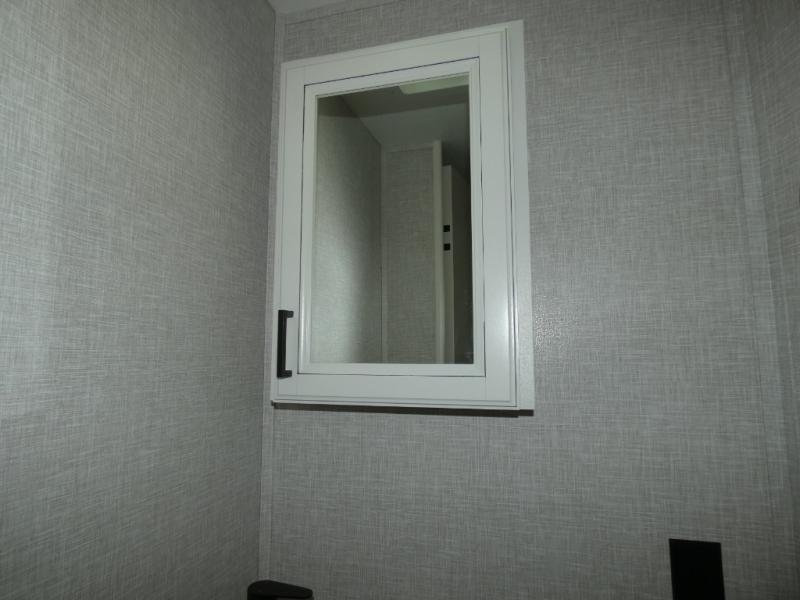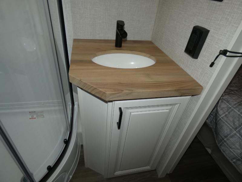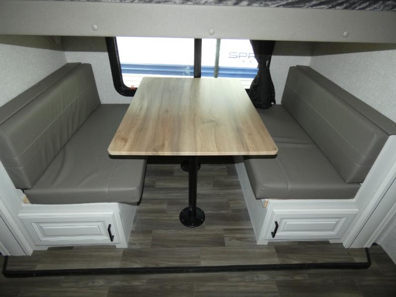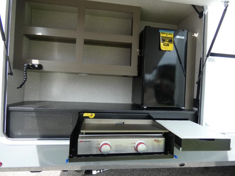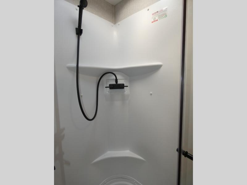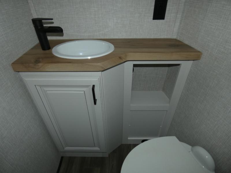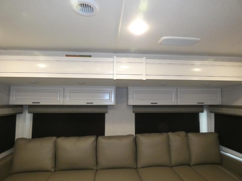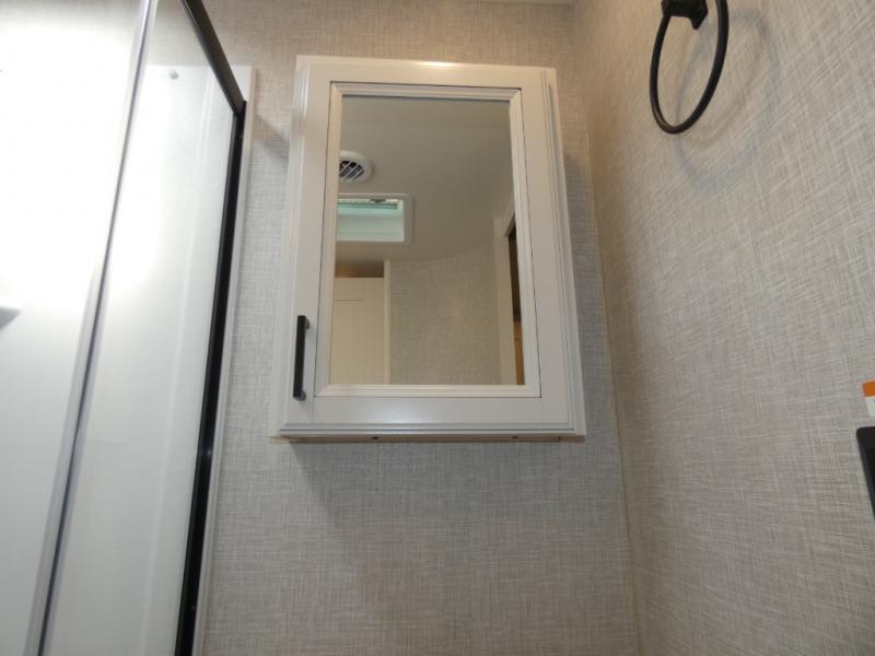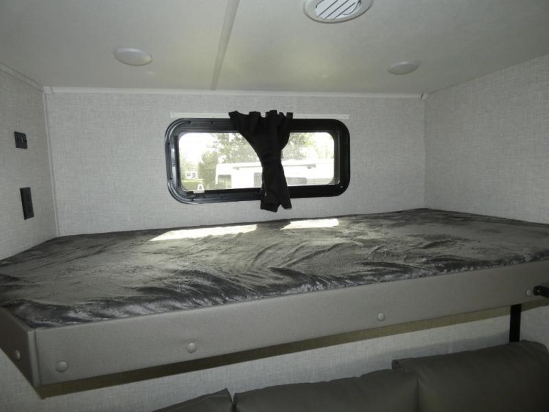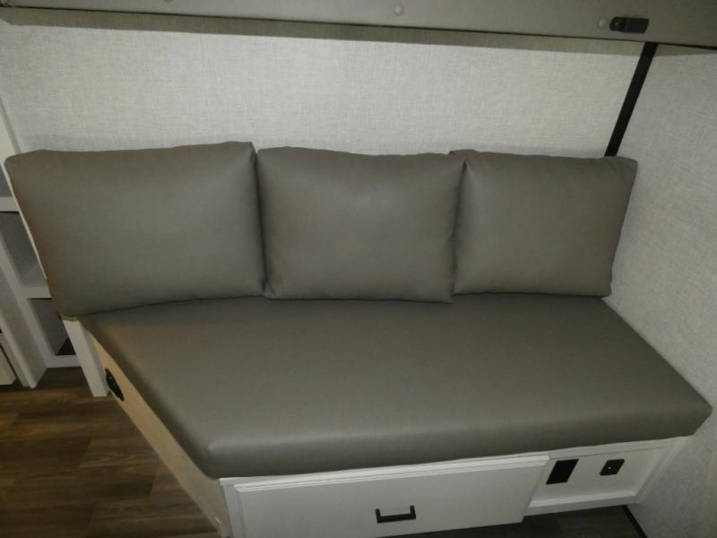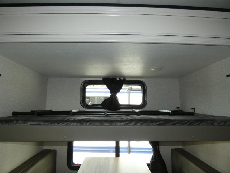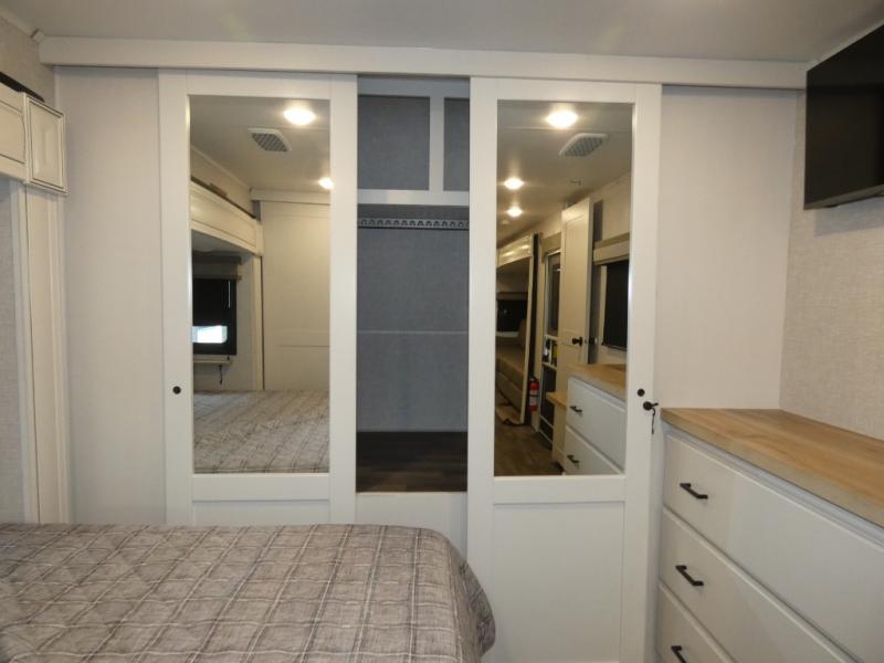 Spacious, comfortable and convenient are a few adjectives you might use when camping or even living in this trailer. The four slides throughout offer more floor space in each room from the master bedroom with a king bed slide out, and the main living and kitchen area with dual opposing slides to the bunkhouse slide. The bedroom also offers a mirrored wardrobe, a prepped space for a washer/dryer option, a dresser with a window above and easy access to the double entry full bath. The rear bunkhouse gives you two bunks, a dinette, bench seating, a hutch plus a half bath for your kids or your friends. And the main area provides a mega lounge with two tables to watch the 50" Smart HDTV with a fireplace below.